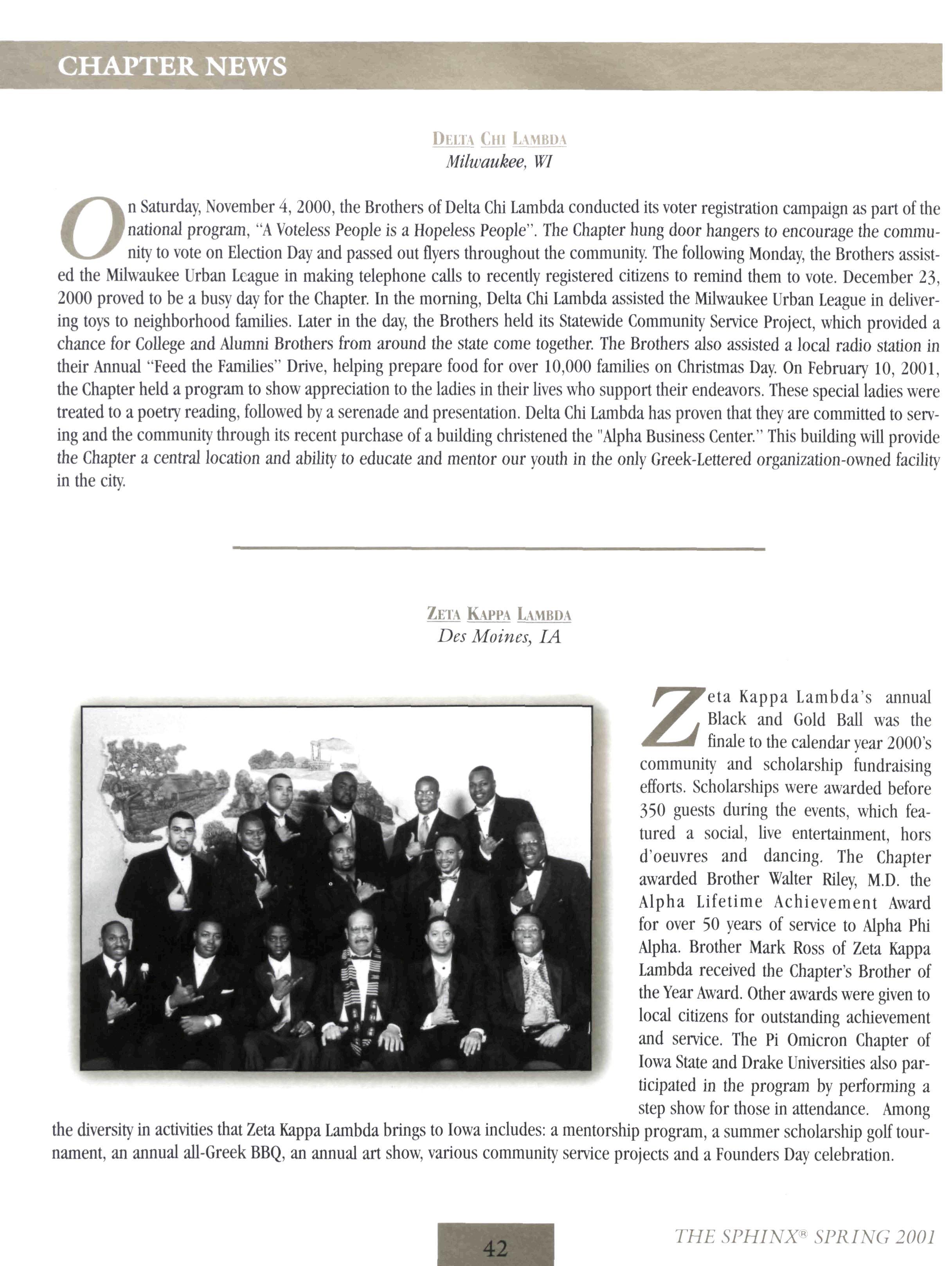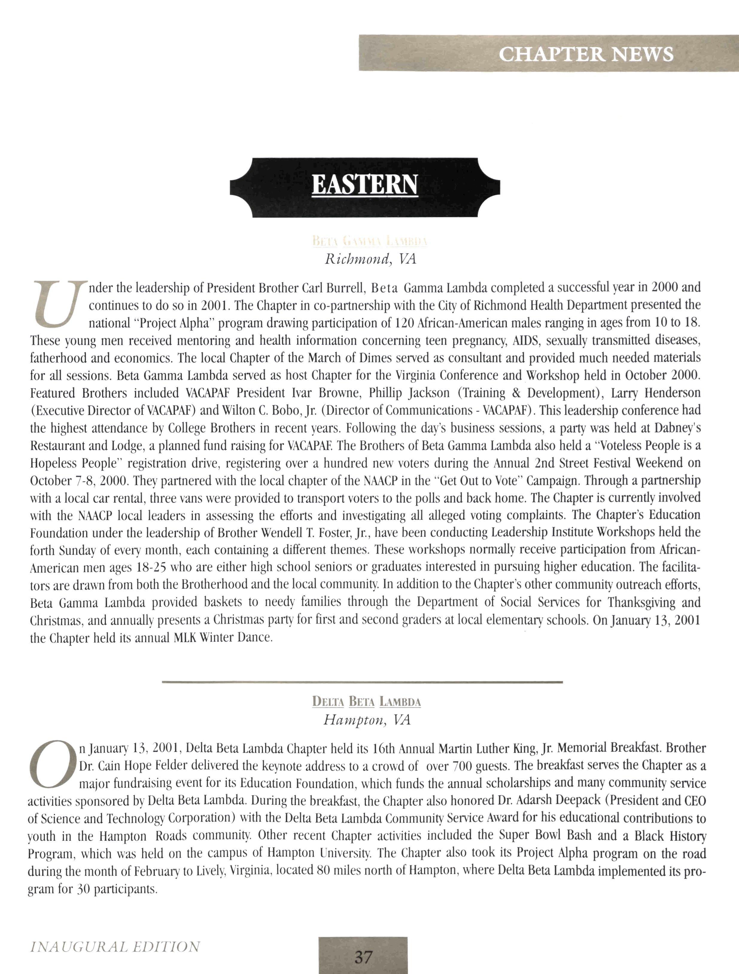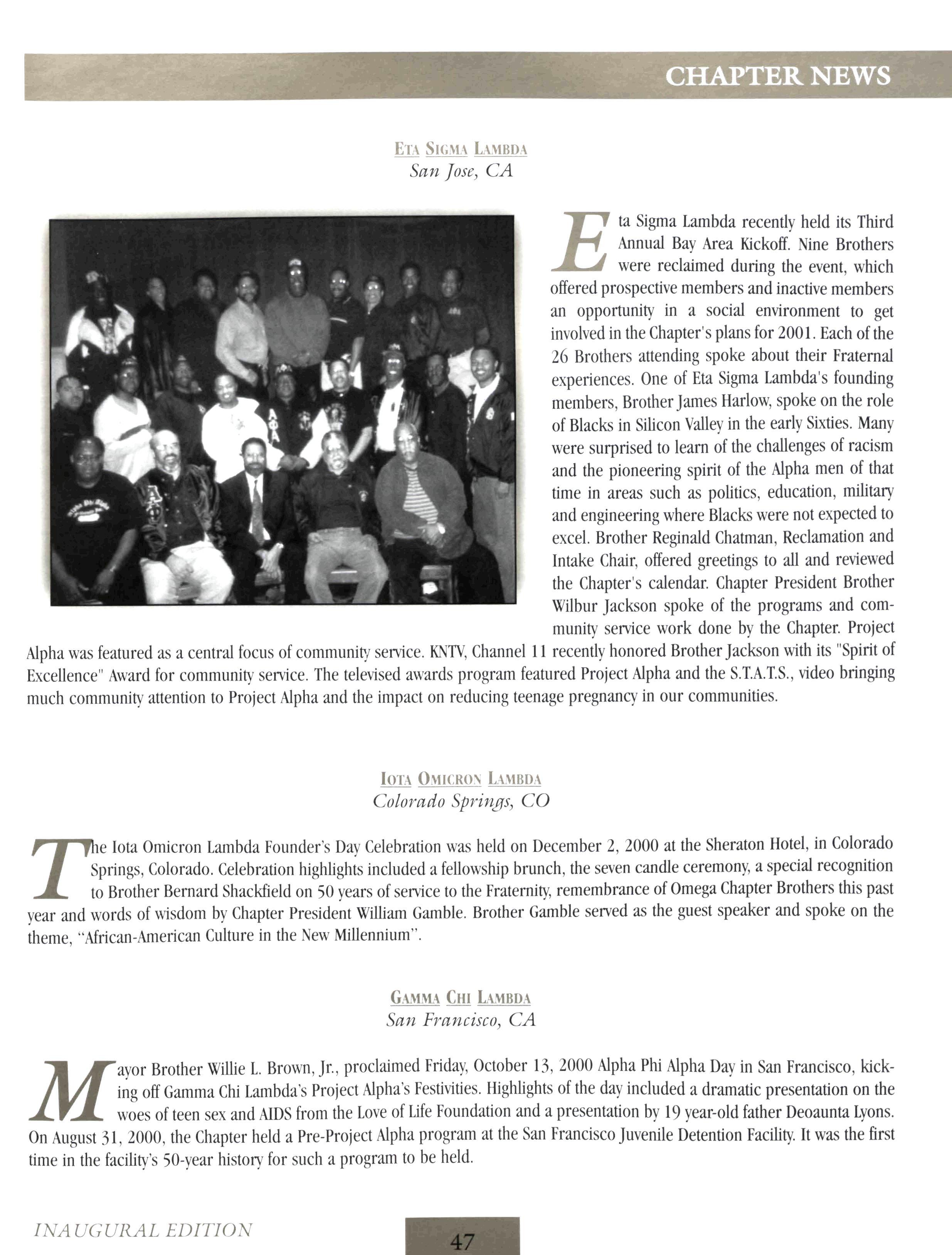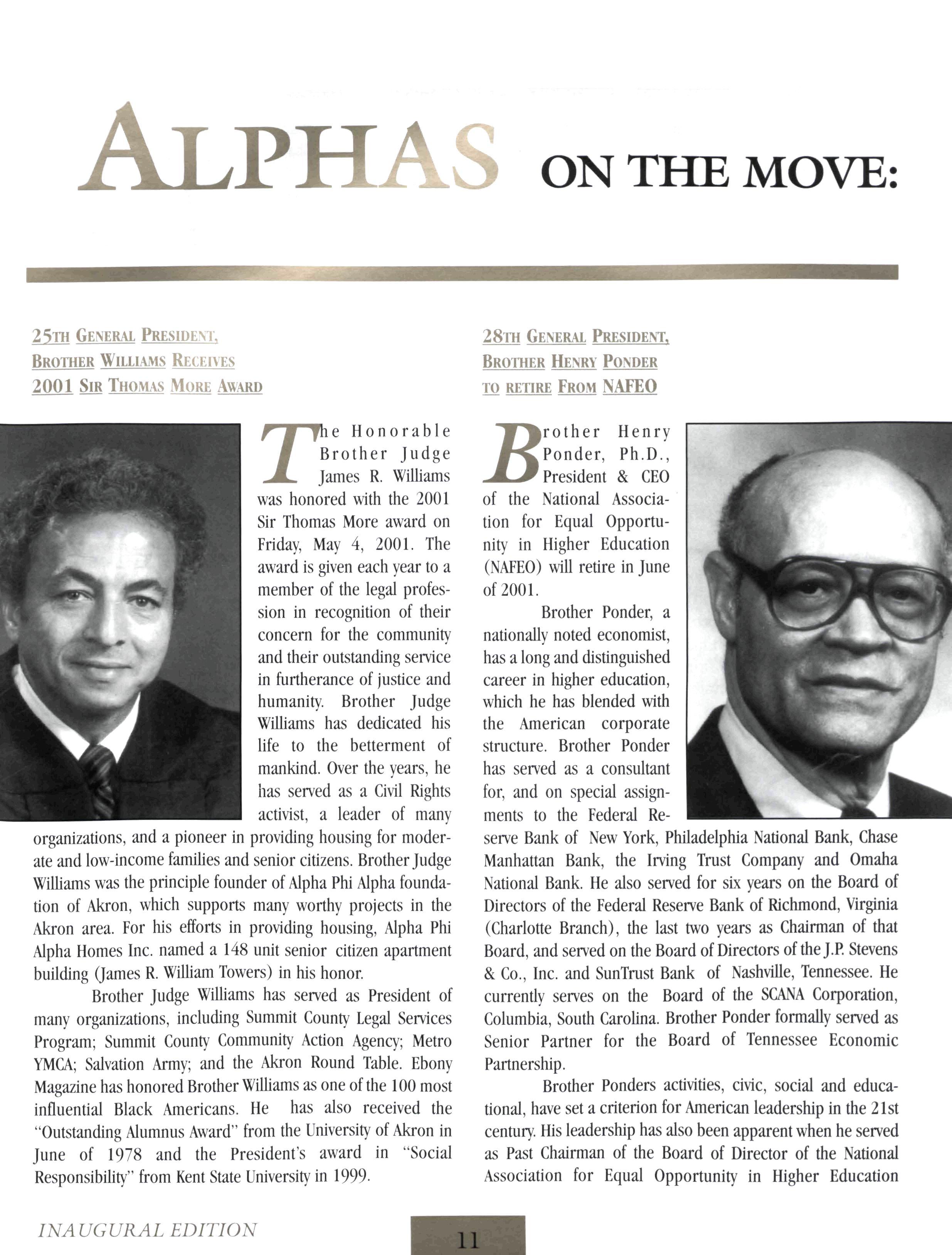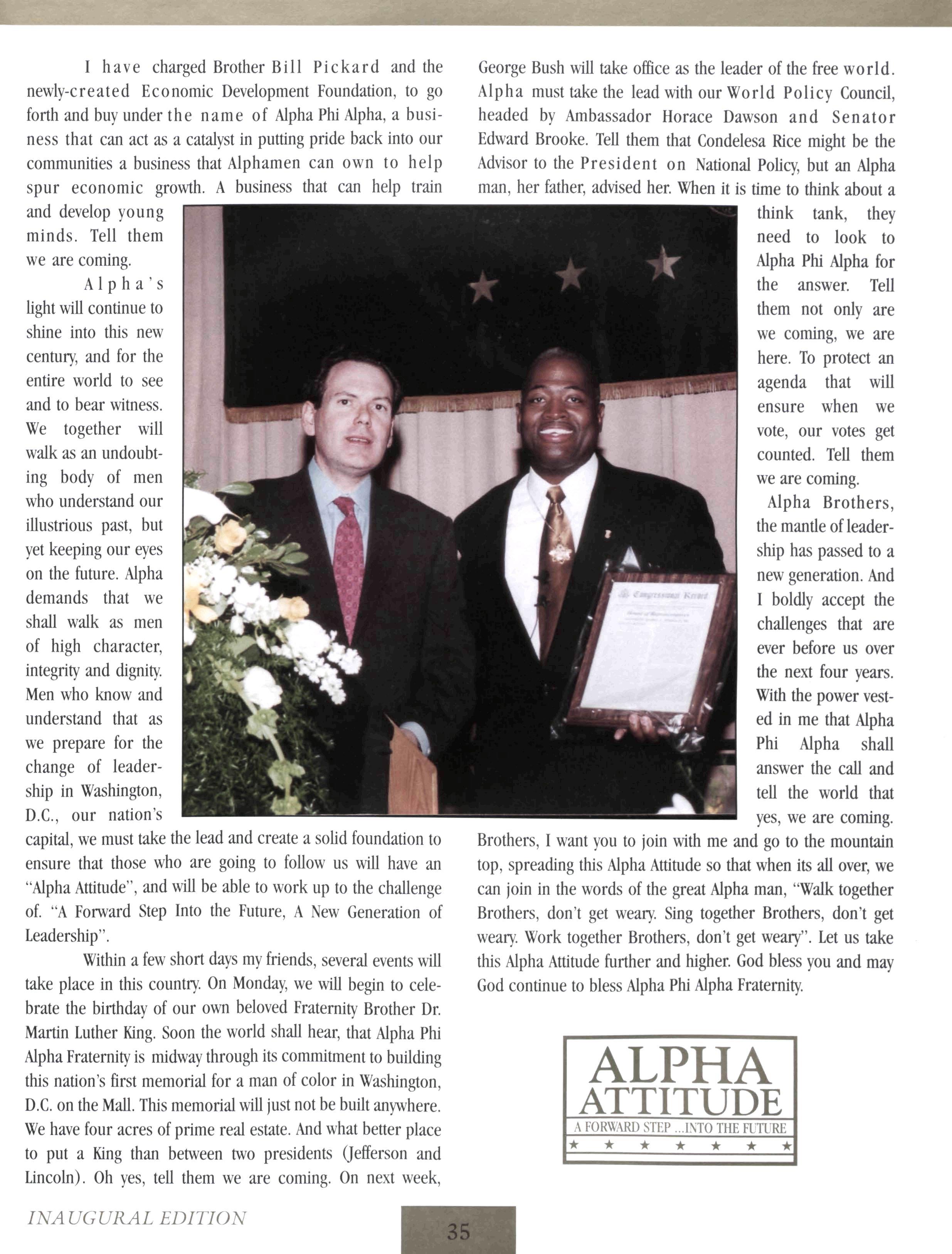 MyBrothers, we must also be committed to rebuilding the ranks of our active membership by reclaiming our inactive Brothers. AsGeneral President of Alpha, I call on every active member of this great organization to join with me in lifting this Fraternity and investing in our future. Let's bring our Brothers back home! As a part of our aggressive Reclamation Initiative, wewill initiate the "Arrive with Five" Program, where each active Brother will work to reclaim five (5) Inactive Brothers, each Fraternal Year, who have, over die course of time, left the fold We will also offer all Chapters in Alpha Phi Alpha significant savings and financial incentives for reclaiming an inactive Brother. Additionally, with the institution of the new Value Added Services Guide, our membership benefits program and the Charles Henry Chapman Reclamation Award, our goal of reclaiming 1,000 inactive Brothers in theyear 2001, is just beyond the horizon. Ifwework together as a collective Brotherhood, the 21st century shall be for us "the age of wisdom and season of light", a friend to Alpha Phi Alpha!