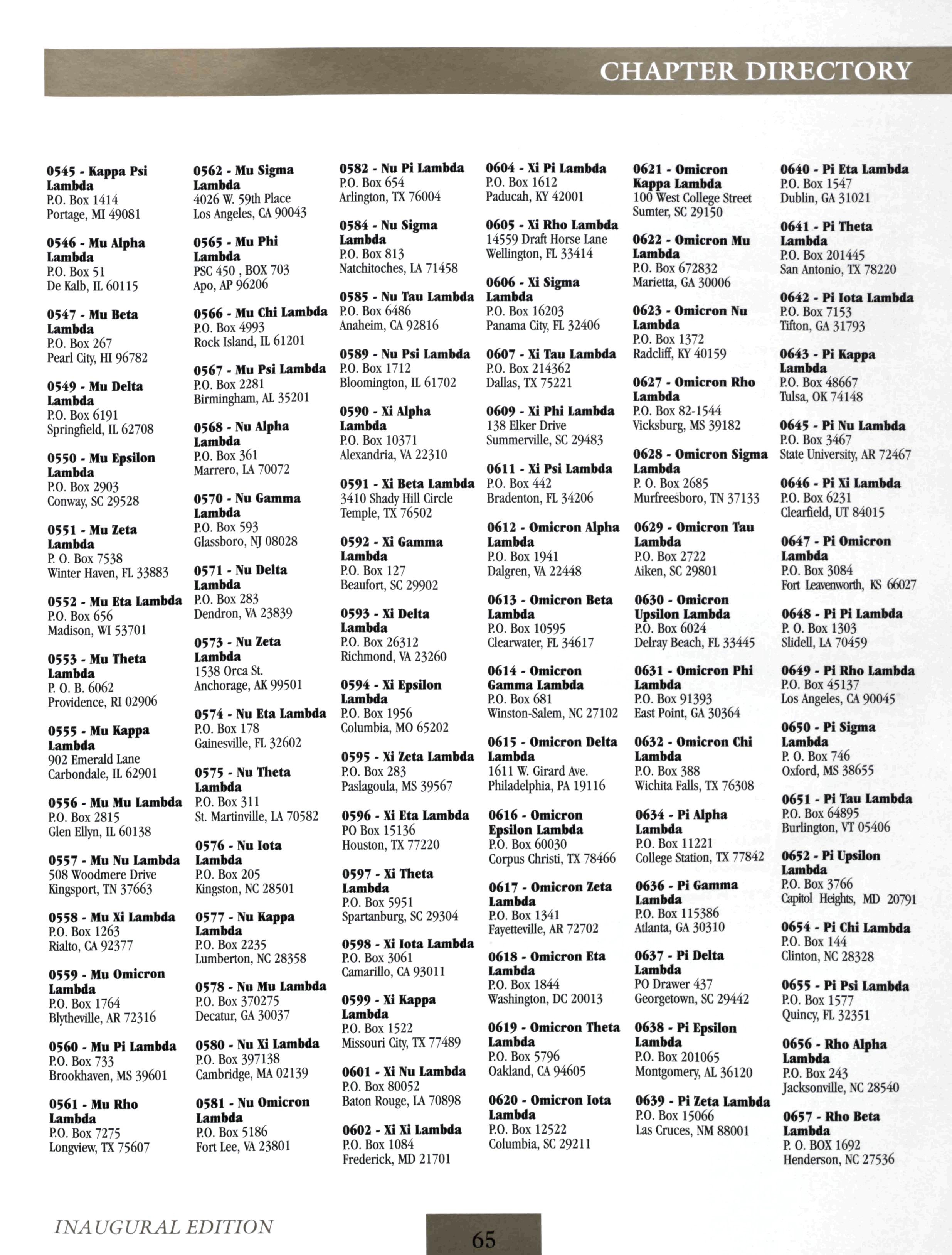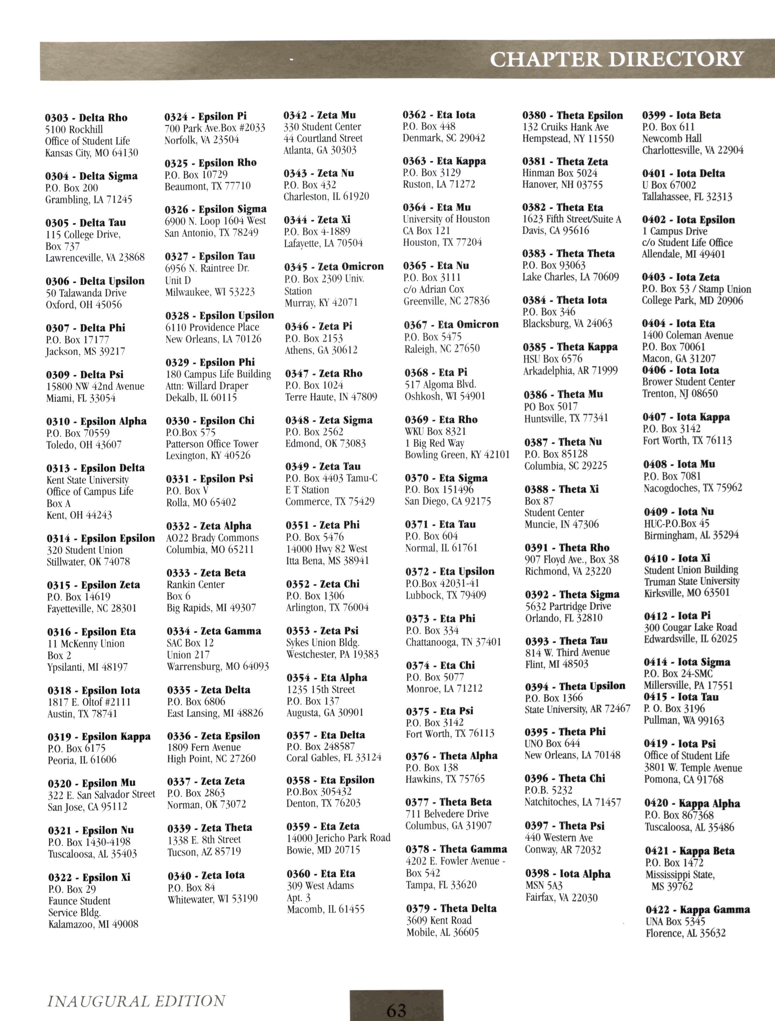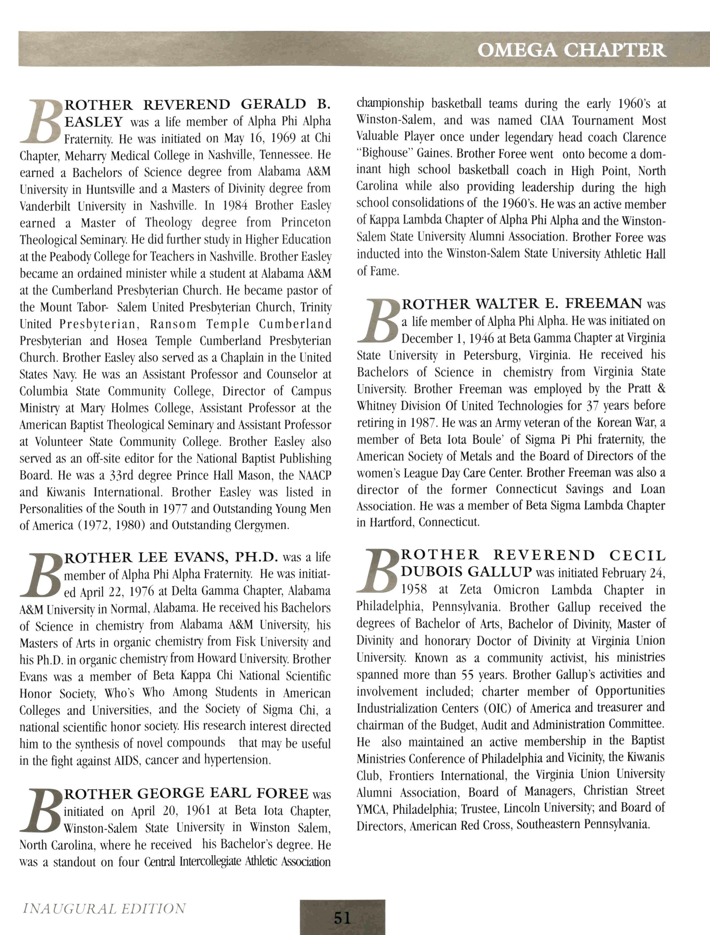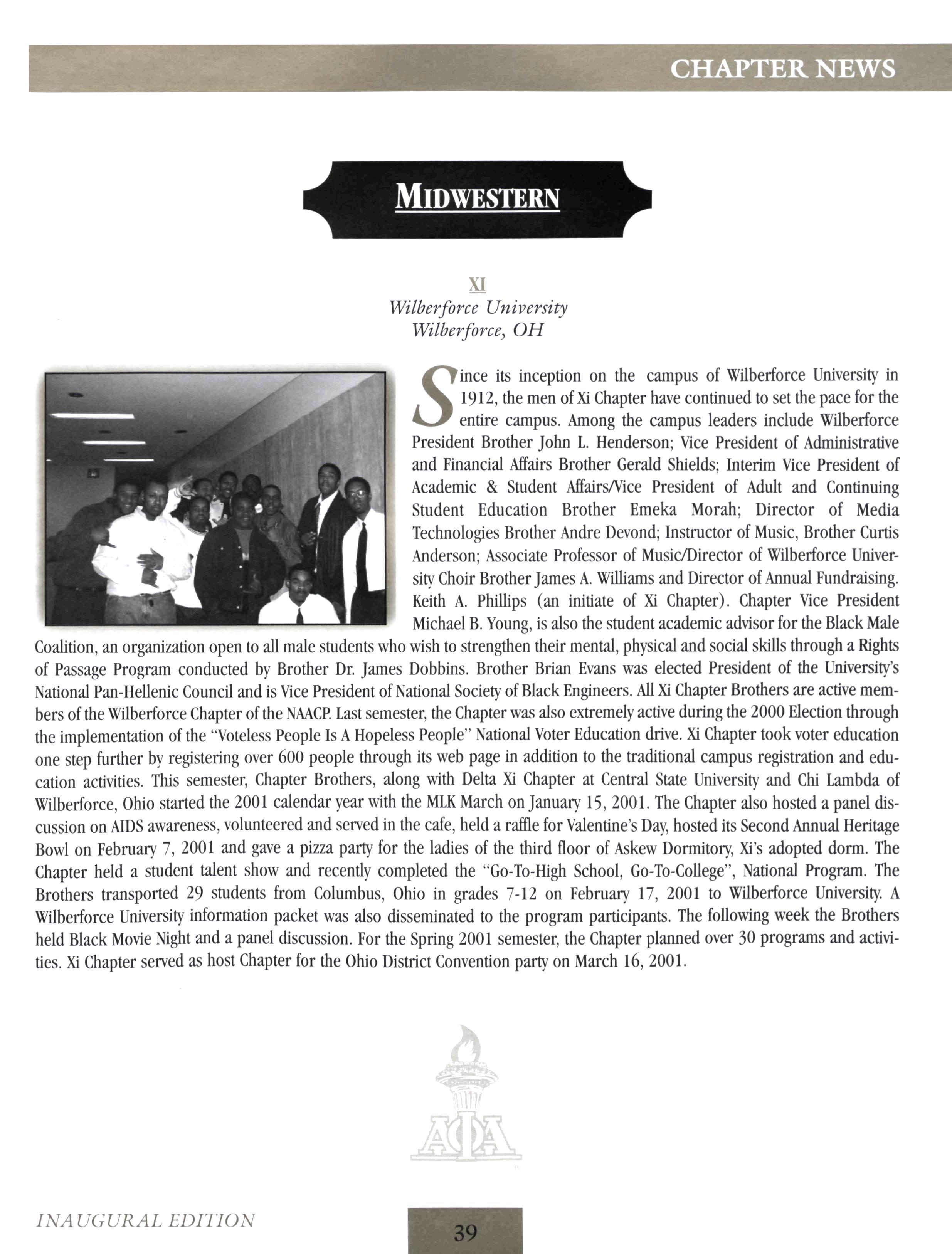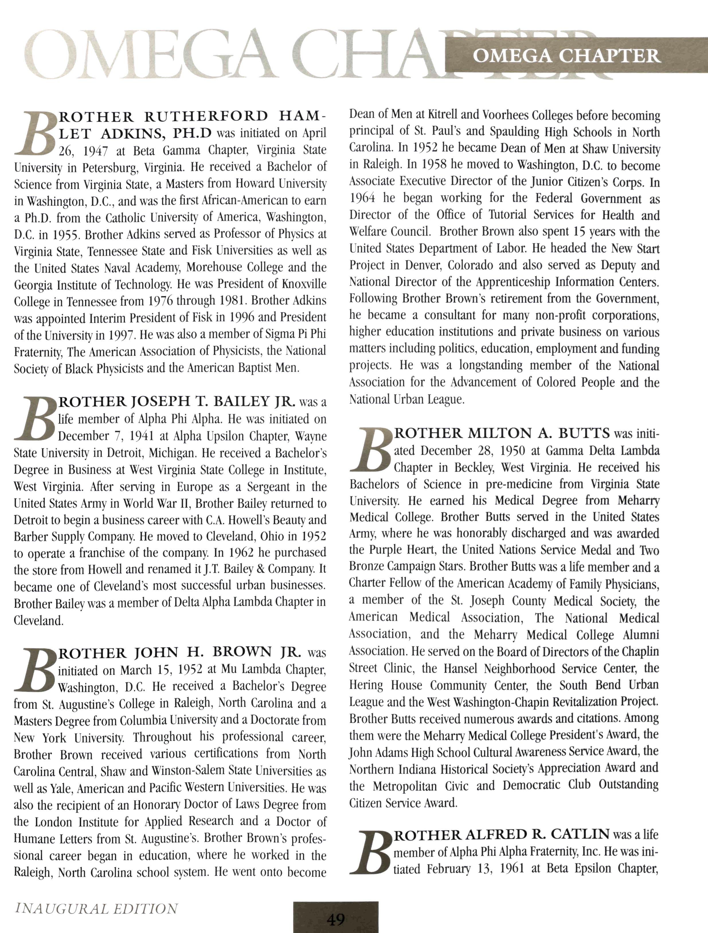 MyBrothers, we must also be committed to rebuilding the ranks of our active membership by reclaiming our inactive Brothers. AsGeneral President of Alpha, I call on every active member of this great organization to join with me in lifting this Fraternity and investing in our future. Let's bring our Brothers back home! As a part of our aggressive Reclamation Initiative, wewill initiate the "Arrive with Five" Program, where each active Brother will work to reclaim five (5) Inactive Brothers, each Fraternal Year, who have, over die course of time, left the fold We will also offer all Chapters in Alpha Phi Alpha significant savings and financial incentives for reclaiming an inactive Brother. Additionally, with the institution of the new Value Added Services Guide, our membership benefits program and the Charles Henry Chapman Reclamation Award, our goal of reclaiming 1,000 inactive Brothers in theyear 2001, is just beyond the horizon. Ifwework together as a collective Brotherhood, the 21st century shall be for us "the age of wisdom and season of light", a friend to Alpha Phi Alpha!
