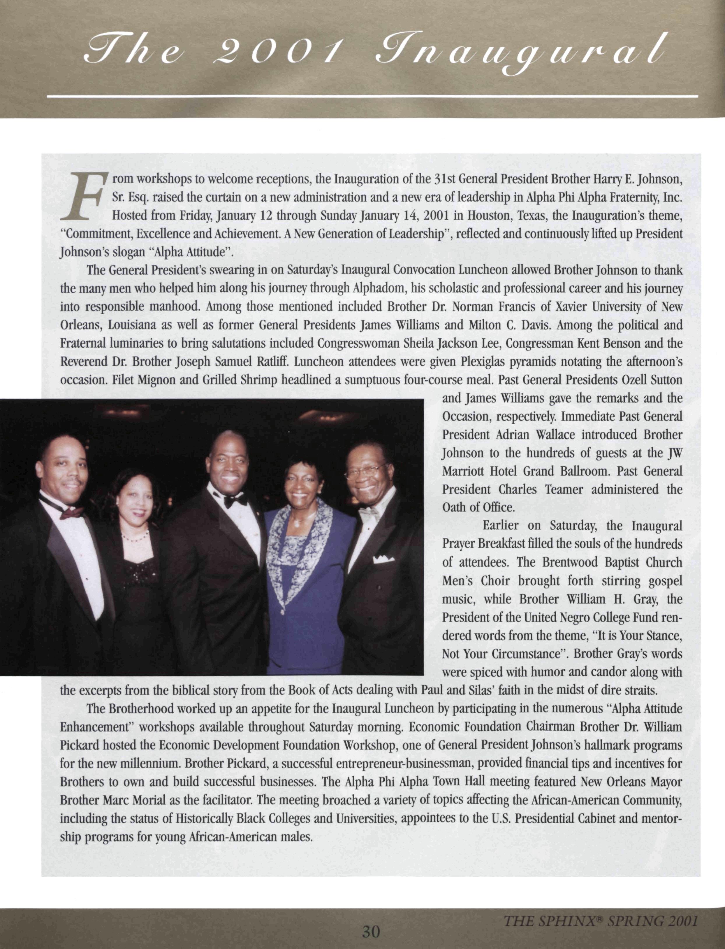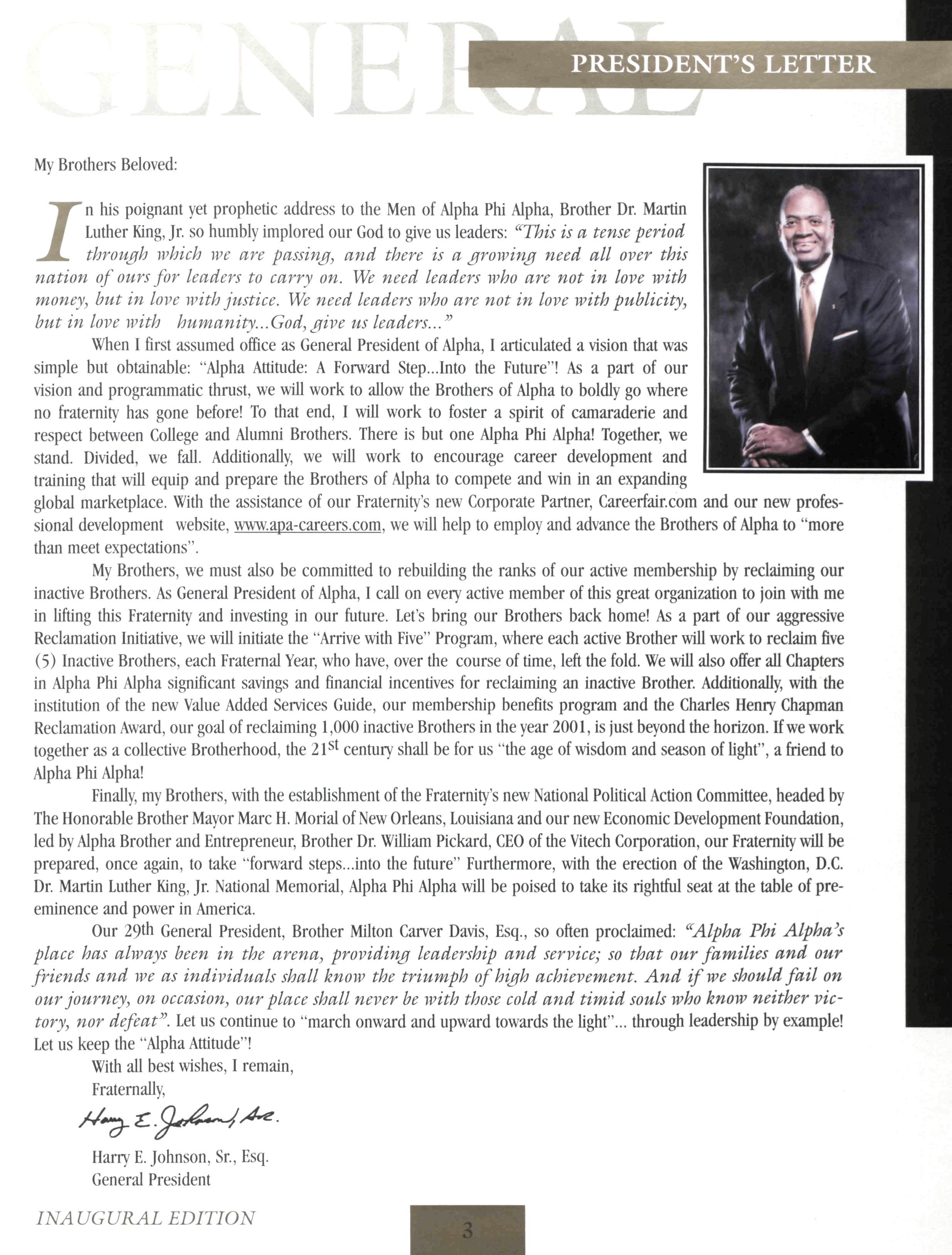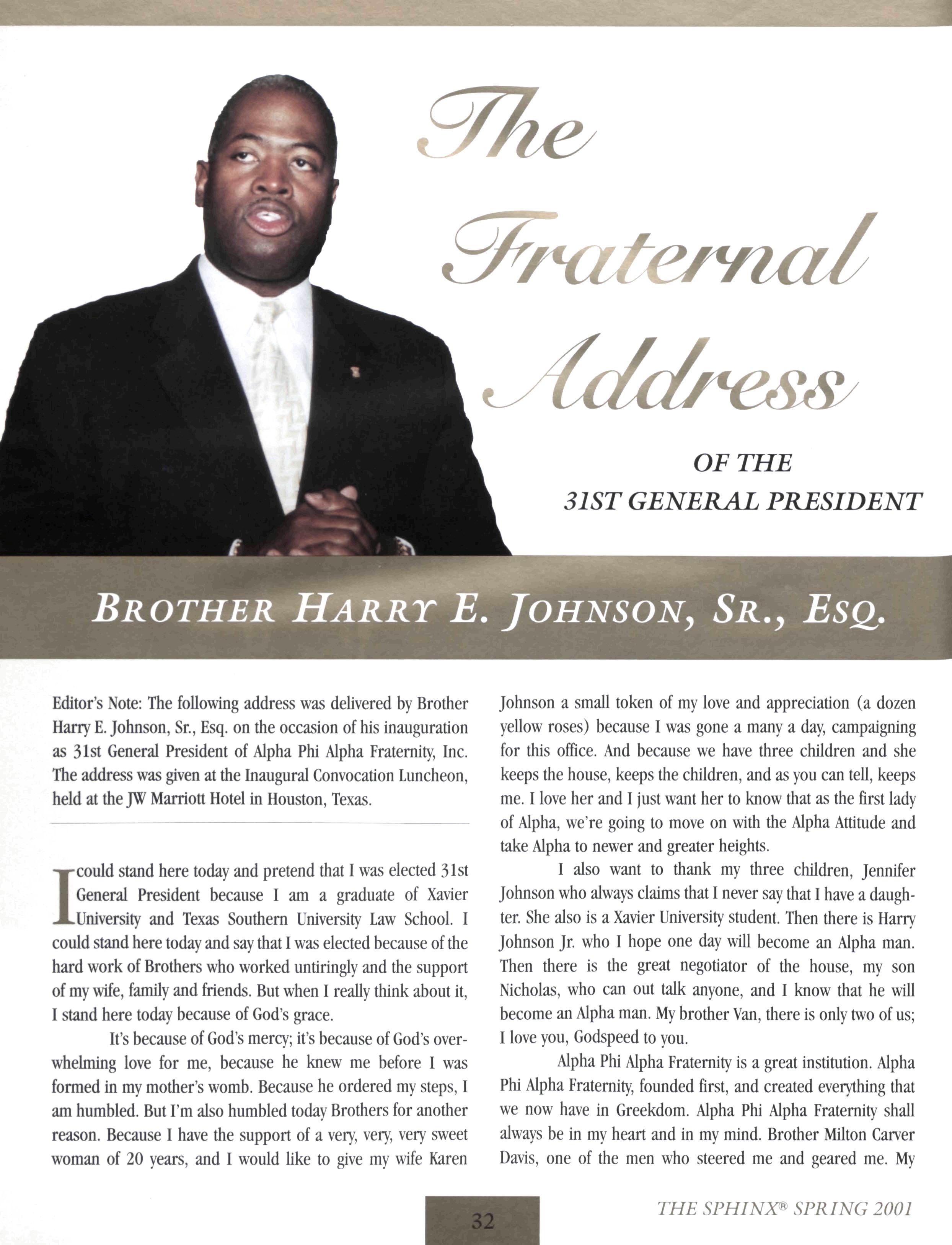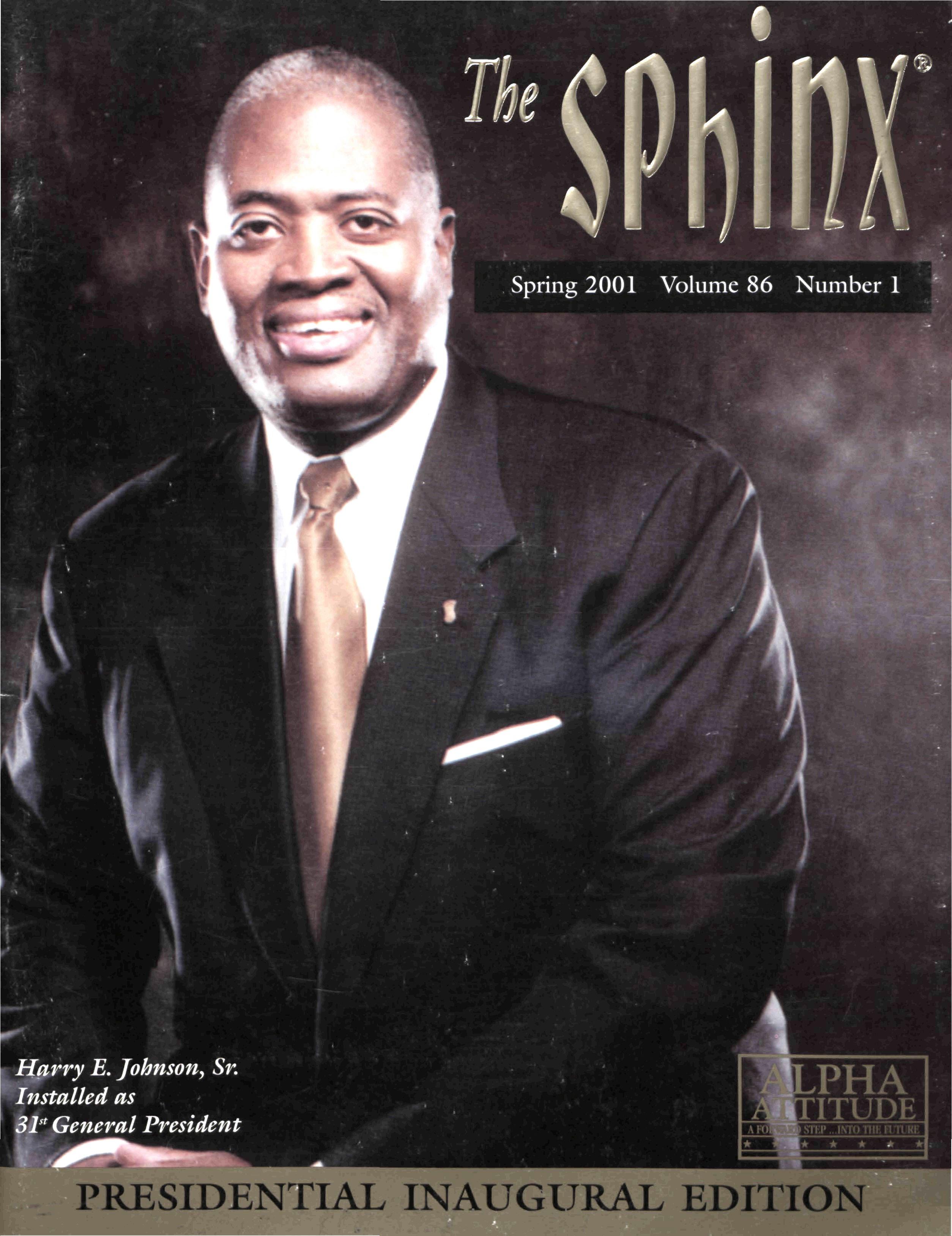 Jt is with Brother Harry E. Johnson Sr.'s motto, "AlphaAttitude", that I greet the Brothers of the world's premier Fraternity! This latest edition of The Sphinx R Magazine is the first of the tenure of our 31st General President. Brother Johnson brings with him an ultraimpressive professional and fraternal resume that exemplifies his slogan. I know the entire fold joins me in wishing our new General President the best in taking over the reigns from our Immediate General President Brother Adrian L. Wallace.