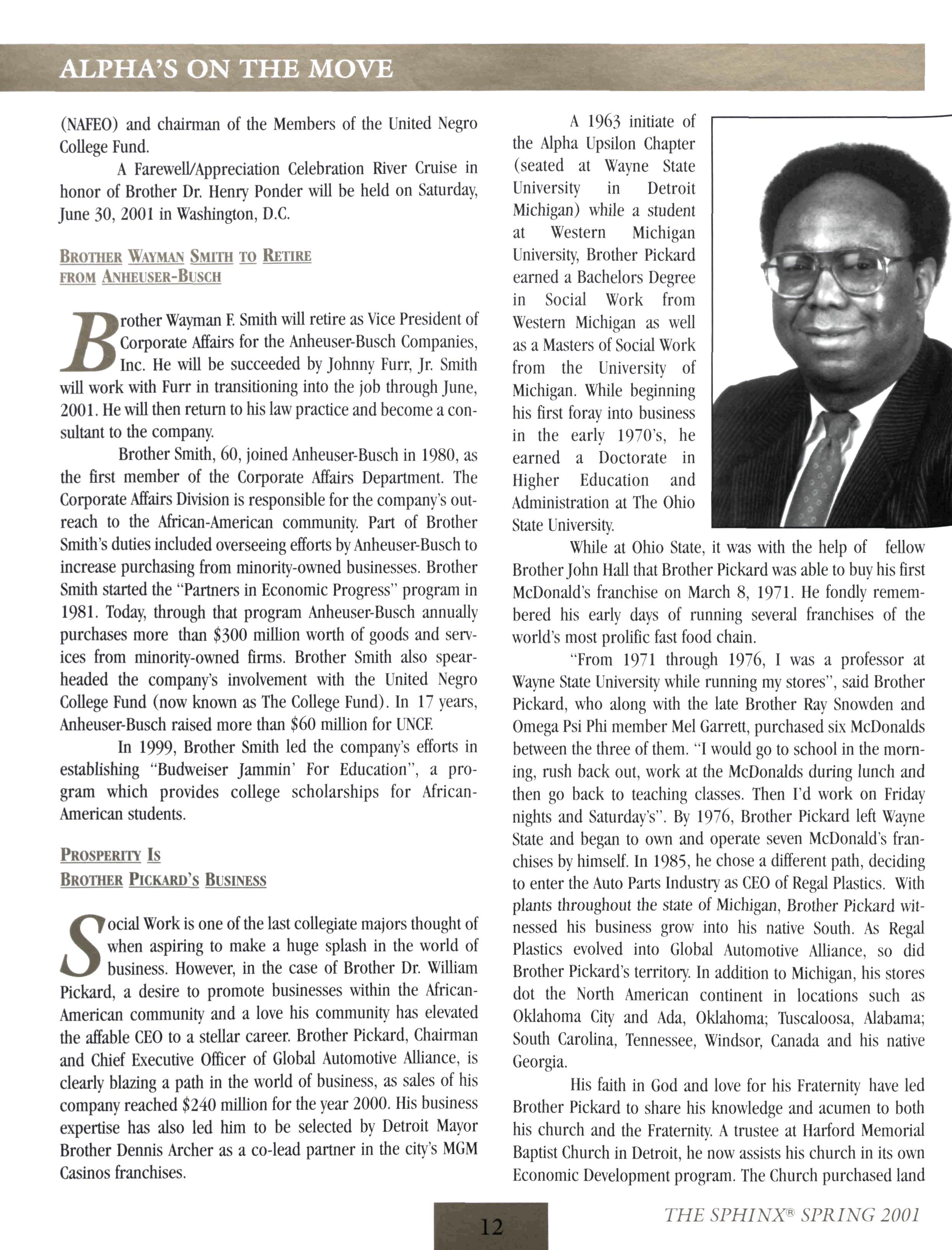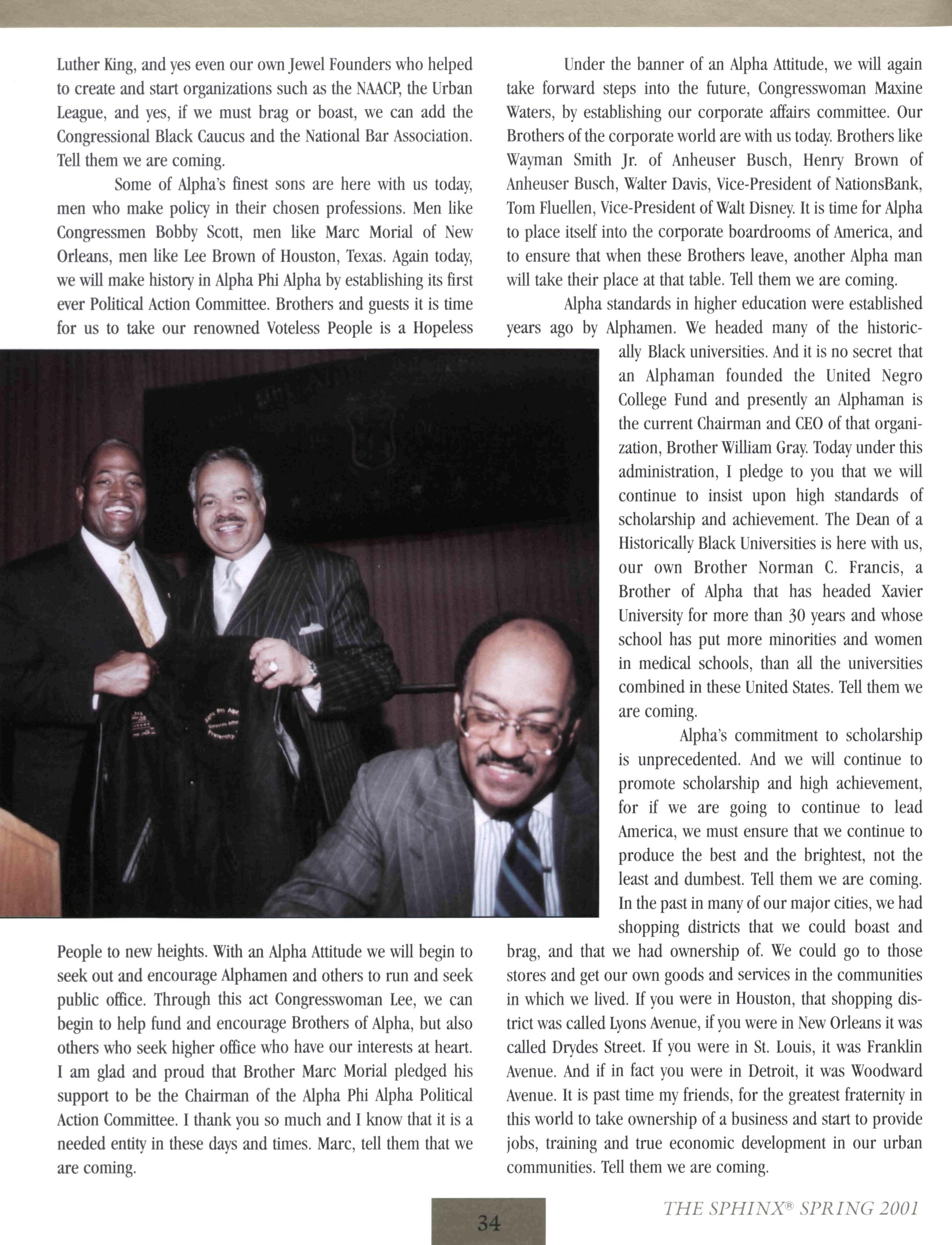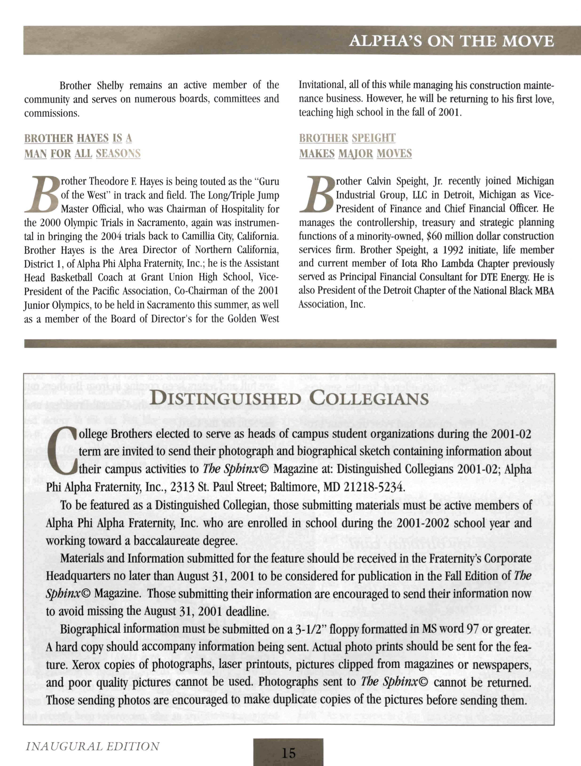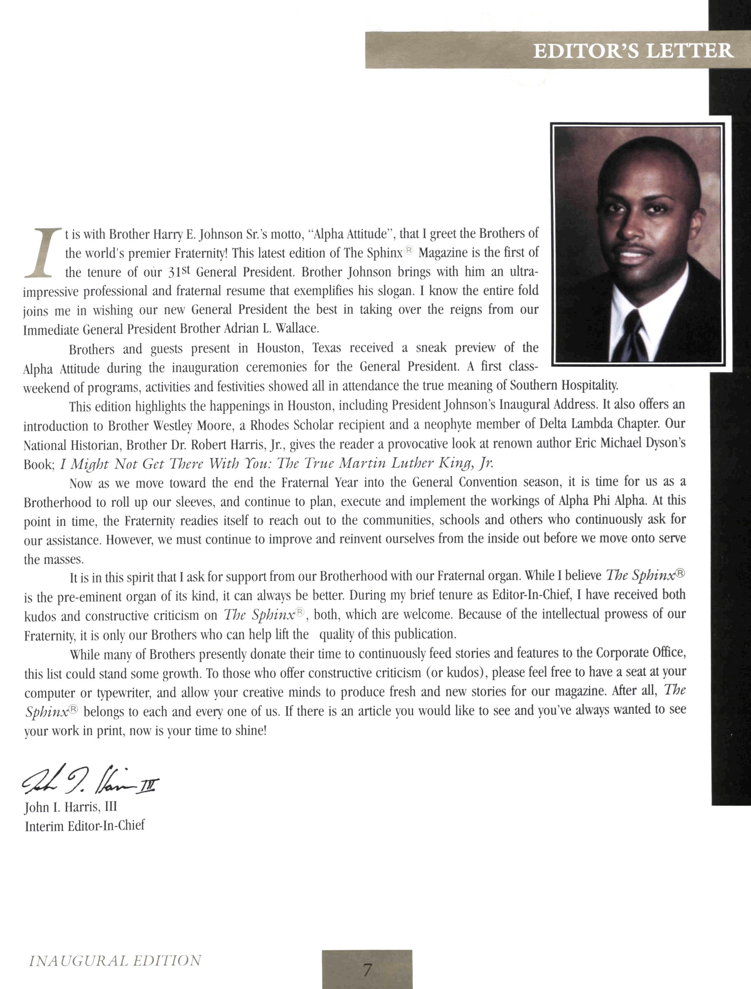 The SPHINX® is the official magazine of the Alpha Phi Alpha Fraternity, Inc ® Send all editorial mail and changes of address to Alpha Phi Alpha Fraternity, Inc.® manuscripts of art. Opinions expressed incolumns and articlesdo not necessarily reflect the views and policies of Alpha Phi Alpha Fraternity, Inc ® Use ofany person s name in fiction, semi-fiction, articles or humorous features is to be regarded as a coincidence andnot as the responsibility of The SPHINX®, and is never done knowingly Copyright 2000 Alpha PhiAlpha Fraternity, Inc.® ALLRIGHTS RESERVED Reproduction, or use without permission, of the editorial or pictorial content ofthe magazine in any manner is prohibited The SPHINX® has been published continuously since 1914 Organizing Editor, Brother Raymond W Cannon Organizing General President, Bromer Henry Lake Dickerson