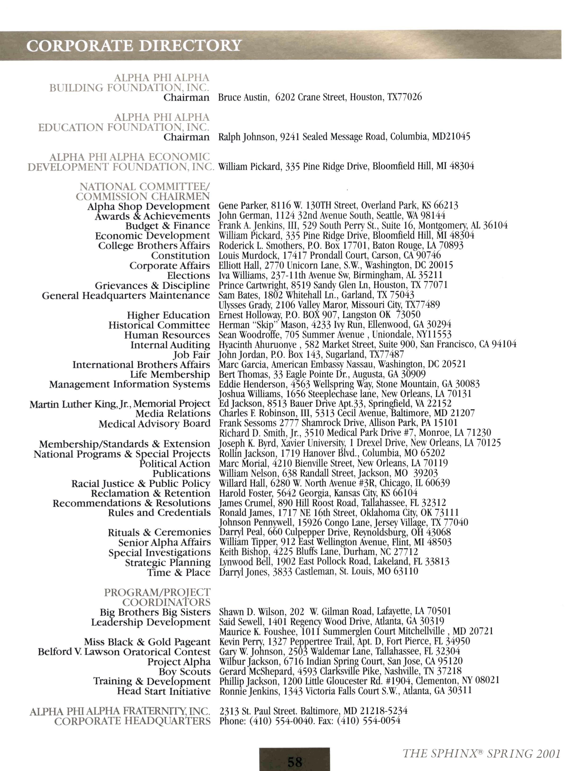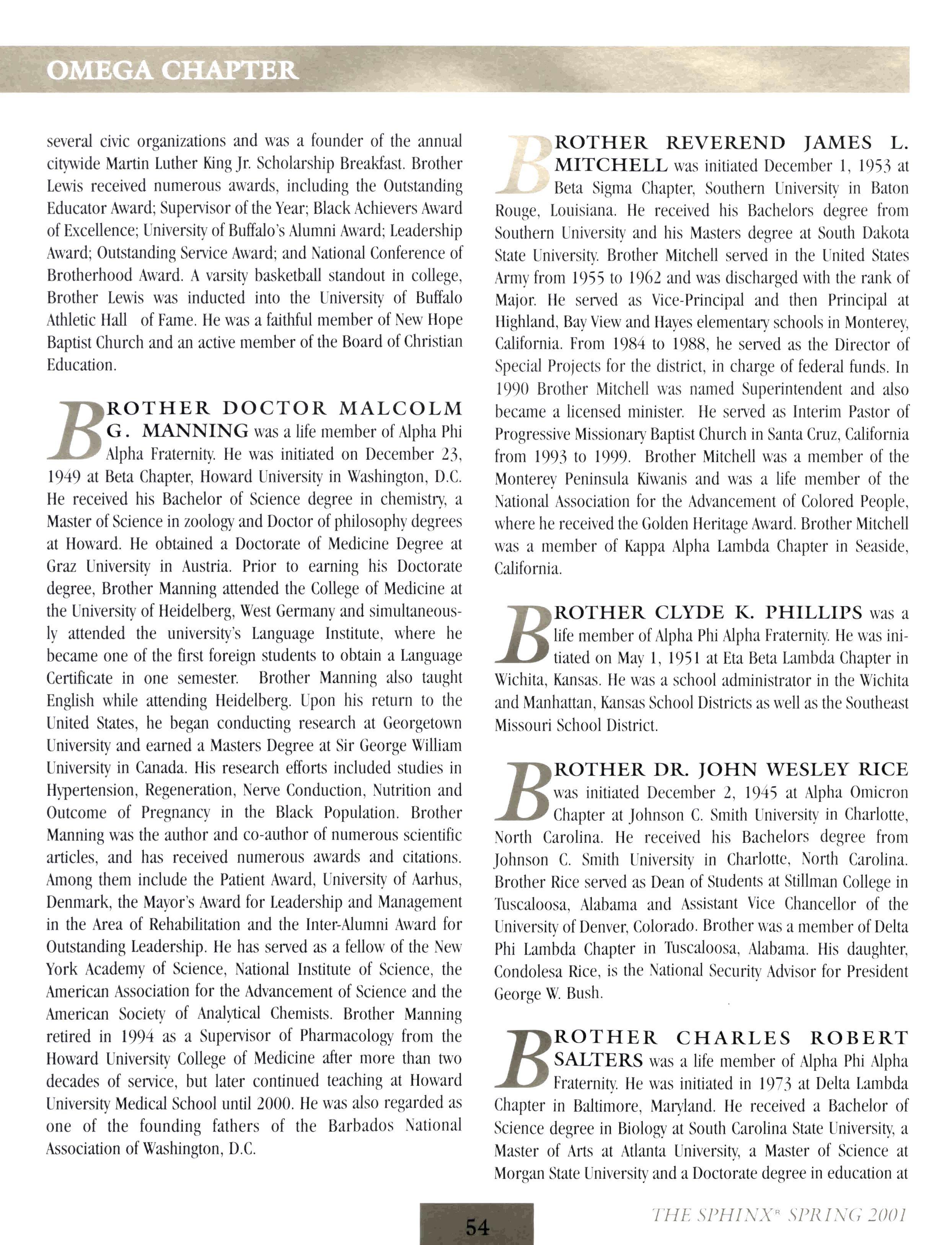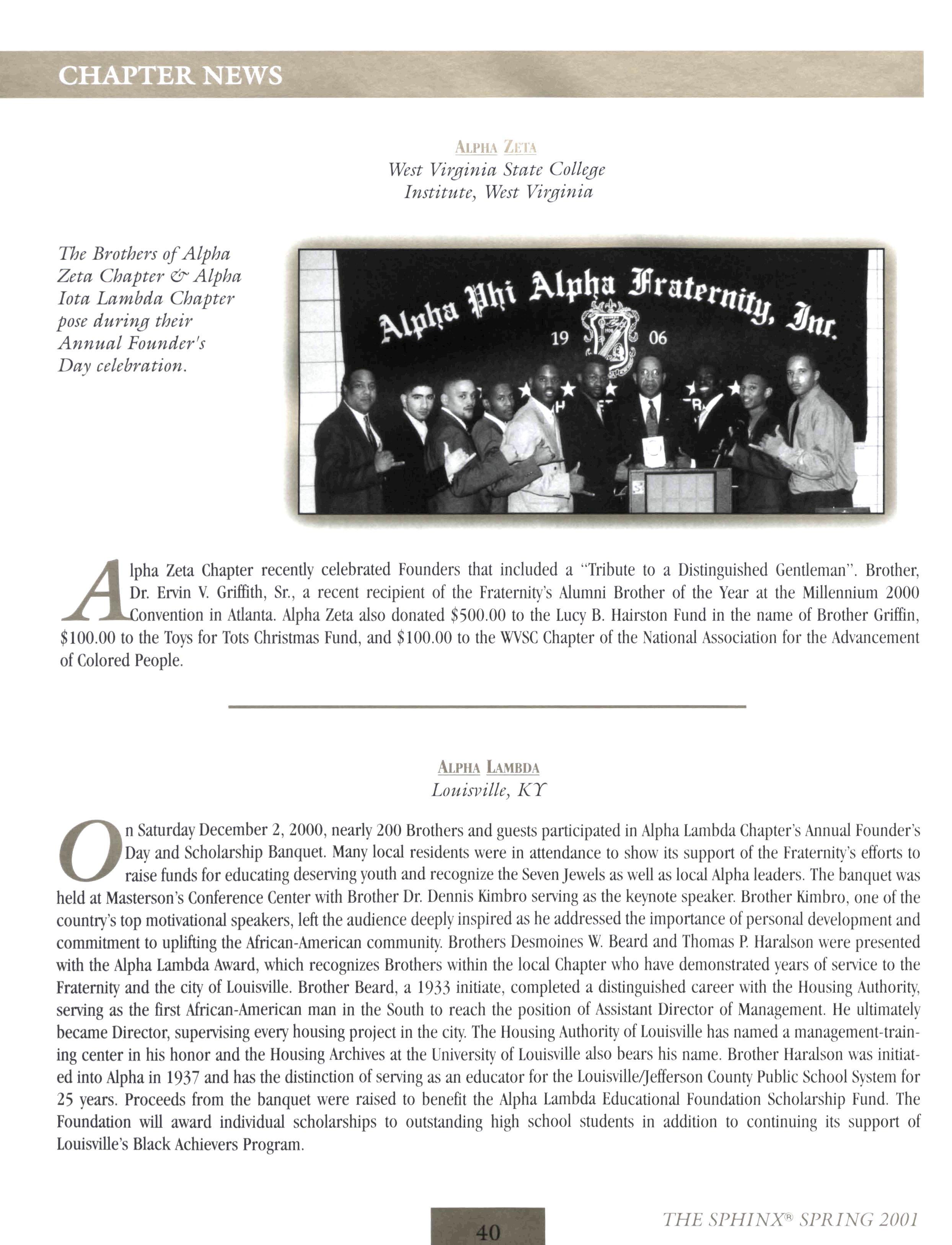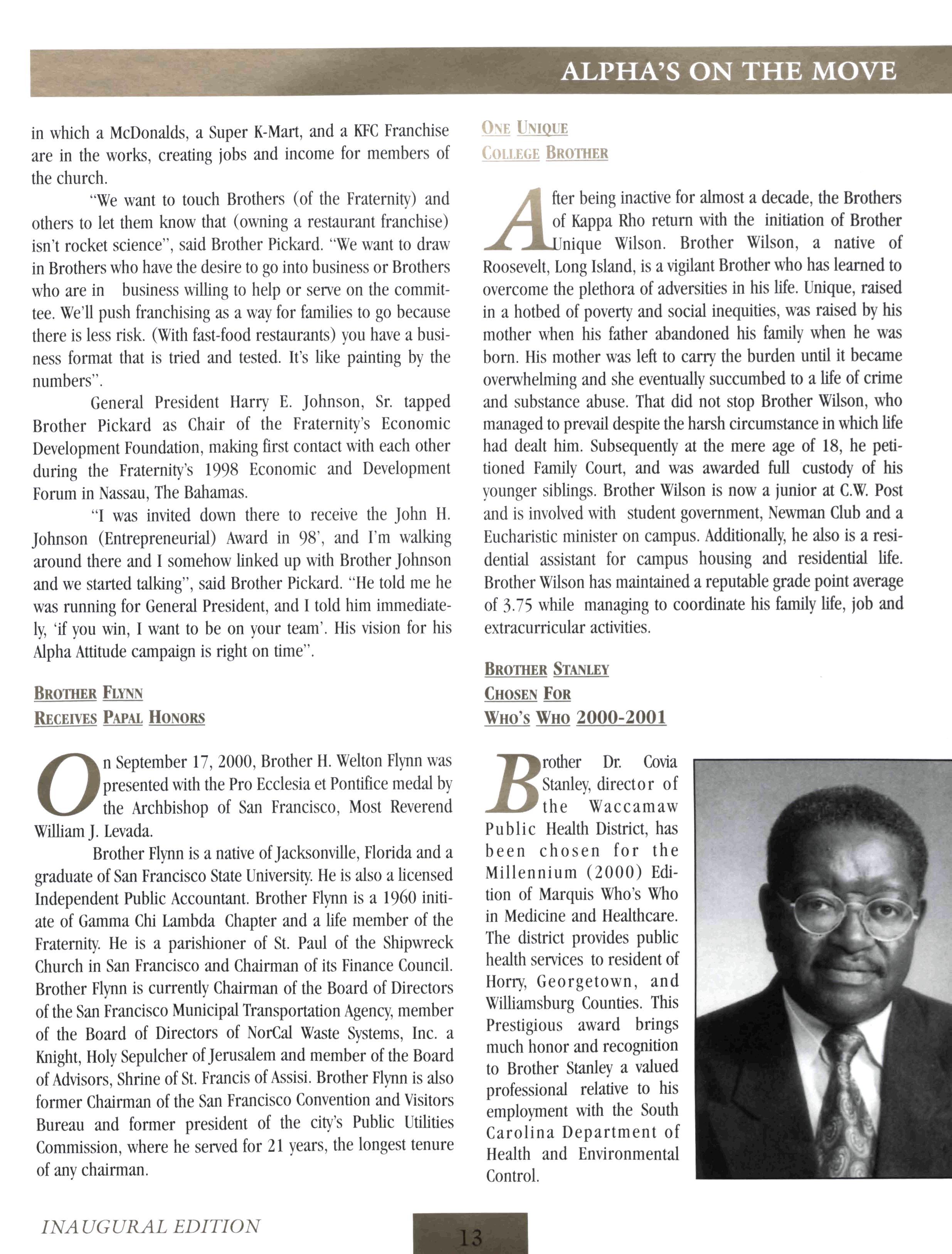 The SPHINX® is the official magazine of the Alpha Phi Alpha Fraternity, Inc ® Send all editorial mail and changes of address to Alpha Phi Alpha Fraternity, Inc.® manuscripts of art. Opinions expressed incolumns and articlesdo not necessarily reflect the views and policies of Alpha Phi Alpha Fraternity, Inc ® Use ofany person s name in fiction, semi-fiction, articles or humorous features is to be regarded as a coincidence andnot as the responsibility of The SPHINX®, and is never done knowingly Copyright 2000 Alpha PhiAlpha Fraternity, Inc.® ALLRIGHTS RESERVED Reproduction, or use without permission, of the editorial or pictorial content ofthe magazine in any manner is prohibited The SPHINX® has been published continuously since 1914 Organizing Editor, Brother Raymond W Cannon Organizing General President, Bromer Henry Lake Dickerson