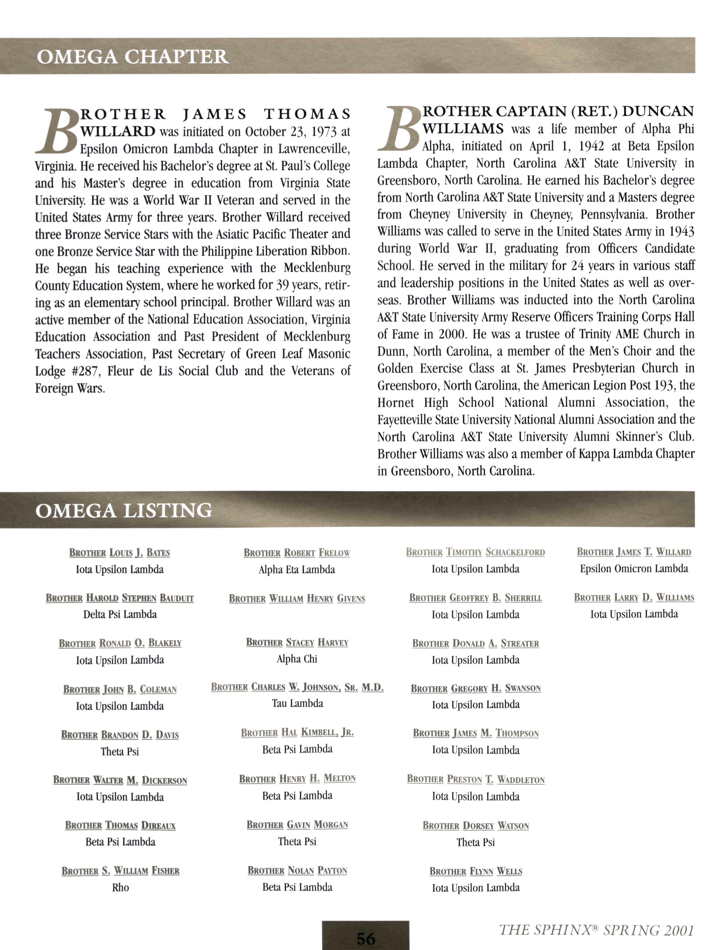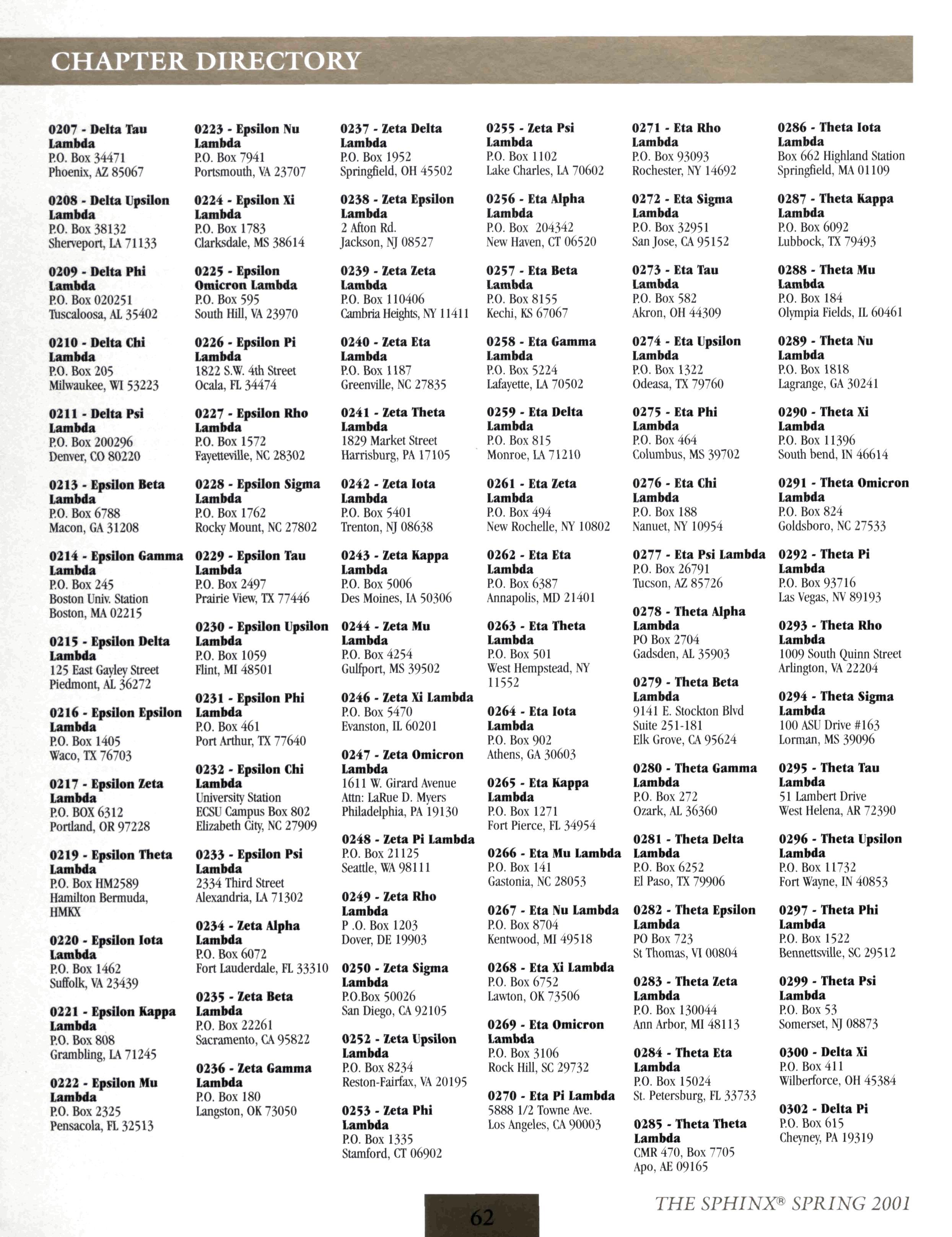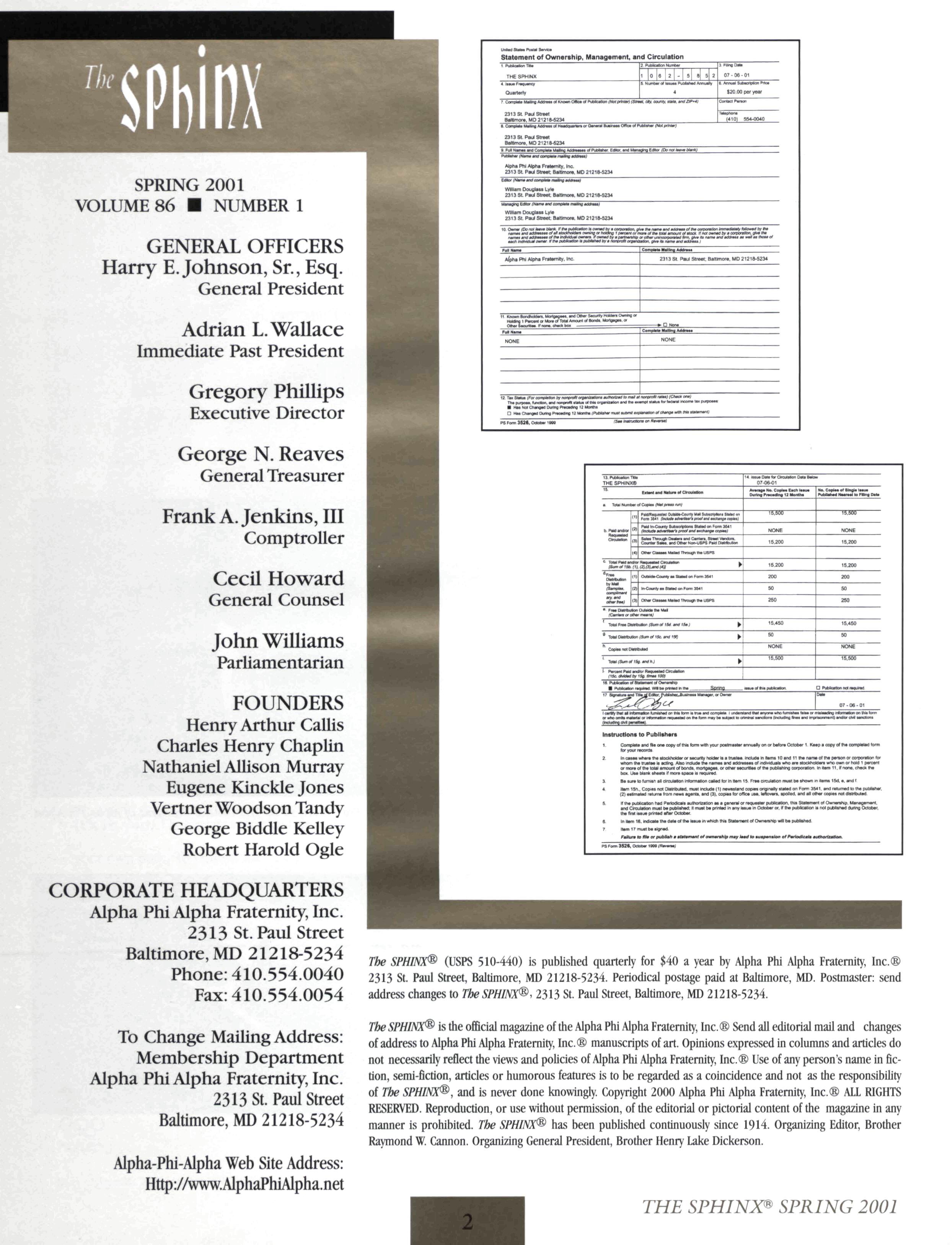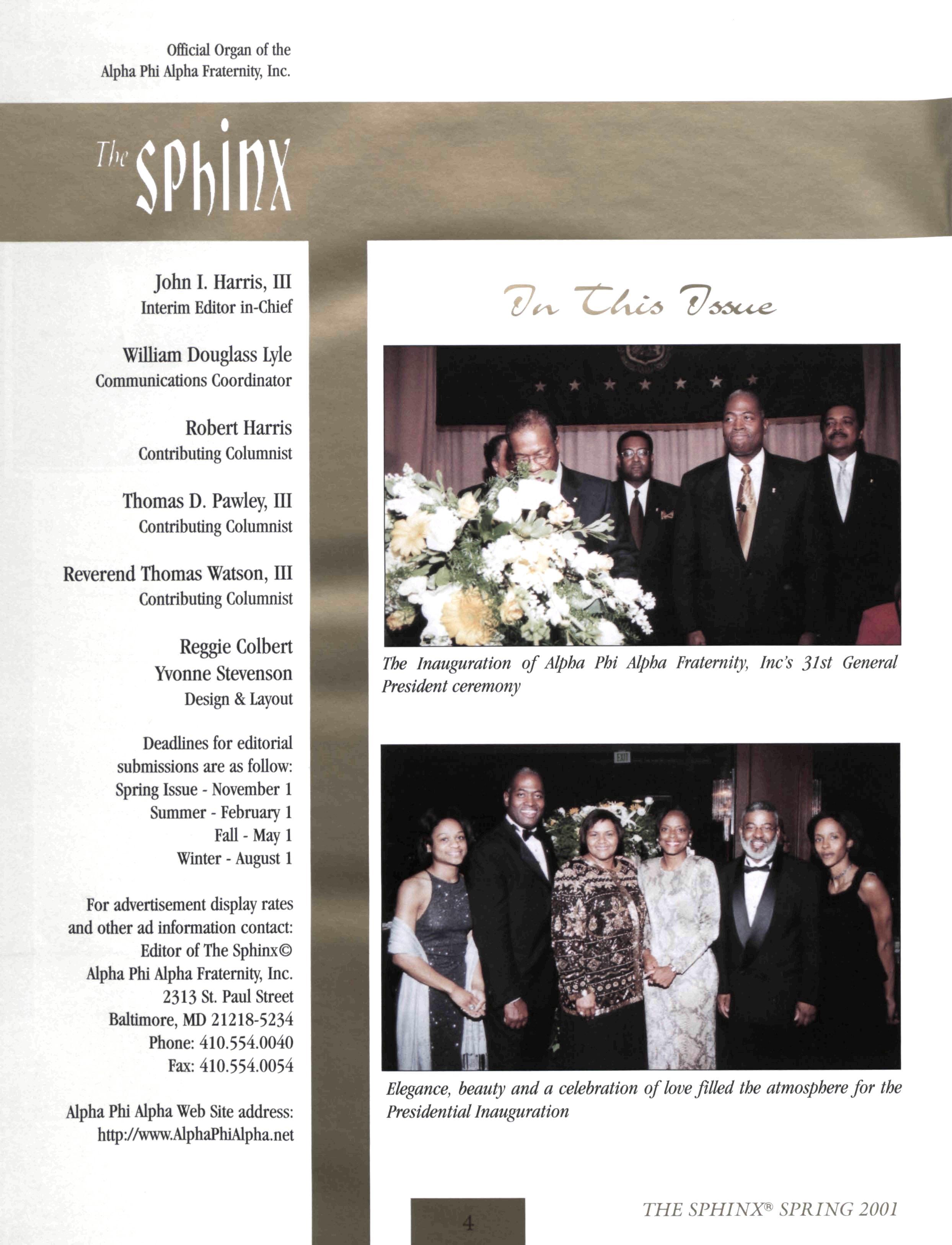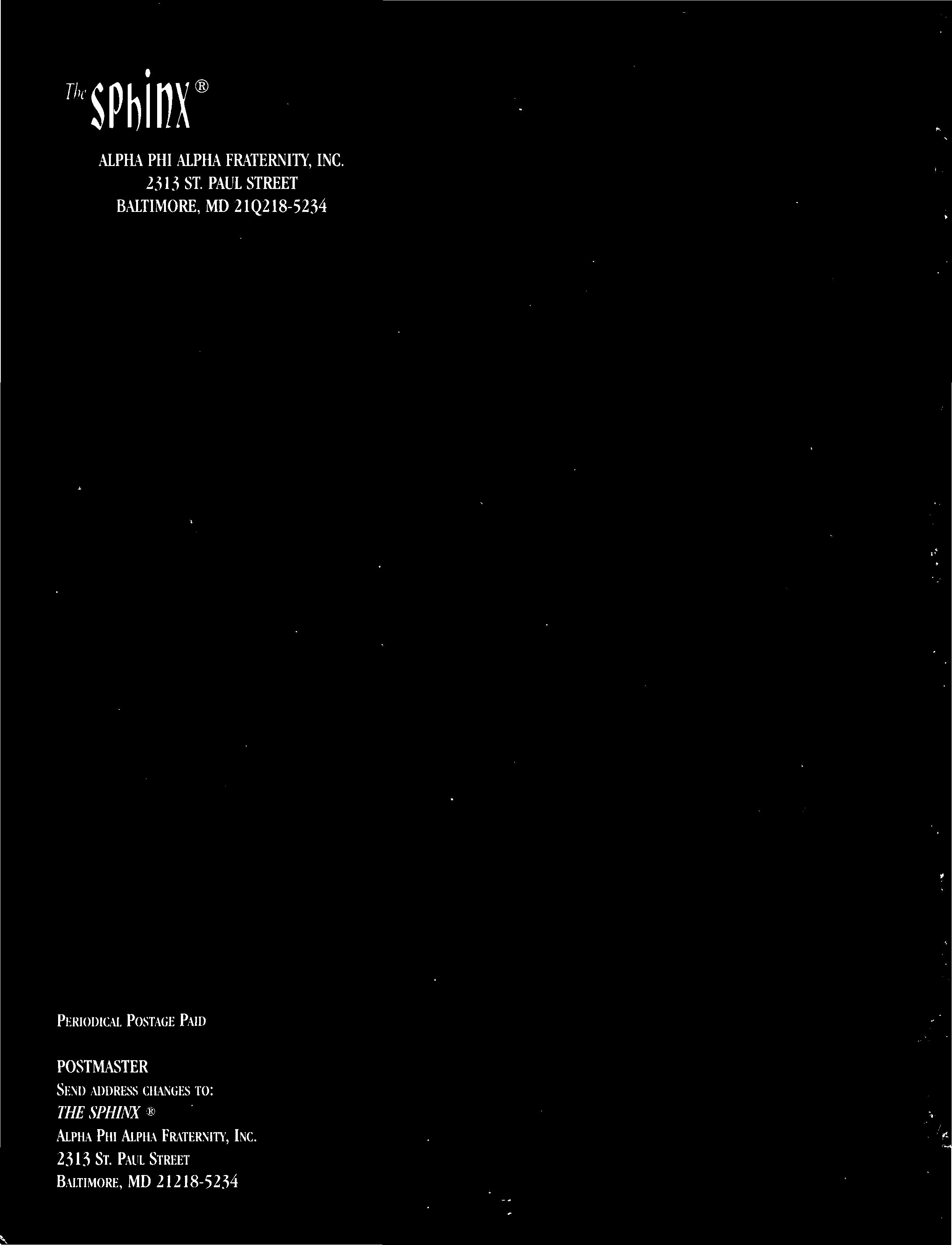 Tfte SPHINX® (USPS 510-440) is published quarterly for $40 a year by Alpha Phi Alpha Fraternity, Inc.® 2313 St Paul Street, Baltimore, MD21218-5234 Periodical postage paid at Baltimore, MD Postmaster: send address changes to The SPHINX®. 2313 St Paul Street, Baltimore, MD 21218-5234