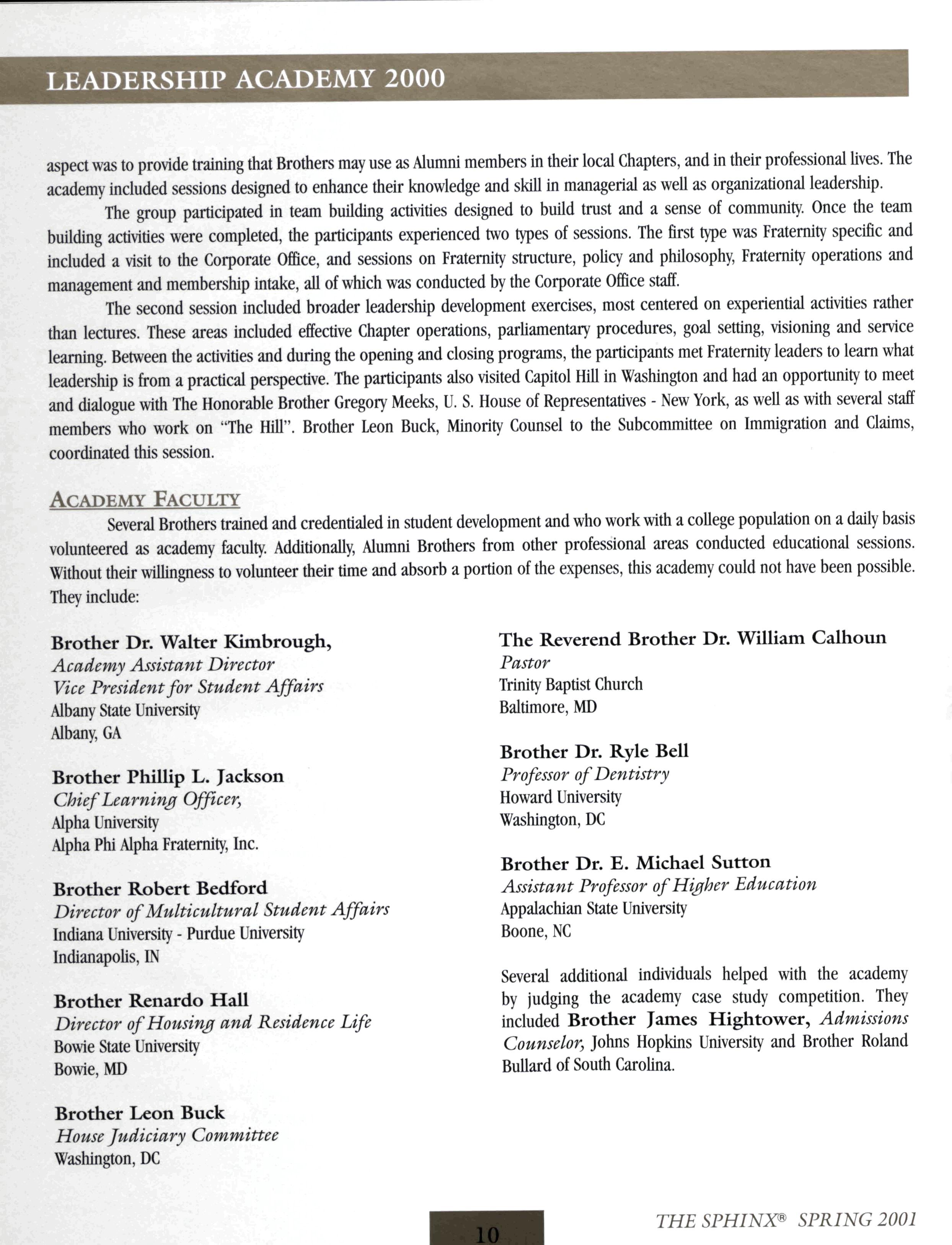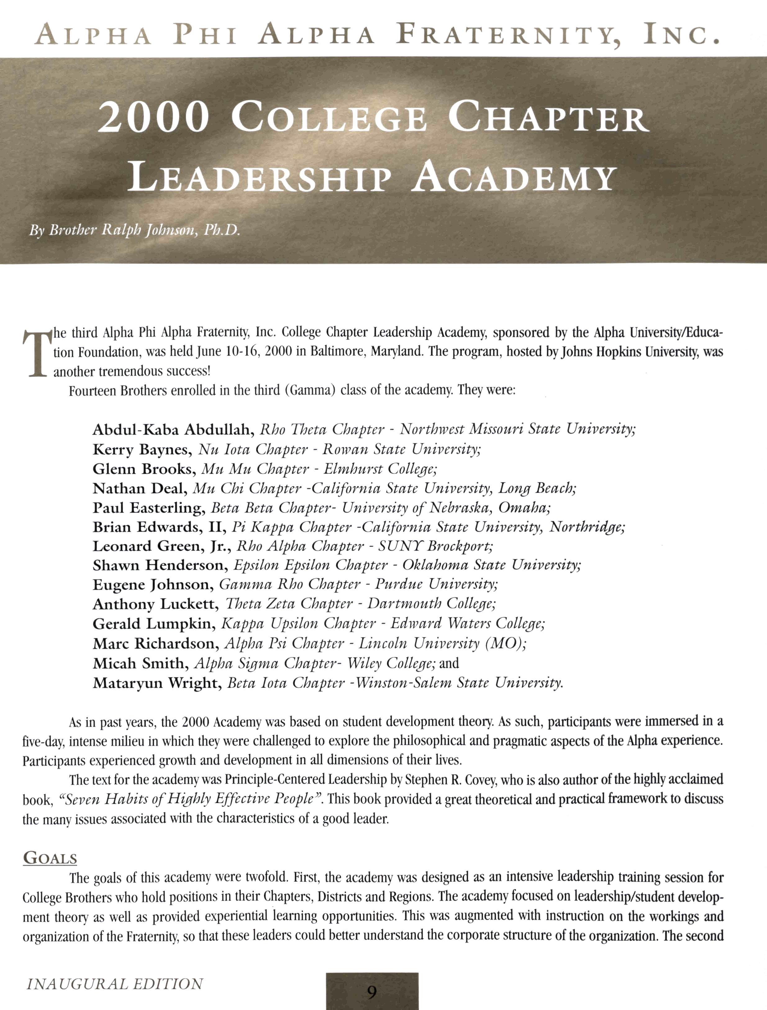 The third Alpha Phi Alpha Fraternity, Inc College Chapter Leadership Academy, sponsored by the Alpha University/Education Foundation, was heldJune 10-16, 2000 in Baltimore, Maryland The program, hosted byJohns Hopkins University, was another tremendous success!