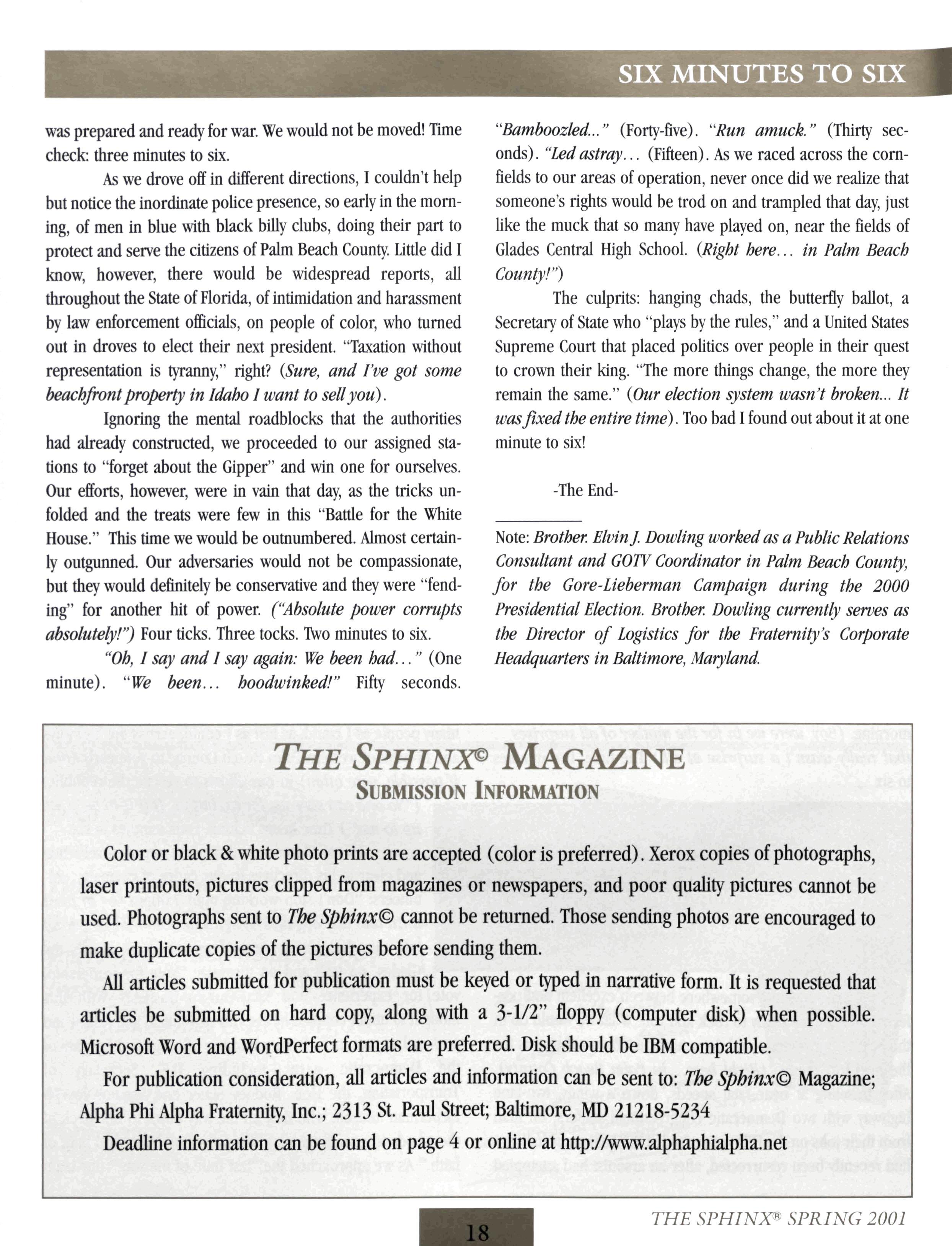 It isin this spirit that Iask for support from our Brotherhood with our Fraternal organ WhileIbelieve The Sphinx® is the pre-eminent organ of its kind, it can always be better. During my brief tenure as Editor-in-Chief, I have received both kudos and constructive criticism on The Sphinx?1 , both, which are welcome. Because of the intellectual prowess of our Fraternity, it is only our Brothers who can help lift the quality of this publication