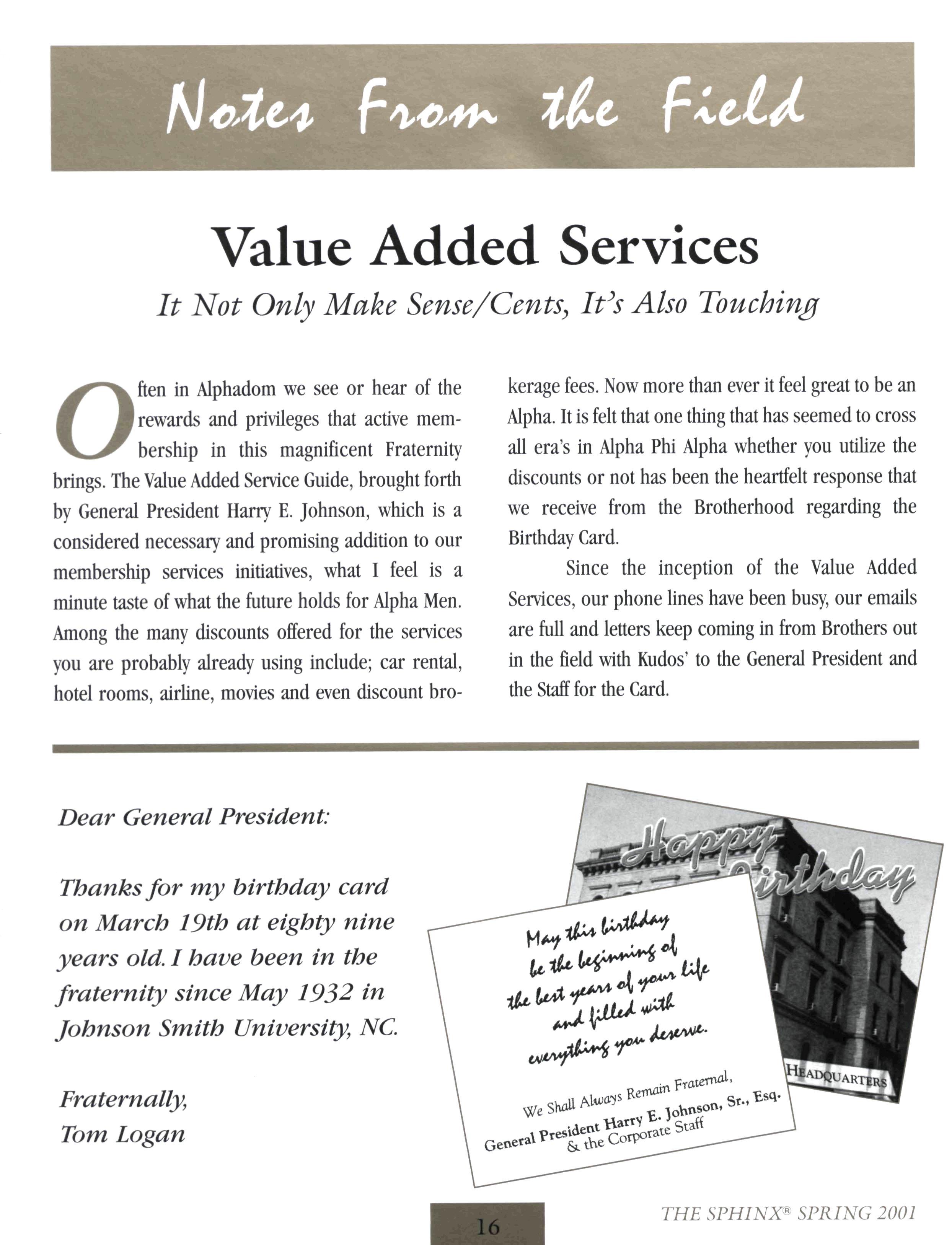 The Value AddedServices Program, theFraternity's Membership Benefits Program, has recently been completed and will be mailed to each active Brother.