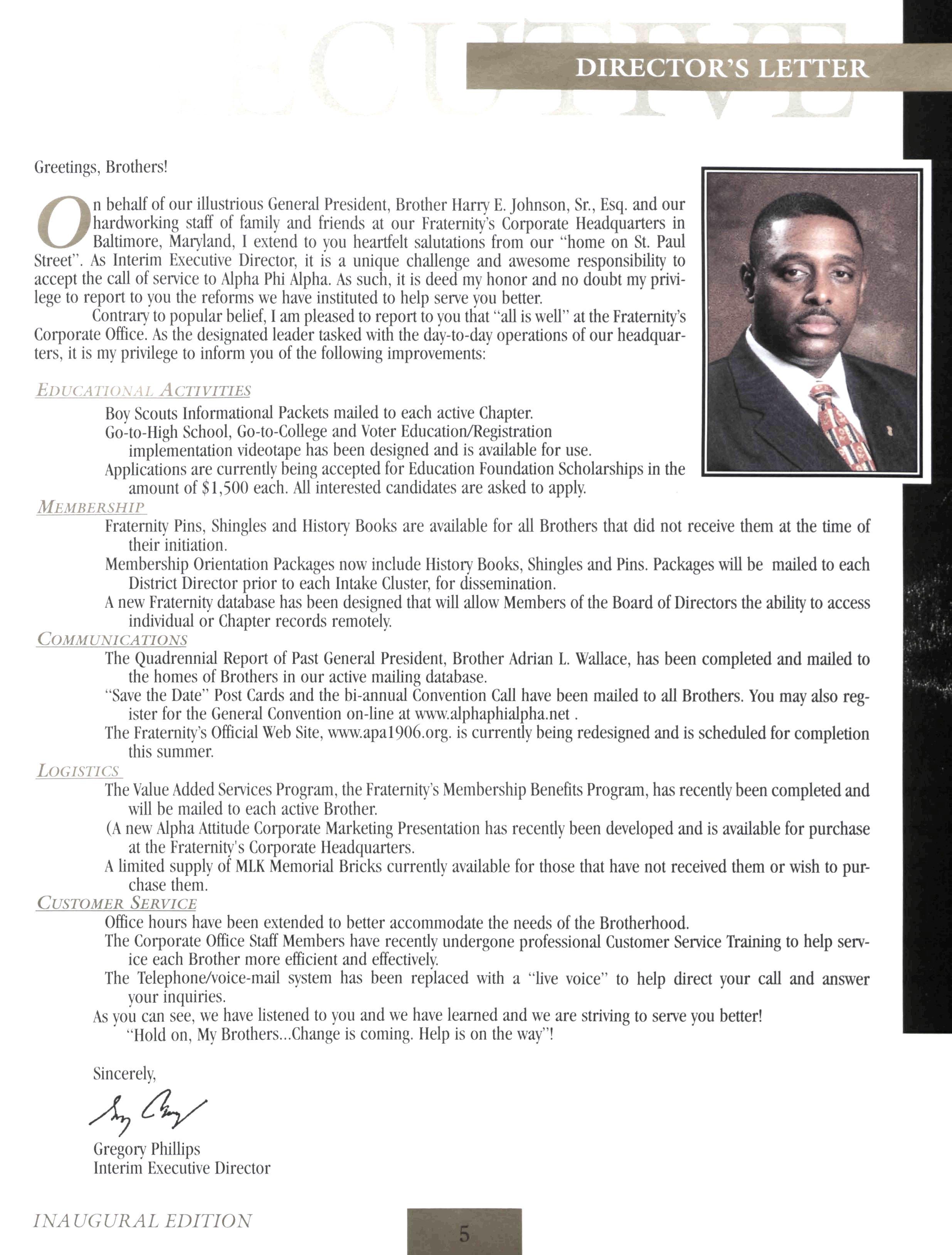 On behalf of our illustrious General President, Brother Harry E. Johnson, Sr., Esq. and our hardworking staff of family and friends at our Fraternity's Corporate Headquarters in Baltimore, Maryland, I extend to you heartfelt salutations from our "home on St Paul Street" As Interim Executive Director, it is a unique challenge and awesome responsibility to accept the call of service to Alpha Phi Alpha. Assuch, it is deed myhonor and no doubt my privilege to report to you the reforms we have instituted to help serve you better.