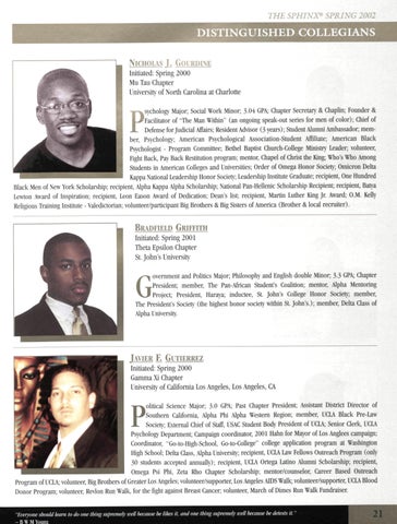 BRADFIELD GRIFFITH Initiated: Spring 2001 Theta Epsilon Chapter St. John's University overnment and Politics Major; Philosophy and English double Minor; 3-3 GPA; Chapter President; member, The Pan-African Student's Coalition; mentor, Alpha Mentoring Project; President, Haraya; inductee, St. John's College Honor Society; member, The President's Society (the highest honor society within St. John's.); member, Delta Class of Alpha University.