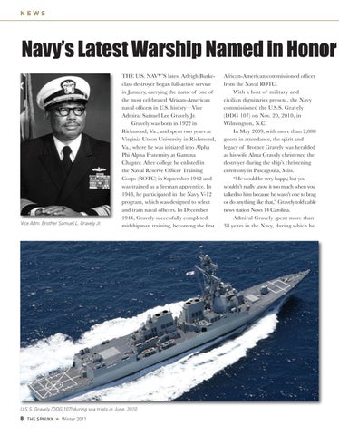 THE U.S. NAVY’S latest Arleigh Burkeclass destroyer began full-active service in January, carrying the name of one of the most celebrated African-American naval officers in U.S. history—Vice Admiral Samuel Lee Gravely Jr. Gravely was born in 1922 in Richmond, Va., and spent two years at Virginia Union University in Richmond, Va., where he was initiated into Alpha Phi Alpha Fraternity at Gamma Chapter. After college he enlisted in the Naval Reserve Officer Training Corps (ROTC) in September 1942 and was trained as a fireman apprentice. In 1943, he participated in the Navy V-12 program, which was designed to select and train naval officers. In December 1944, Gravely successfully completed midshipman training, becoming the first