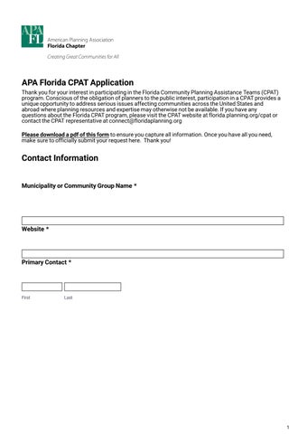 Thank you for your interest in participating in the Florida Community Planning Assistance Teams (CPAT) program. Conscious of the obligation of planners to the public interest, participation in a CPAT provides a unique opportunity to address serious issues affecting communities across the United States and abroad where planning resources and expertise may otherwise not be available. If you have any questions about the Florida CPAT program, please visit the CPAT website at florida.planning.org/cpat or contact the CPAT representative at connect@floridaplanning.org