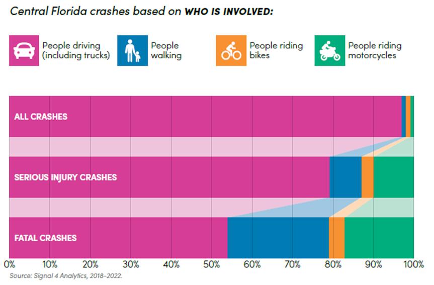 • People walking and biking are involved in only 3% of crashes, yet account for 41% of serious injuries and 57% of fatalities (2018–2022).