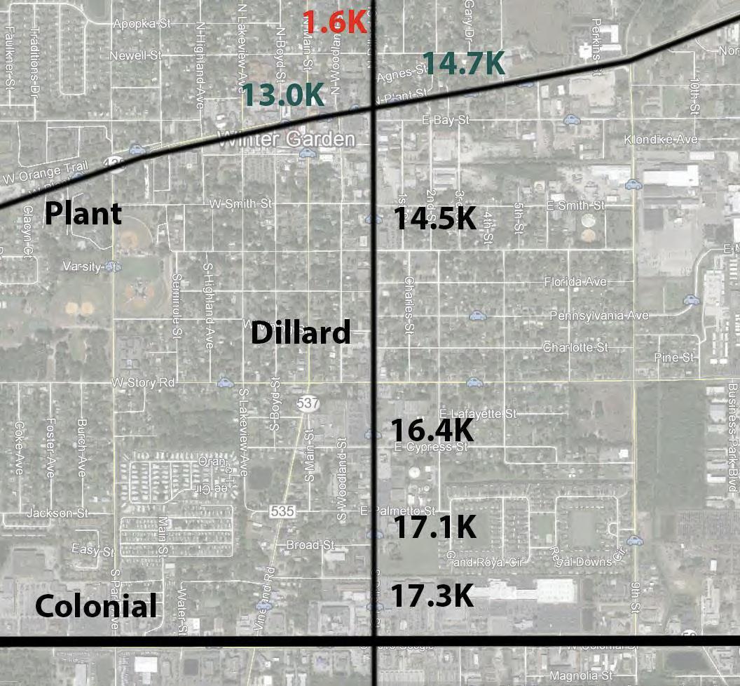 • Includes major County/State roads (e.g., W. Colonial Dr., SR 535) and key City roads (e.g., Dillard St., Story Rd., Daniels Rd.).