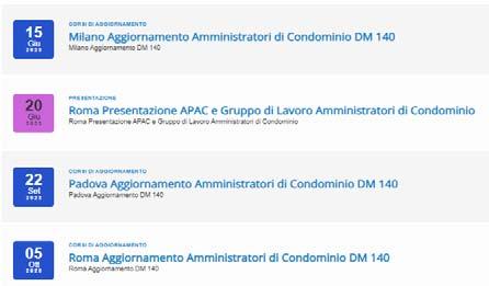 34 PROFESSIONE IMMOBILIARE 2023/ n.42 INFORMAZIONI e pre-Iscrizioni Tutte le località www.apacitalia.it Tutte le sedi 340 8070232 Modena 059 3966552 - 351 8725565 Amministratori di Condominio Si segnalano ai condomini i nominativi di Amministratori presenti nelle rispettive aree Lavoro autonomo Docenti professionisti Corso basato sulla norma UNI 10801 Diventa un professionista certificato MASTER GRATUITI PER I SOCI Nuovi Moduli: Tutor del Condominio Riforma del Condominio Lezioni 1 giorno alla settimana dalle 18.00 alle 21.00 Il TUO condominio ha un Amministratore competente? apacmilano@yahoo.it apacitalia@gmail.com www.apacitalia.it Corso di Formazione Presenti a: Per ricevere ulteriore documentazione invia una e-mail oppure consulta il nostro sito web MODENA MILANO 10/17 Ottobre Info su www.eureos.it Corso ai sensi del DM 13 8 2014 n.140 Tutoraggio e Aggiornamento Costante dei Soci Amministratori Milano – Monza – Legnano – Busto Arsizio Corsico, Roma, Torino, Reggio Calabria, Benevento, Padova, Bologna www.apacitalia.it Associazione iscritta nell’elenco delle Associazioni Professionali che rilasciano Attestato di Qualità dei Servizi (Ministero Sviluppo Economico) 20/27 Aprile 12/19 Ottobre TORINO BUSTO ARSIZIO