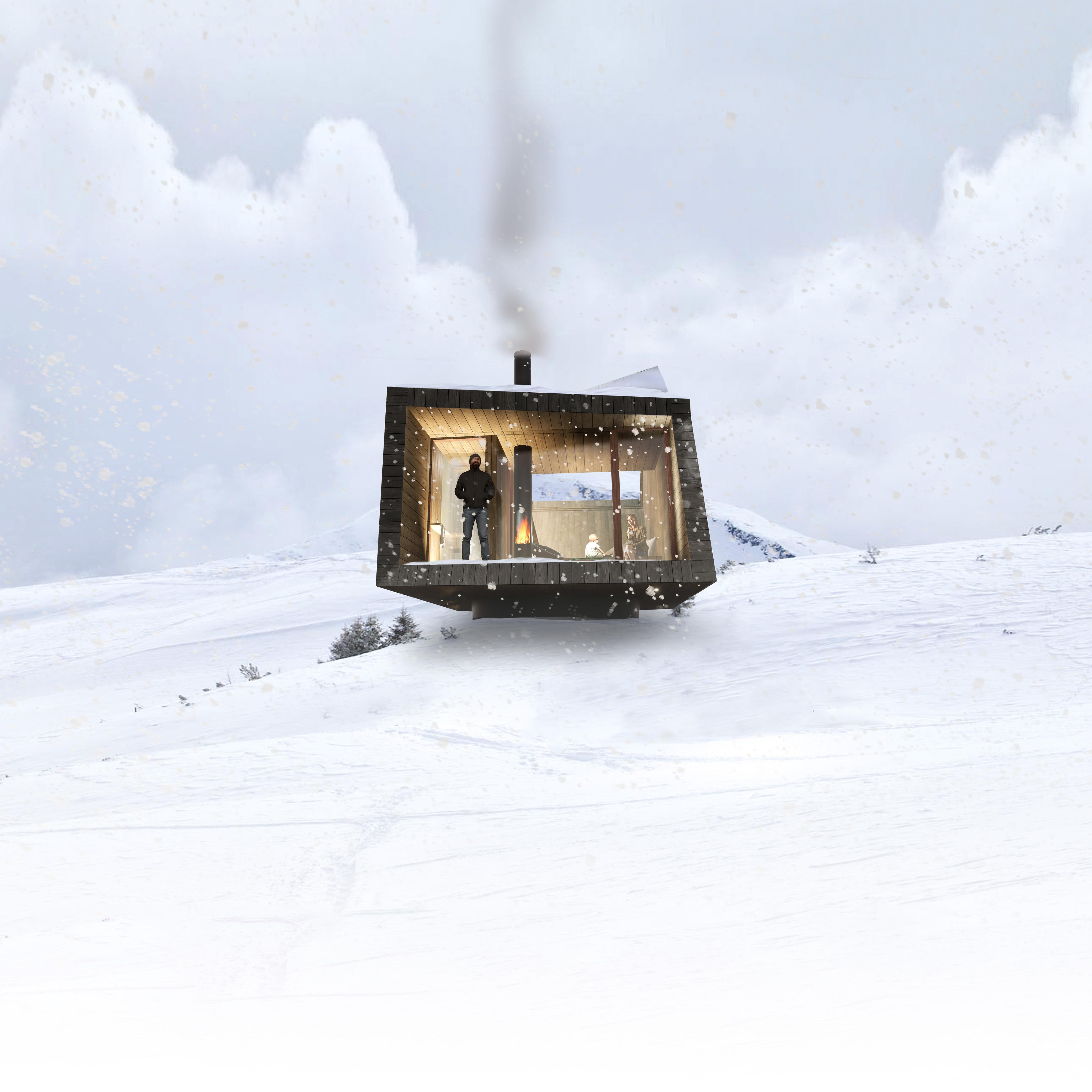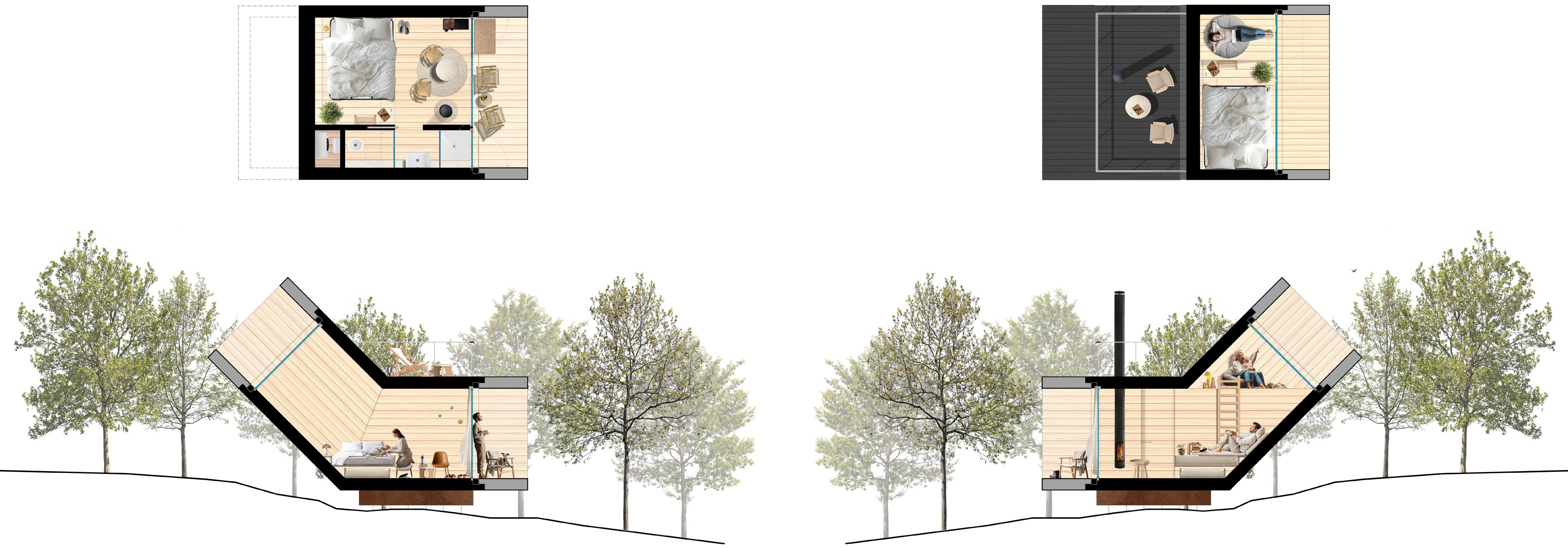 It combines the core A POD room with two attachable modules, allowing up to 64 exterior form variations that frame the surrounding landscape, and over one million forms when further expanded with additional modules.