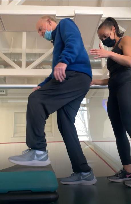 When we first resumed post-COVID, Dave was unable to step up without assistance. But as you will see in the video (available to view on digital version of Apawamis Now), he is now managing just fine on his own! Dave trains with me three times per week and threefour times a week on his own. Not too bad for 90 years old! His determination and will to set goals for himself continue to inspire me.