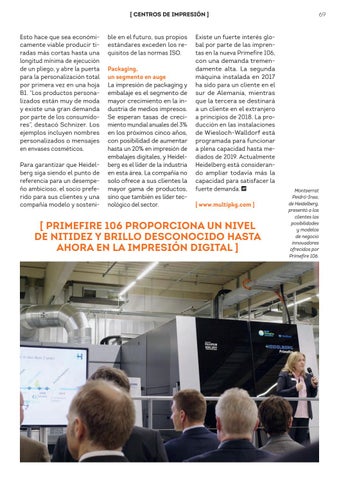 ble en el futuro, sus propios estándares exceden los requisitos de las normas ISO. Packaging, un segmento en auge La impresión de packaging y embalaje es el segmento de mayor crecimiento en la industria de medios impresos. Se esperan tasas de crecimiento mundial anuales del 3% en los próximos cinco años, con posibilidad de aumentar hasta un 20% en impresión de embalajes digitales, y Heidelberg es el líder de la industria en esta área. La compañía no solo ofrece a sus clientes la mayor gama de productos, sino que también es líder tecnológico del sector.