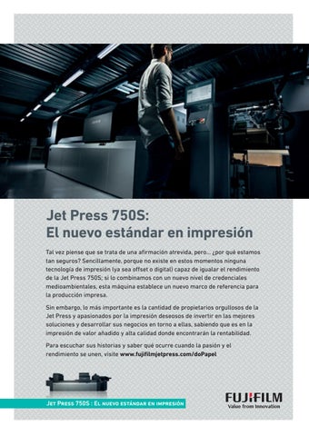 Jet Press 750S: El nuevo estándar en impresión Tal vez piense que se trata de una afirmación atrevida, pero... ¿por qué estamos tan seguros? Sencillamente, porque no existe en estos momentos ninguna tecnología de impresión (ya sea offset o digital) capaz de igualar el rendimiento de la Jet Press 750S; si lo combinamos con un nuevo nivel de credenciales medioambientales, esta máquina establece un nuevo marco de referencia para la producción impresa. Sin embargo, lo más importante es la cantidad de propietarios orgullosos de la Jet Press y apasionados por la impresión deseosos de invertir en las mejores soluciones y desarrollar sus negocios en torno a ellas, sabiendo que es en la impresión de valor añadido y alta calidad donde encontrarán la rentabilidad. Para escuchar sus historias y saber qué ocurre cuando la pasión y el rendimiento se unen, visite www.fujifilmjetpress.com/doPapel
