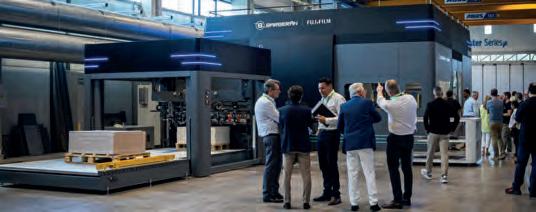 La plataforma de inyección de tinta de pasada única HS Series se denomina ahora Acuity Aristo, marcando la evolución de un proyecto en fase de desarrollo a una solución de inyección de tinta de alta velocidad comercialmente disponible. Para apoyar el cambio de marca, Fujifilm organizó un evento exclusivo el pasado mes de julio en la sede su socio de desarrollo Barberán en Barcelona. La selecta lista de invitados fue la primera en el mundo en ver tanto la Acuity Aristo HS6000 como la HS3000 funcionando en vivo por primera vez. El evento también incluyó demostraciones guiadas, sesiones informáticas técnicas y la oportunidad de hablar directamente con el equipo de desarrollo de Fujifilm. El dispositivo HS6000 exhibido fue desmontado inmediatamente después y trasladado a Linney, en el Reino Unido, donde se ha convertido en la primera instalación de Acuity Aristo del mundo.