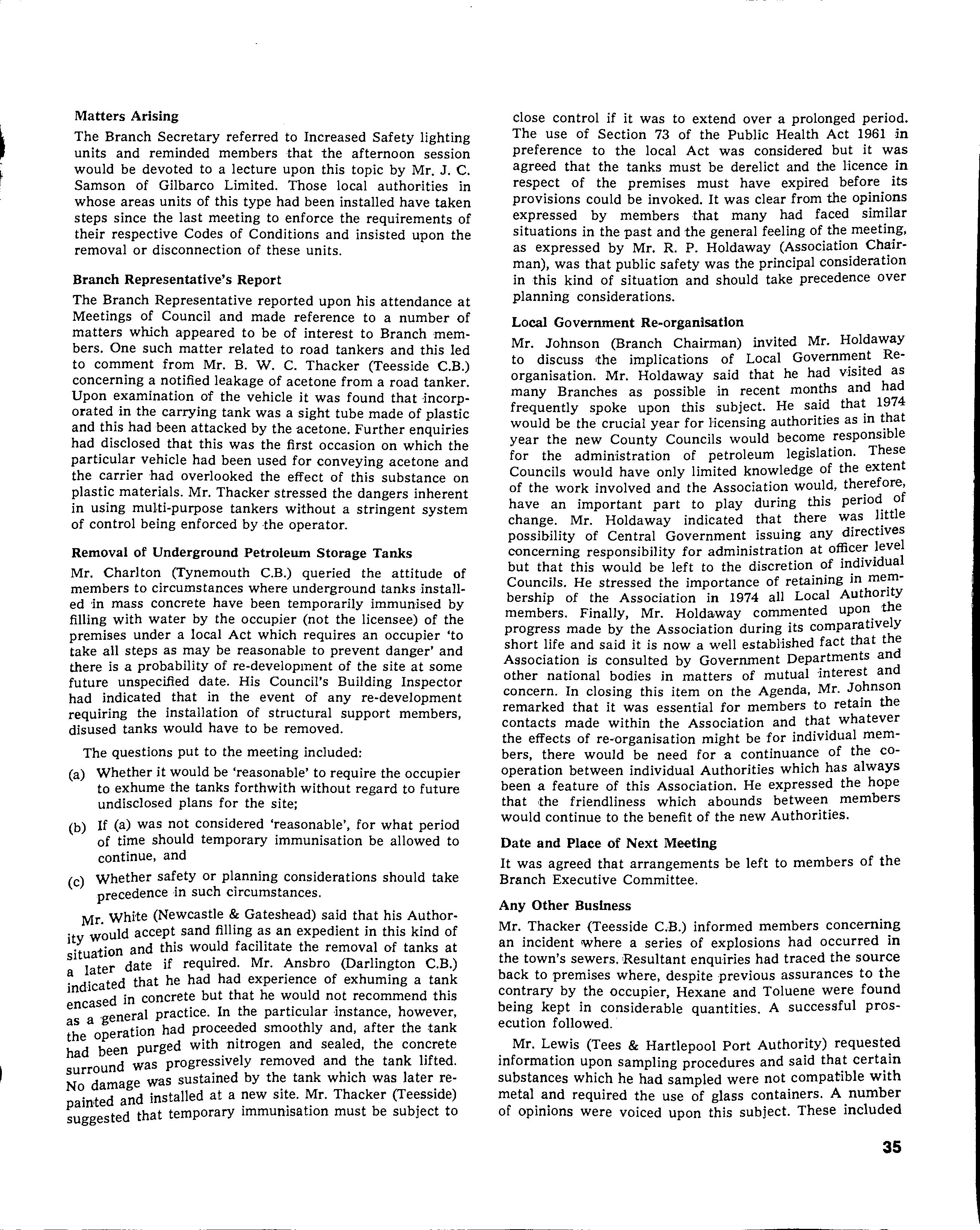 'The Local Government Act, 1972 designates County Councils and Metropolitan Counties as the Petroleum Authorities for the purposes of the Petroleum (Consolidation) Act, 1928, this may result in April, 1974 in officers not at the present time engaged on Petroleum Act Administration being actively engaged on these duties, and that in the interests of the future administration of petroleum legislation, an invitation be extended to those officers within the Branch area to attend future Branch meetings whenever it was felt that the subject matter would be of benefit to them'.