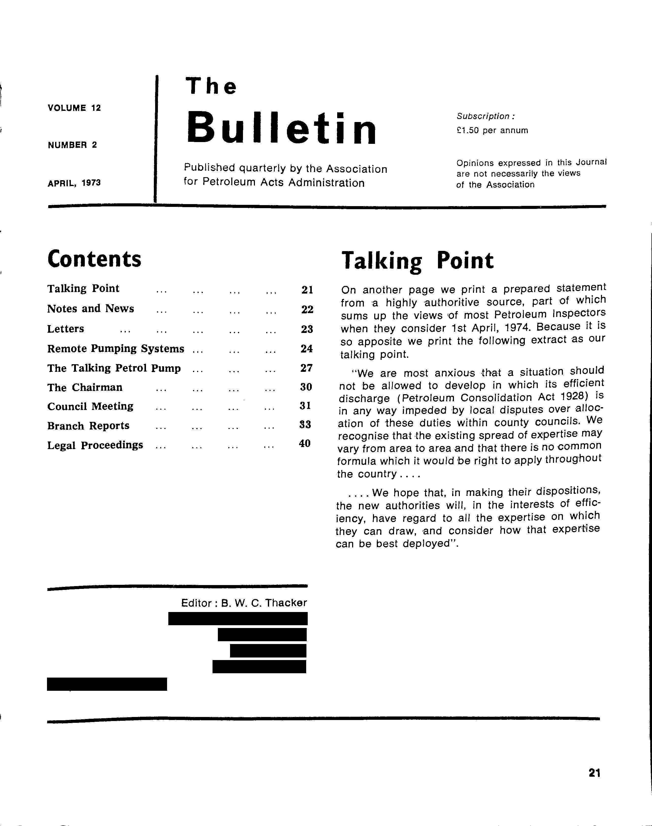 On another page we print a prepared statement from 'a highly 'authoritive source, part 'of which sums up the views 'of most Petroleum Inspe·ctors when they consider 1st April, 1974. Because it is so apposite we print the following extract 'as our talk'ing point.