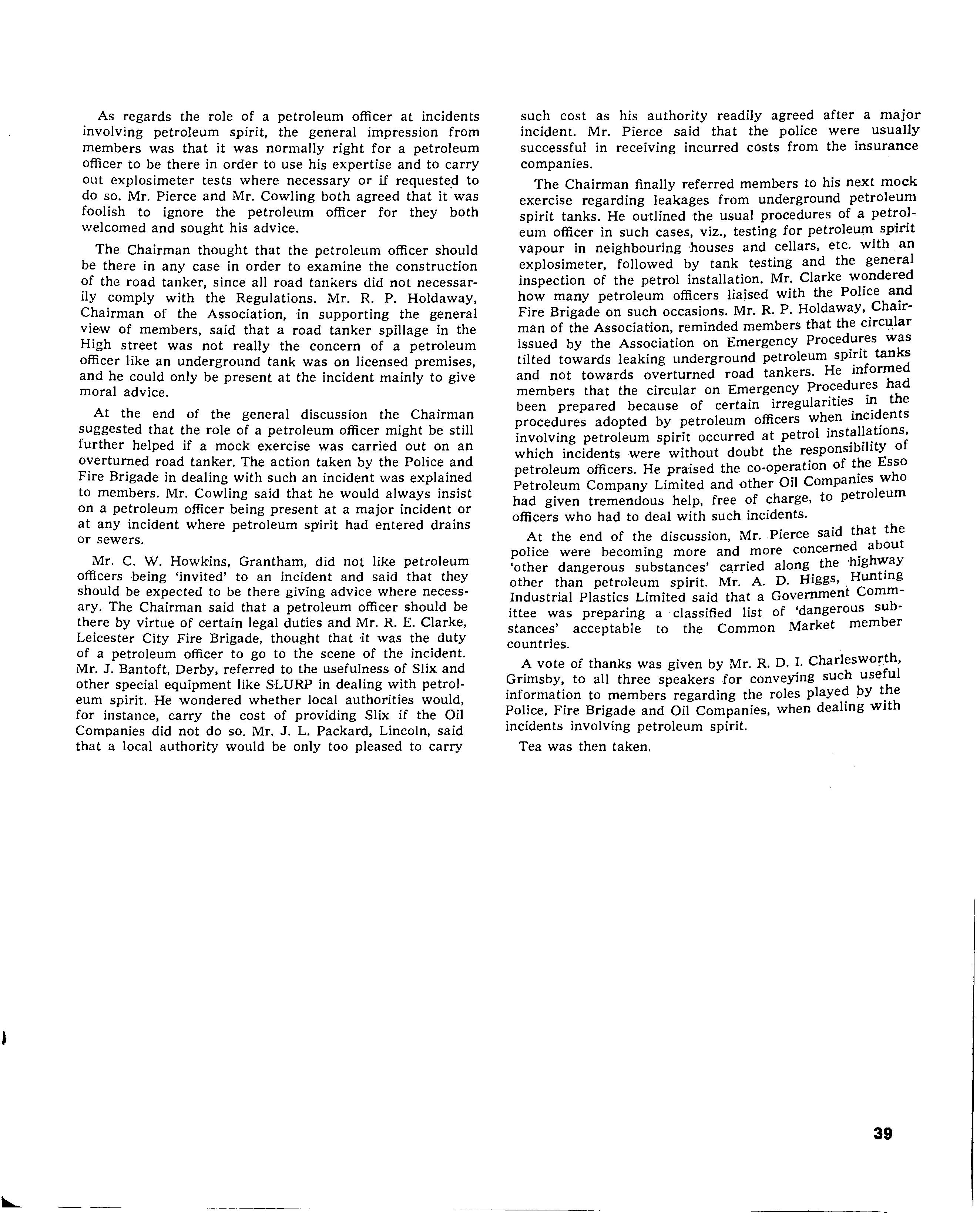 A vote of thanks was given by Mr. R. D. I. Charlesworth, Grimsby, to all three speakers for conveying such useful information to members regarding the roles played by the Police, Fire Brigade and Oil Companies, when dealing with incidents involving petroleum spirit.