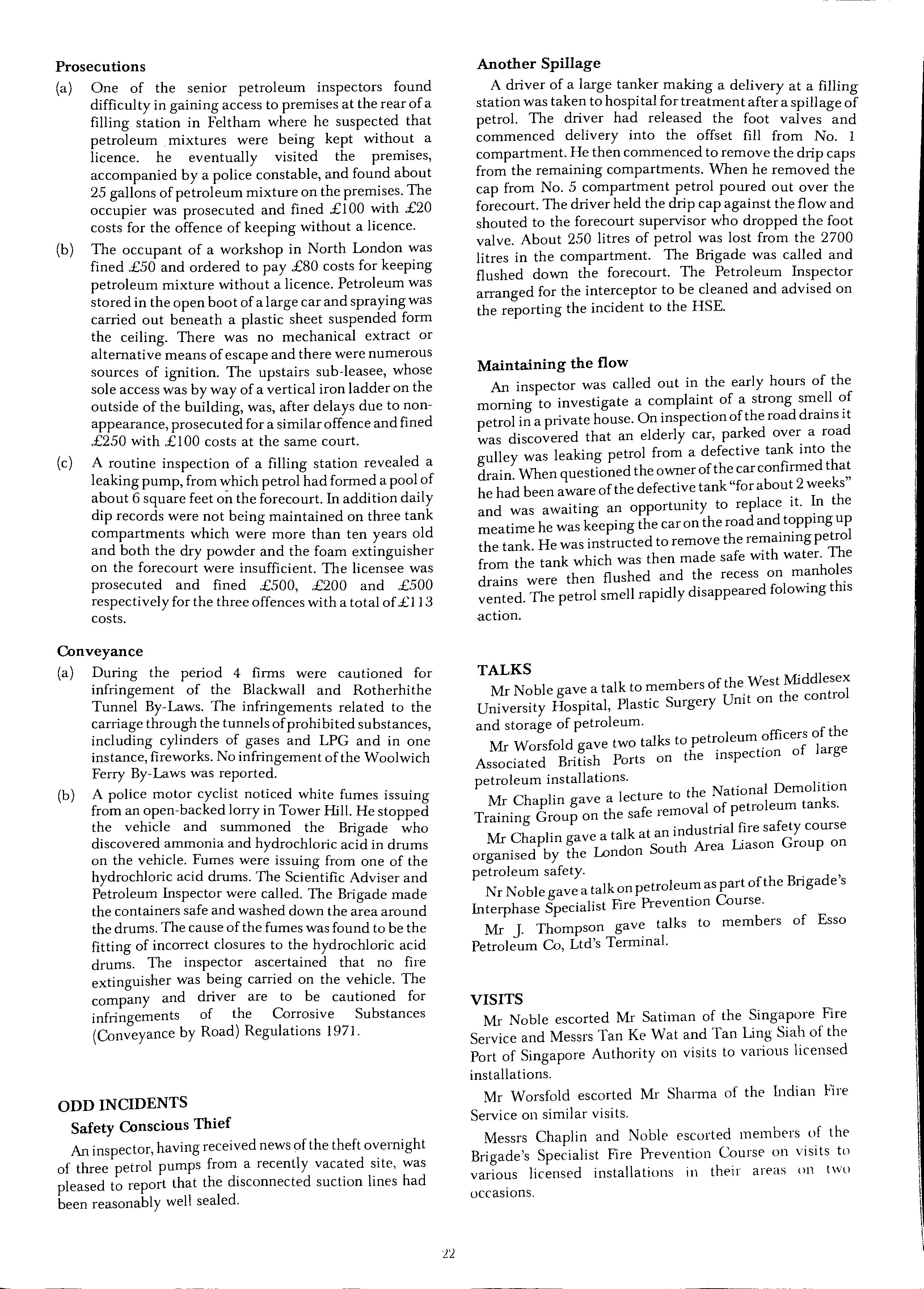 All Petroleum Officers carried out "casual" inspections when in the course of their duties they encountered vehicles carrymg petroleum spiri t. Casual inspections were Iimi ted to the examination of external fi ttings and labelling requirements but they did provide an important check on the observation of operational requirements.