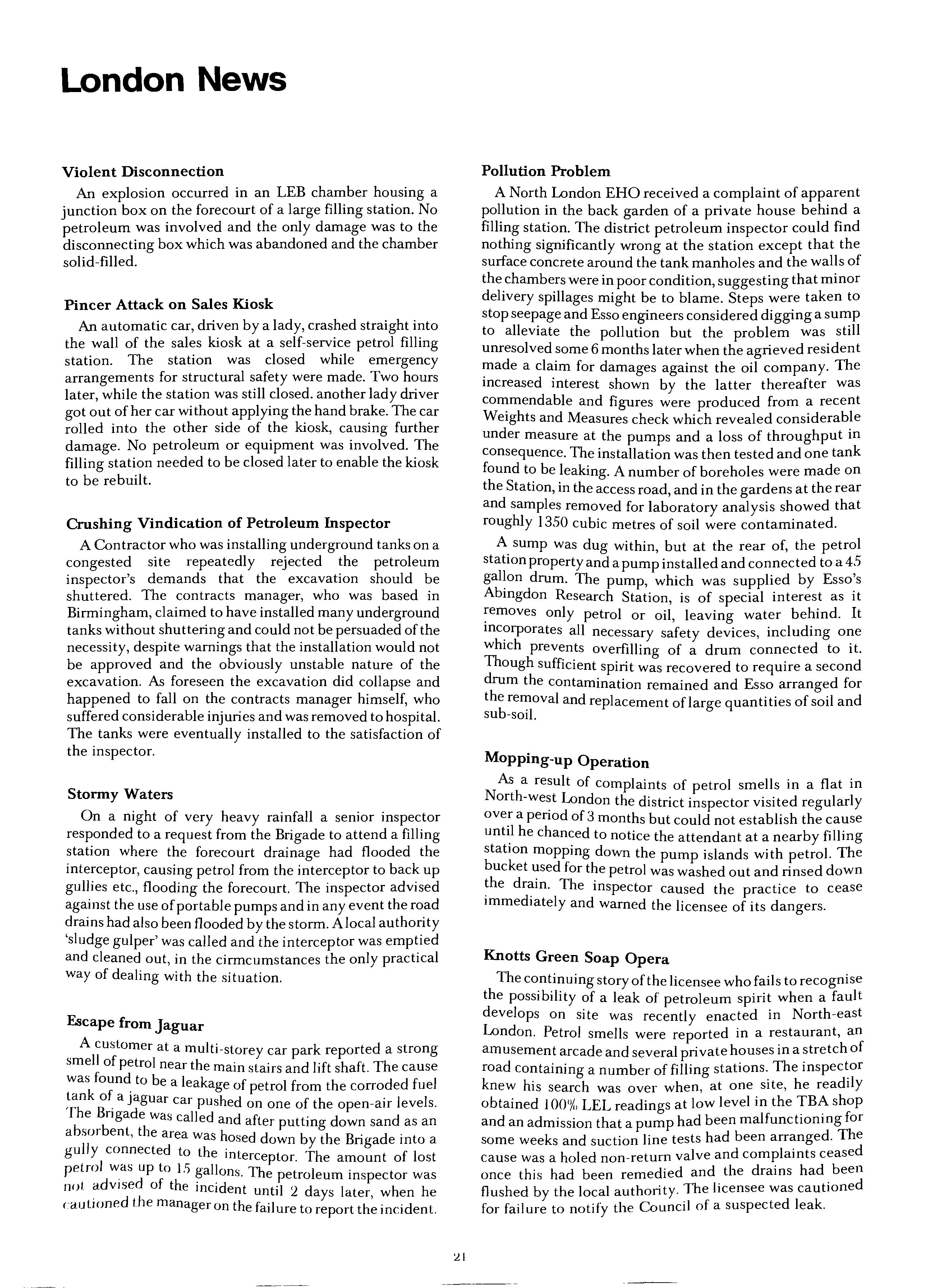 The continuing story of the licensee who fails to recognise the possibility of a leak of petroleum spirit when a fault develops on site was recently enacted in North-east London. Petrol smells were reported in a restaurant, an amusement arcade and several private houses in a stretch of road containing a number of filling stations. The knew his search was over when, at one site, he readIly obtained 100% LEL readings at low level in the TBA shop and an admission that a pump had been malfunctioning for some weeks and suction line tests had been arranged. The cause was a holed non-return valve and complaints ceased once this had been remedied and the drains had been flushed by the local authority. The licensee was cautioned for failure to notify the Council of a suspected leak.