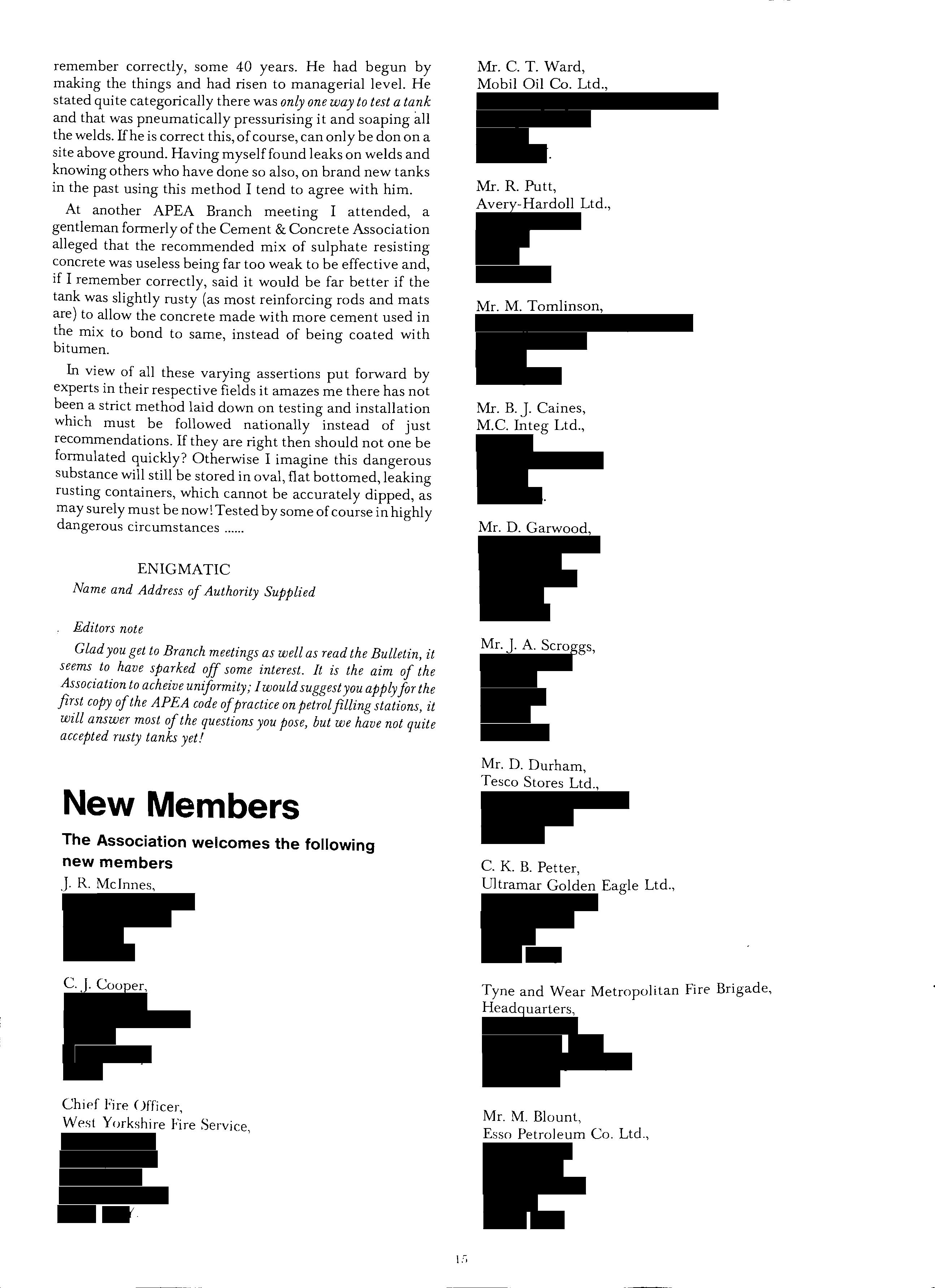 I had never heard of the of the which Mr. Caines highlighted in Ius paper 111 the last Bulletin causing complaints to his company .later whe.n di stick'readings were apparently inaccurate a IS w:ter filled as recommended. At previous meet1l1gs It has been alleged such a method tends to cause the tank togo oval. Were any tank manufacturers in on the diSCUSSIOns with the H.S.E.?