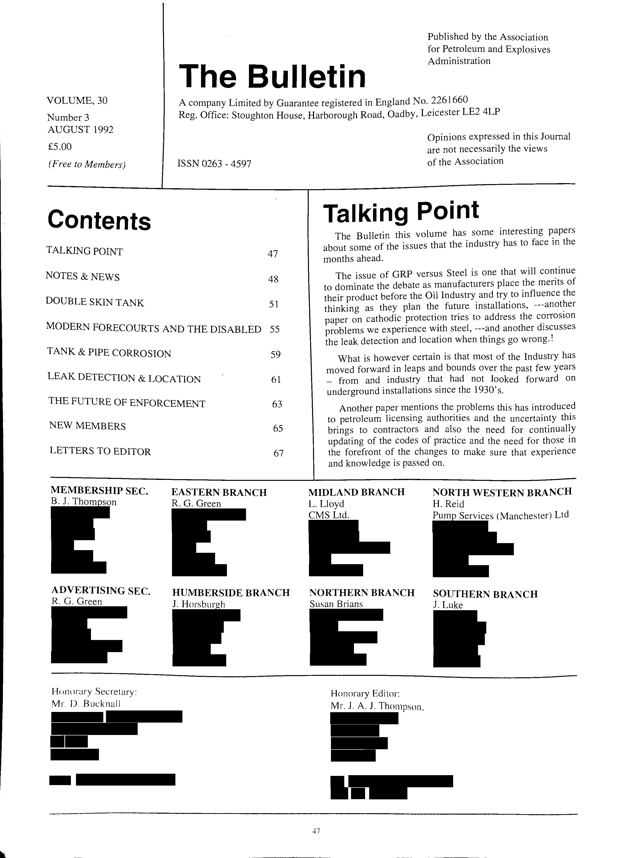 the Association for Petroleum and Explosives Administration VOLUME,30 Number3 AUGUST 1992 A company Limited by Guarantee registered in England No. 2261660 Reg. Office: Stoughton House, Harborough Road, Oadby, Leicester LE2 4LP £5.00 (Free to Members) ISSN 0263 4597 Contents TALKING POINT 47 NOTES &NEWS 48 DOUBLE SKIN TANK 51 MODERN FORECOURTS AND THE DISABLED 55 TANK & PIPE CORROSION 59 LEAK DETECTION & LOCATION 61 THE FUTURE OF ENFORCEMENT 63 NEW MEMBERS 65 LETTERS TO EDITOR 67 MEMBERSHIP SEC. EASTERN BRANCH B. J. Thompson R. G. Green ADVERTISING SEC. HUMBERSIDE BRANCH R. G. Green J. Horsburgh