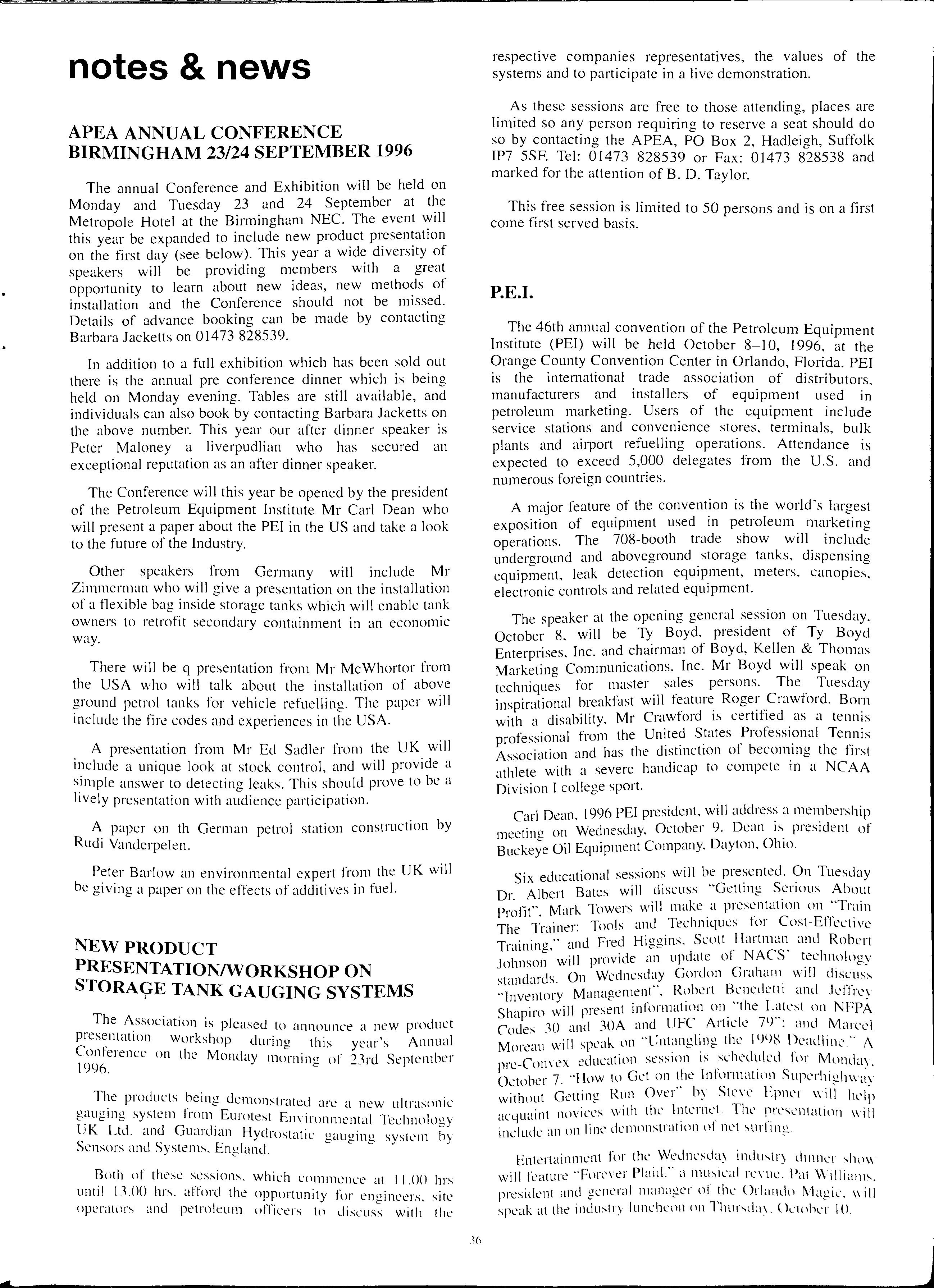 The 46th annual convention of the Petroleum Equipment Institute (PEI) will be held October 8-10, 1996, at the Orange County Convention Center in Orlando, Florida. PEI is the international trade association of distributors, manufacturers and installers of equipment used in petroleum marketing. Users of the equipment include service stations and convenience stores, terminals, bulk plants and airport refuelling operations. Attendance is expected to exceed 5,000 delegates from the U.S. and numerous foreign countries.