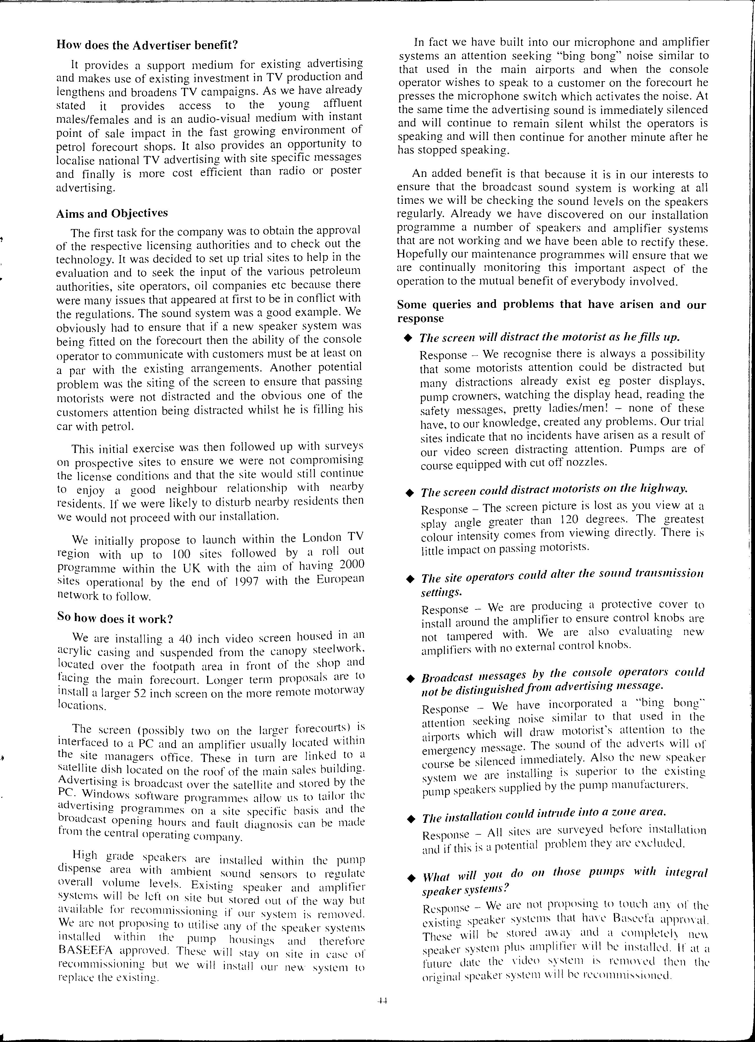 We have to s ay that la unchin g a new concept s uch as thi s has no t be e n easy and mi s take s have been made as we have worked tow ards the launch One of the frustration s in la unching any new product in the world of petrol stations has be e n the fact that there d oes not appear to be any ce ntral reg ulatory body who could perhaps offer an overall approval of the product. We often wonder how compani es obtain universal approval for a new forecourt " gizmo " that could in vo lve a pos s ibl e conflict with existing licenc e conditions which can of course vary throughout the UK
