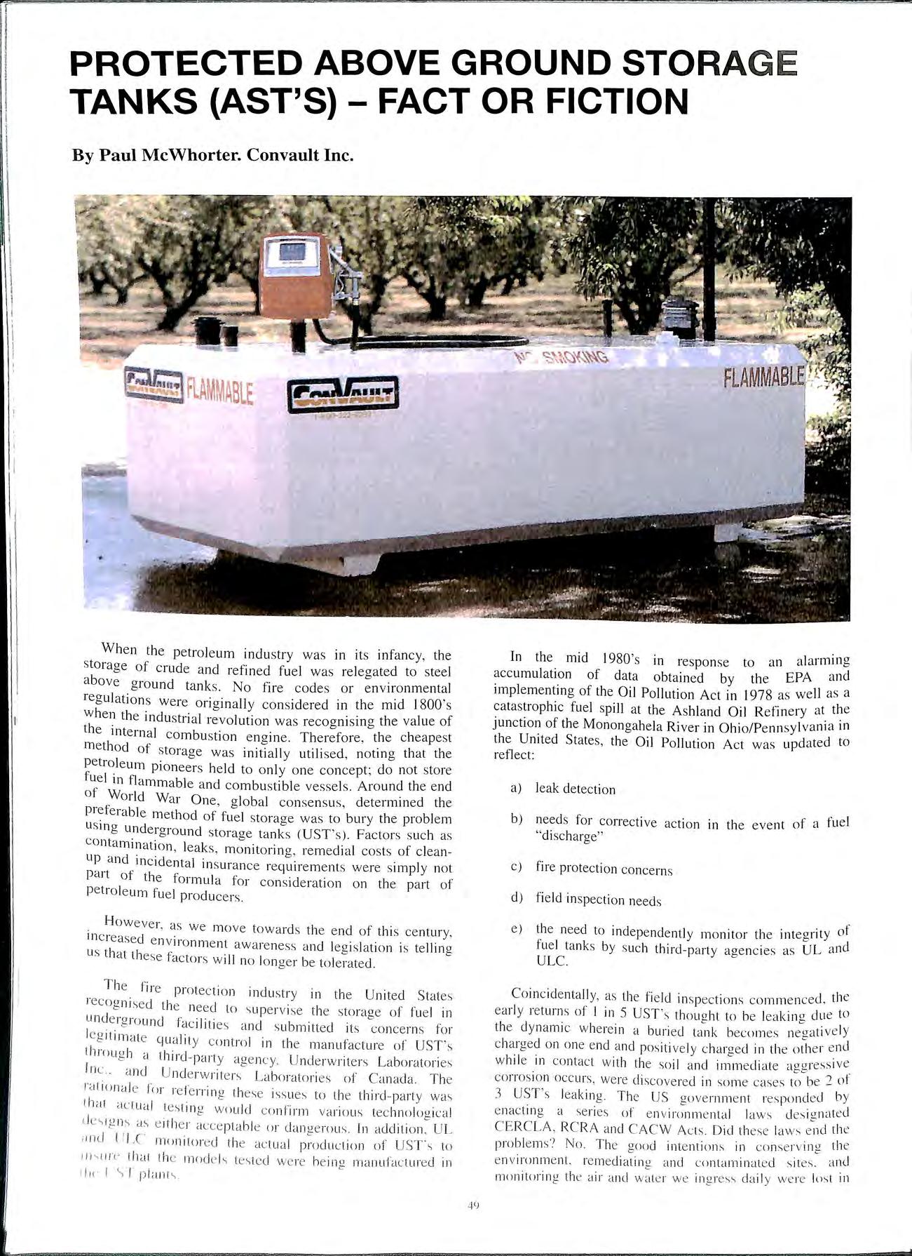 bureaucratic confusion and red-tape. A program implemented under the dubious acronym "LUST" for leaking/underground/storage/tanks did not correct the rate of leaks or contamination. Ultimately, environmental and fire protection authorities consolidated these plans into statewide or provincial actional plans. A consistent theme resulted: the regulatory authorities longed for technology which would be readily visible for leak detection but would resist the danger of fire, vehicle impact and ballistic incursions (vandalism). Into this demand came the new vaulted above ground storage tank technology. In 1986, the first vaulted assembly. the Con Vault AST was development and patent protection filed prior to introduction into the market place. The response was immediate and significant; the technology which incorporated an inner (Primary) steel tank within a poly membrane which was subsequently entombed in a I 50mm thick reinforced concrete vault without seams met all the regulatory requirements. This technology was submitted to the Underwriters Laboratories Inc. and the Underwriters Laboratories of Canada for severe testing and earned all of the strictest "listings" for storage of flammable and combustible liquids by both agencies. The overall "listing·· represents the fact that UL and ULC conducted severe preliminary tests on an assembly and that the model being purchased by the customer is being built to the precise specifications of the original unit tested by a series of fire exposures. vehicle impacts and projectile (ballistics) investigations. Con Vault Inc including the latest licensed manufacturers: Breton Precast Ltd (United Kingdom) and Breton Roecrete Ltd (Republic of Ireland) has installed over 16.000 AST sites globally in all 50 states of the United States. every province of Canada, Panama. Puerto Rico, Guam. West Africa. USSR. Virgin Islands. Mexico. Ireland and Wales without a single system failure/any petroleum discharge.