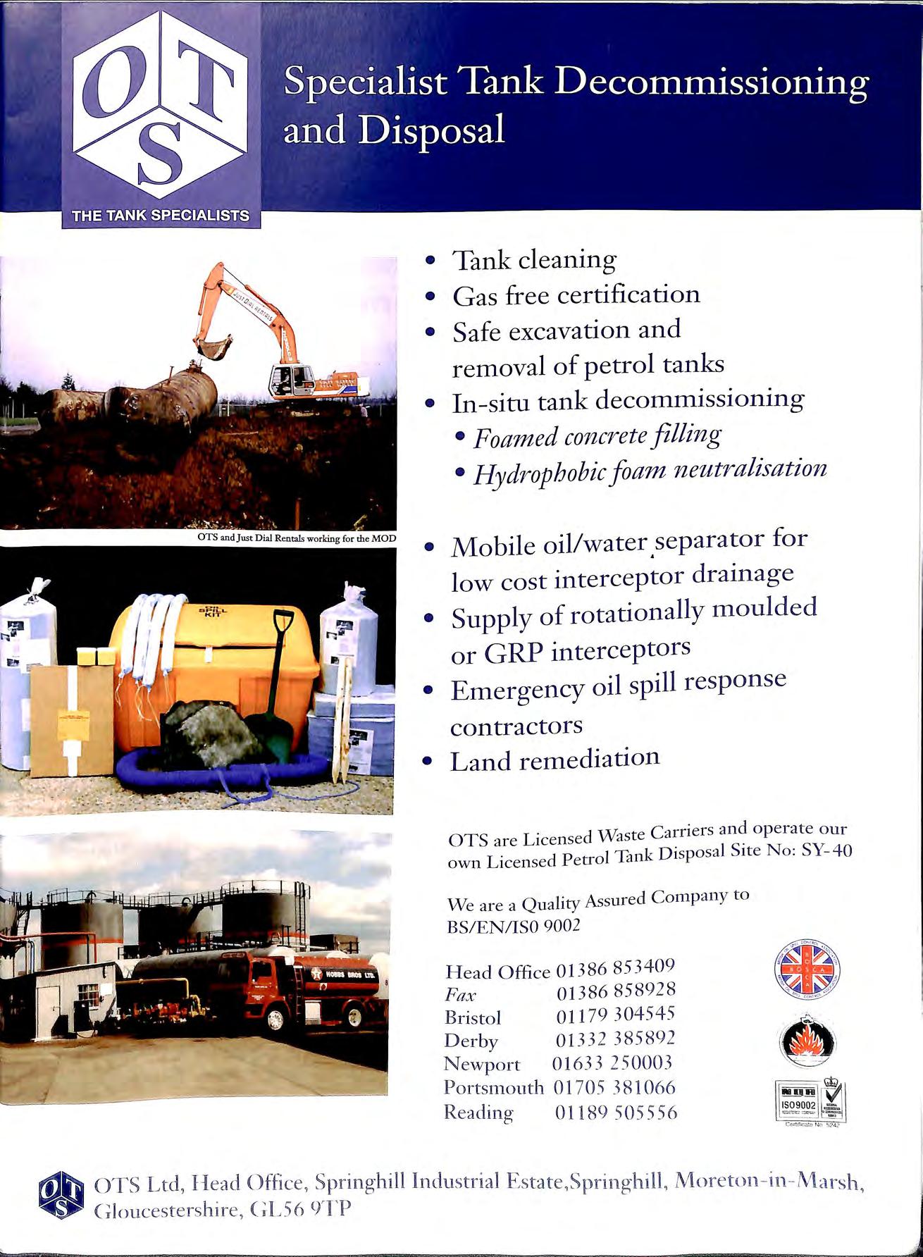 • Tank cleaning • Gas free certification • Safe excavation and removal of petrol tanks • In-situ tank decommissioning • Foamed concrete filling • Hydrophobic foam neutralisation • Mobile oil/water separator for . low cost interceptor drainage • Supply of rotationa lly moulded or GRP interce p tors • Emergency oi l spi ll response contractors • Land remediation OTS are Licensed Waste Carriers and operate our own Licensed Petrol Tank Disposal Site No: SY-40 \Ve are a Quality Assured Company to ES/EN/ISO 9002 Head Office 01386 85340 9 Fax 01386 858928 B r istol 011 79 304545 Derby 01 332 385892 Newport 01 633 25 0003 Por tsmo uth 01 705 381066 Reading 0118 9 505556 OTS L t d, I-lead Office, Springhill l ndustrial Estate,Springhill, Moreton in Marsh c;Jo ucestershire, (;L 56 9rfp '