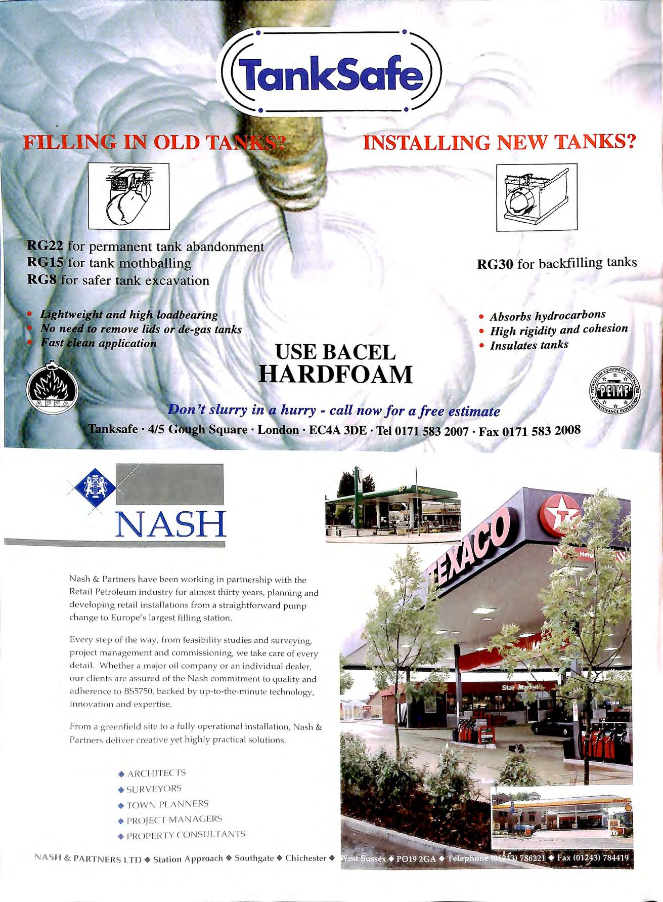 INSTALLING NEW '.ANKS? or safer tank excavation htweig t and high loadbearing remove lids or de-gas tanks applicatio"'f USEBACEL HARD FOAM RG30 for backfilling tanks • Absorbs hydrocarbons • High rigidity and cohesion • Insulates tanks on 't slurry in a hurry call now for a free estimate ..;.twlian Square · London · EC4A 3DE · Tel 0171 583 2007 · Fax 0171 583 2008 ' ' / NASH N a s h & Pa rh1 e rs h av e b ee n wo r kin g in pa r tne rs hip w ith th e Re ta il Pe t ro le um indu s t ry fo r a lm os t th irty ye a rs, pl a nnin g a nd d eve lo pin g re tai l in s ta lla tio ns fr o m a s tra ig ht fo rward pum p c h a n ge to E u ro p e' s la rges t fil lin g s ta ti o n. Eve ry s te p o f th e wa y , fro m fea s ib il it y s tud ies a nd s ur vey in g, p ro1ec t m a n a ge m e n t a nd co mmi ss io n in g, we take ca re o f e ve ry d e ta il. W h e th e r a m a jo r o il co m pa ny o r a n ind ividu a l d ea le r, o u r cl ie n ts a re ass ur e d o f the N as h co mmi tm e nt to q u a lity a n d
