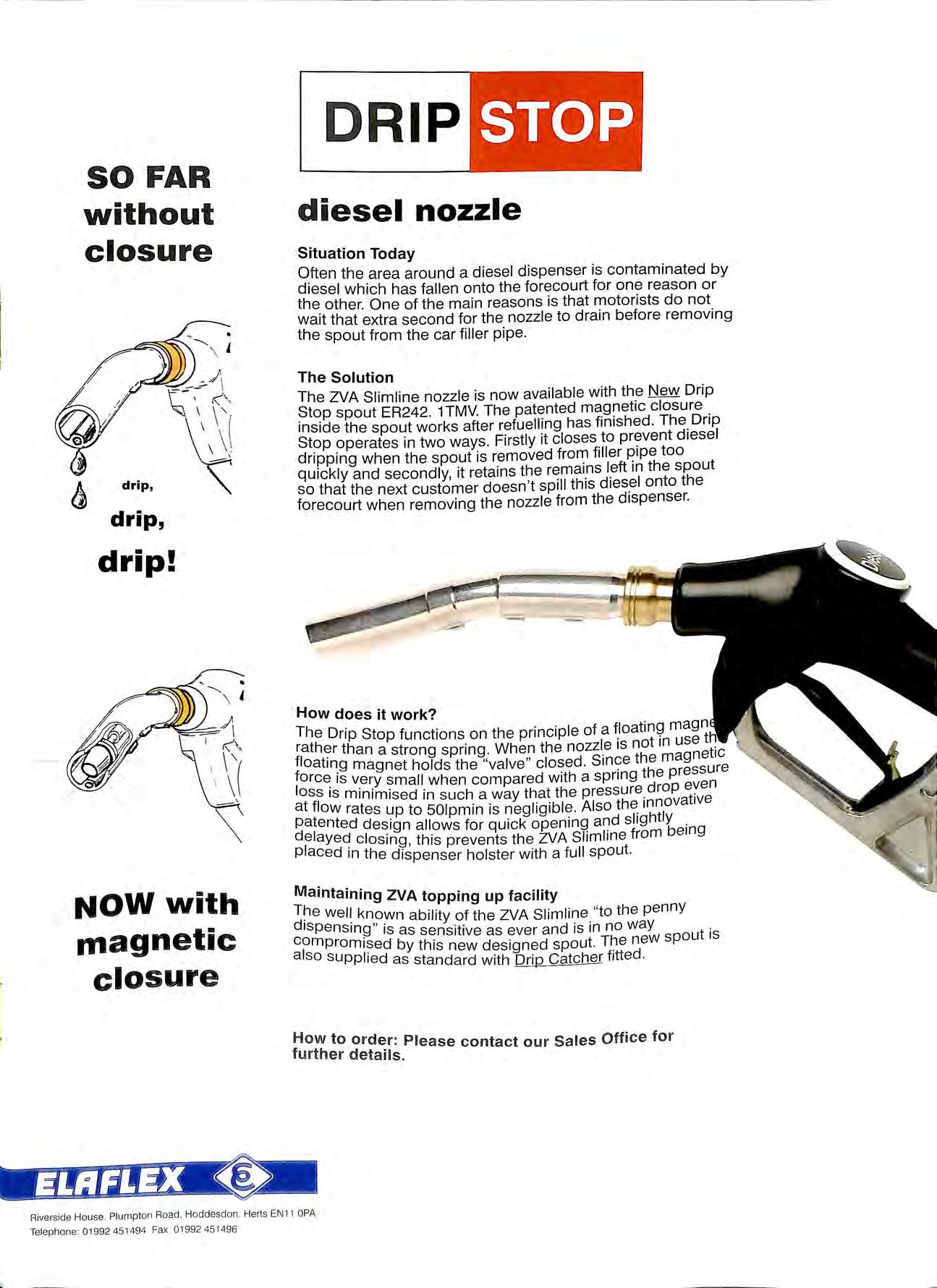 The Z.VA Slimline nozzle is now available with the New Drip Stop spout ER242. 1TMV The patented magnetic closure inside the spout works after refuelling has finished The_Drip Stop operates in two ways. Firstly it closes.to diesel dripping when the spout is removed tror:i filler pipe too quickly and secondly, it retains the rema1_ns left 1n the spout so that the next customer doesn 't spill this diesel onto the forecourt when removing the nozzle from the dispenser.