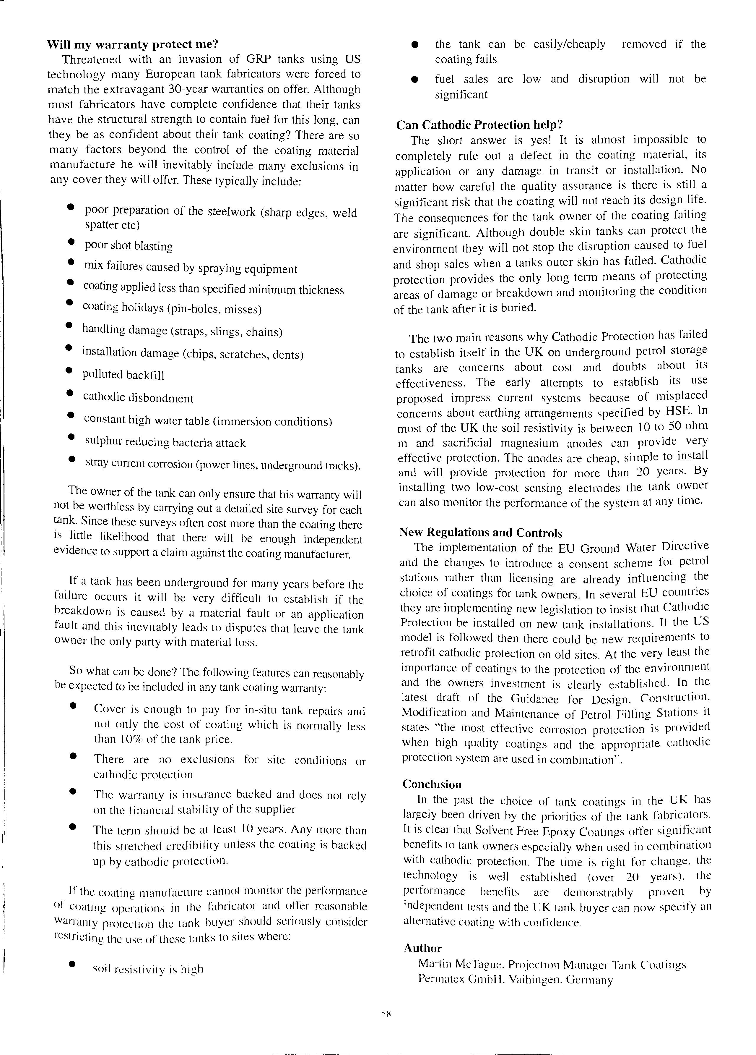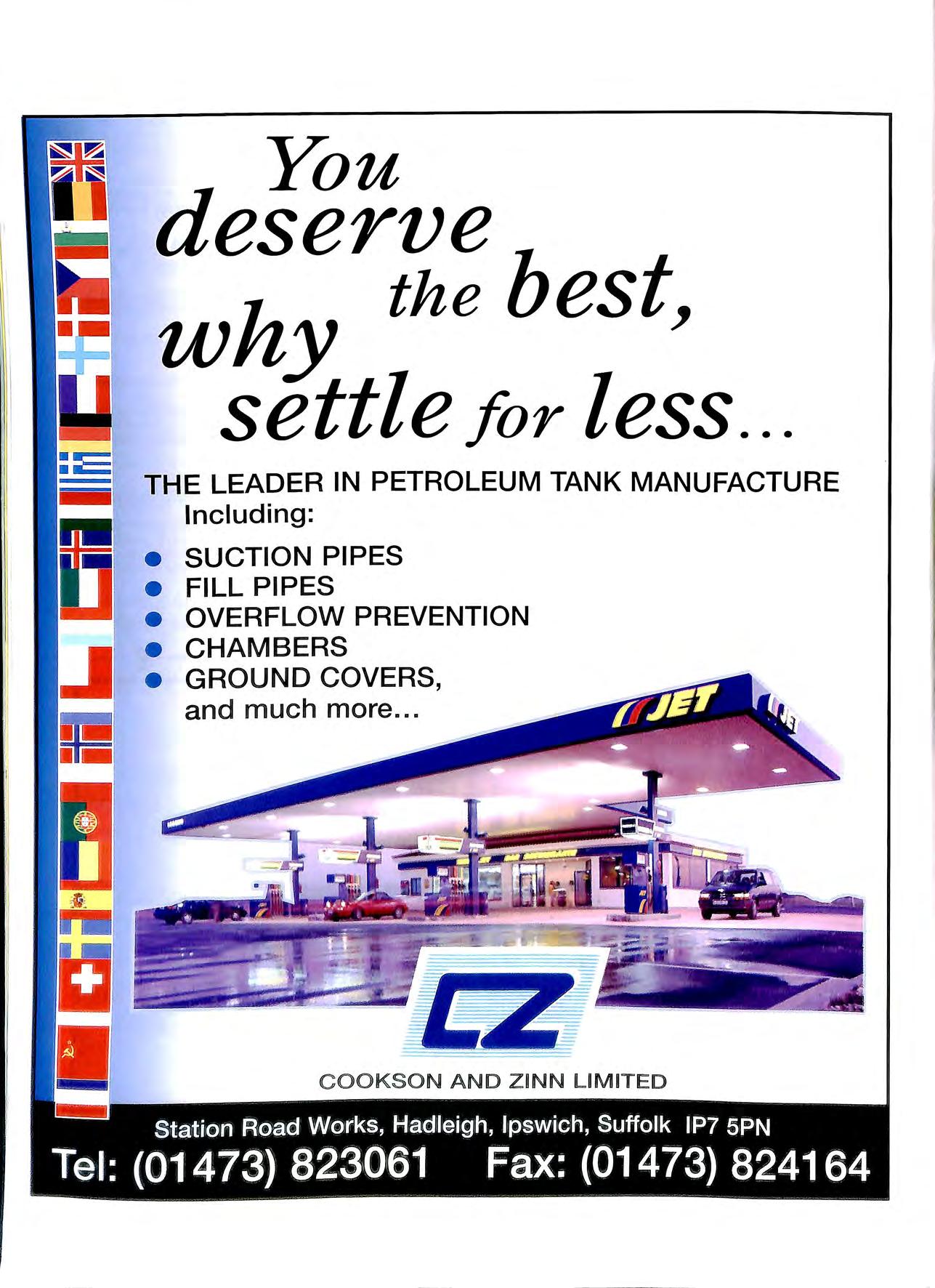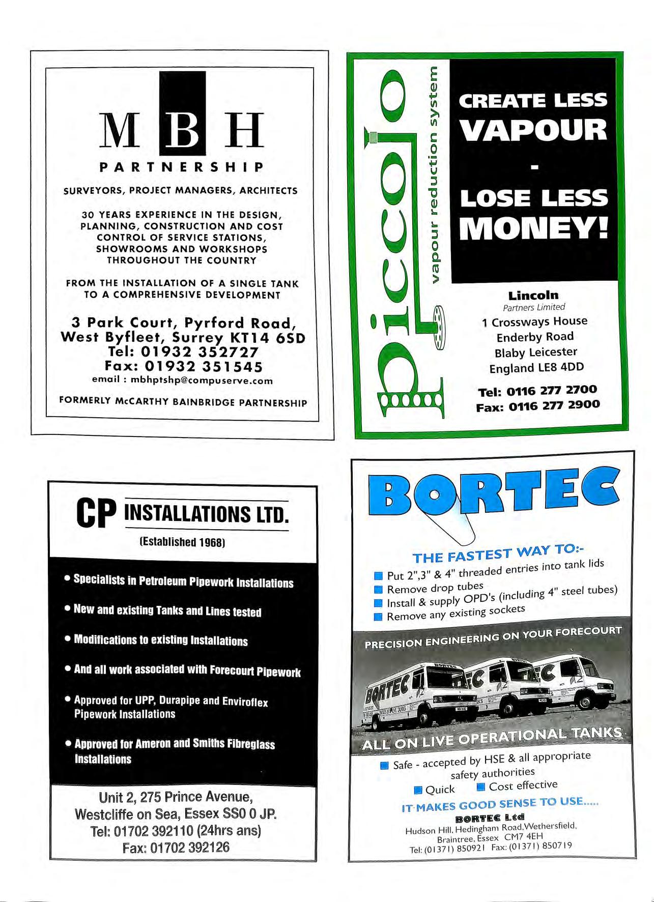M H PARTNERSHIP SURVEYORS, PROJECT MANAGERS, ARCHITECTS 30 YEARS EXPERIENCE IN THE DESIGN PLANNING, CONSTRUCTION AND COST CONTROL OF SERVICE STATIONS SHOWROOMS AND WORKSHOPS THROUGHOUT THE COUNTRY FROM THE INSTALLATION OF A SINGLE TANK TO A COMPREHENSIVE DEVELOPMENT 3 Park Court, Pyrford Road West Byfleet, Surrey KTl 4 6SD Tel: 01932 352727 01932 351 545 email : mbhptshp @compuserve.com FORMERLY McCARTHY BAINBRIDGE PARTNERSHIP Cp INSTALLATIONS LTD. (Established 1968) • Specialists in Petroleum Pipework Installations • New and existing Tanks and Lines tested • Modifications to existing Installations • And all work associated with Forecourt Pipework • Approved for UPP, Durapipe and Enviroflex Pipework Installations • Approved tor Ameron and Smiths Fibreglass Installations Unit 2, 275 Prince Avenue Westcliffe on Sea, Essex SSO oJP, Tel: 01702 392110 (2 4hrs ans) Fax: 01702 392126 0 0 u u E Q) +" VI )I VI c: 0 +" u :::i "O Q) :... :... :::i 0 c. !U > CREATE LESS VAPOURLOSE LESS MONEY! Lincoln Partn ers Limited 1 Crossways House Enderby Road Blaby Leicester England LES 400 Tel: 0116 277 2700 Fax: 0116 277 2900 TEC THE FASTEST WAY TO :• Put 2" ,3" & 4" threaded entries into tank lids • Remove drop tubes 11 • Install & supply OPD's (including 4 steel tubes) • Remove any existing sockets Ill Safe accepted by HSE & all app rop r iat e safe ty a ut ho ri tie s Ill Qui c k • Cos t e ff e ct ive iT MAKES GOOD SEINSIE TO USE ..... BORTEC Ud H udso n Hi ll , H ed ingham Road ,Wether sfie ld Bra intree , Ess ex CM? 4 EH Te l: (0 137 1) 85092 1 Fax: (0137 1) 850 7 19