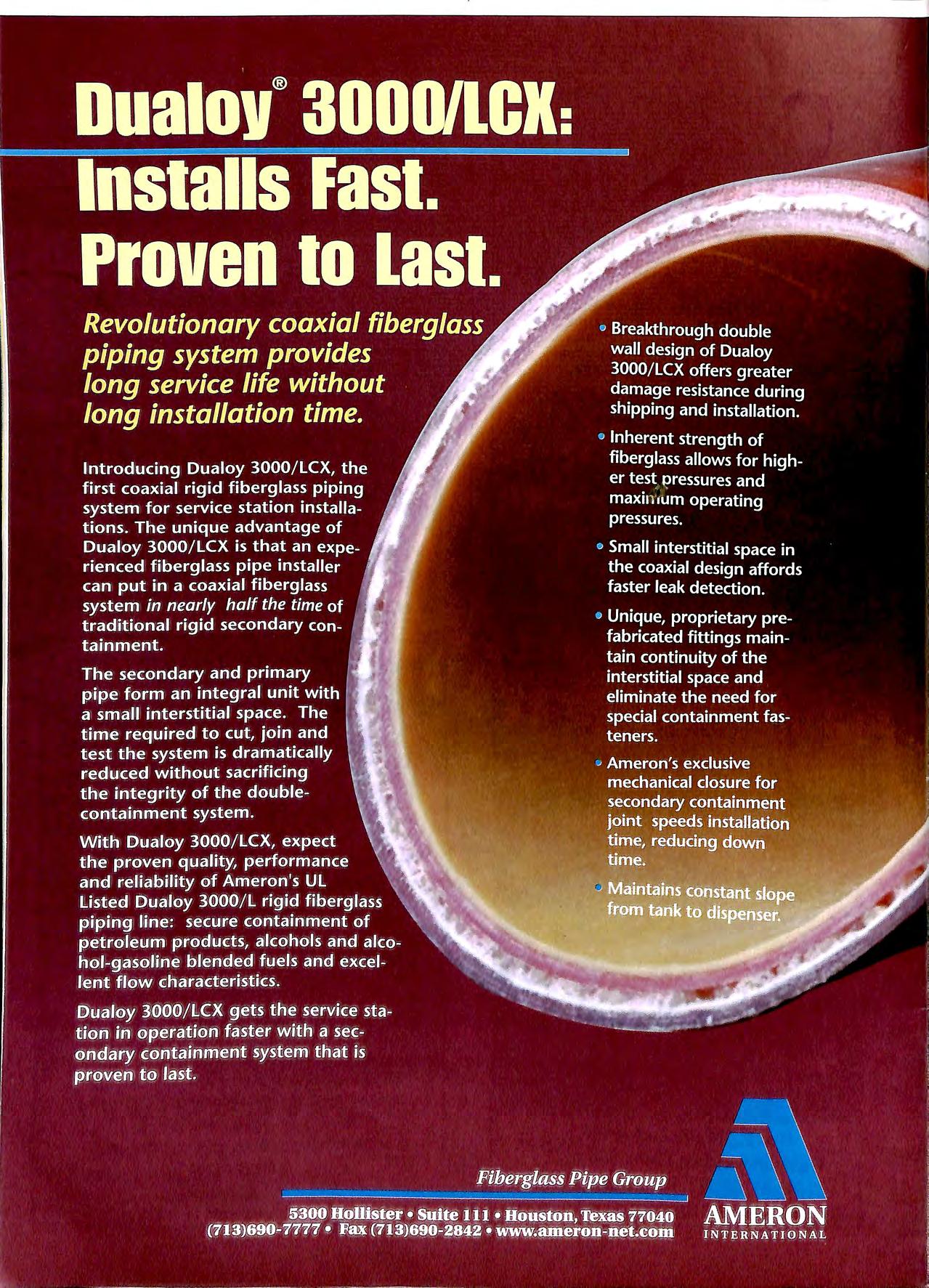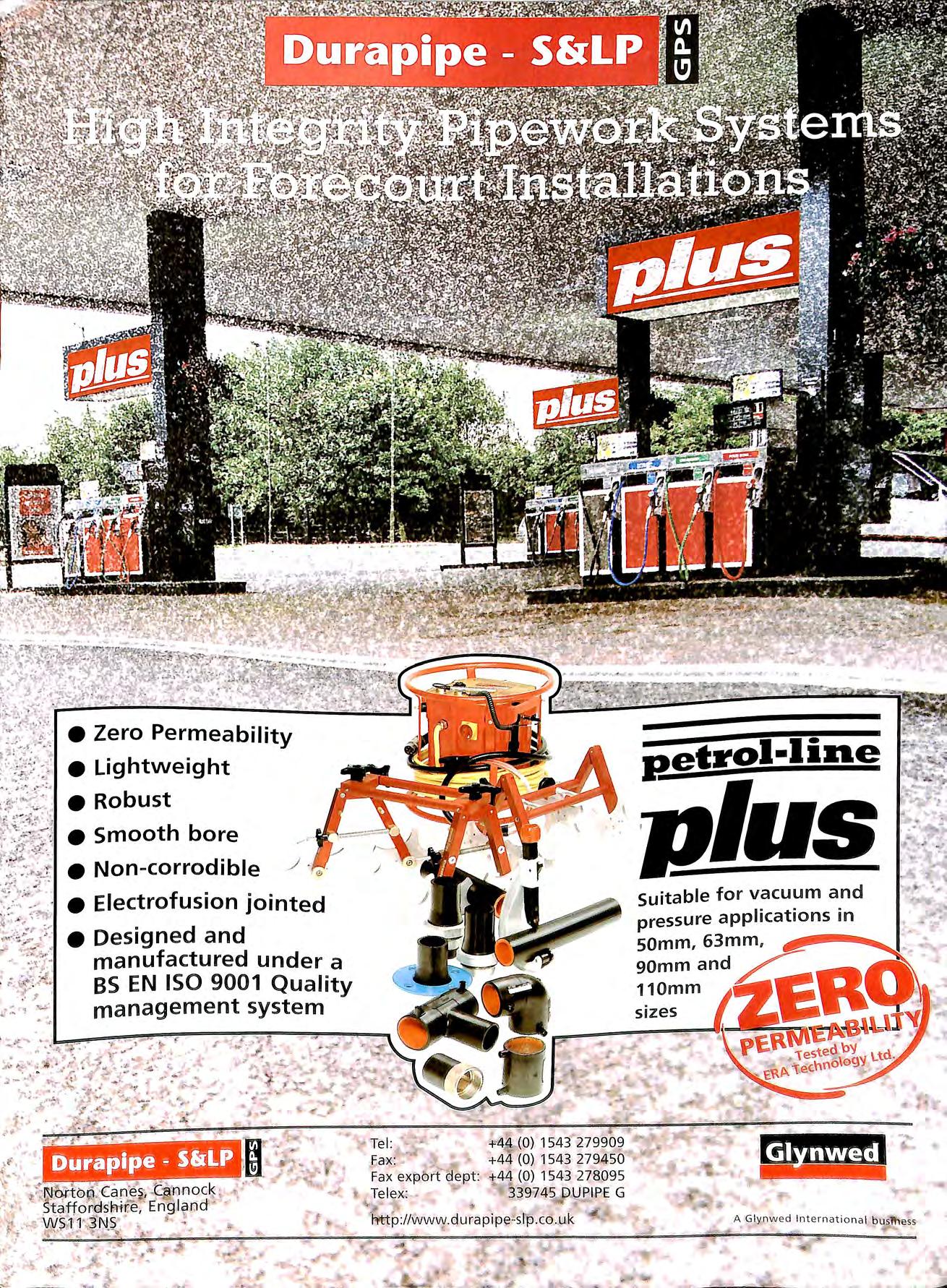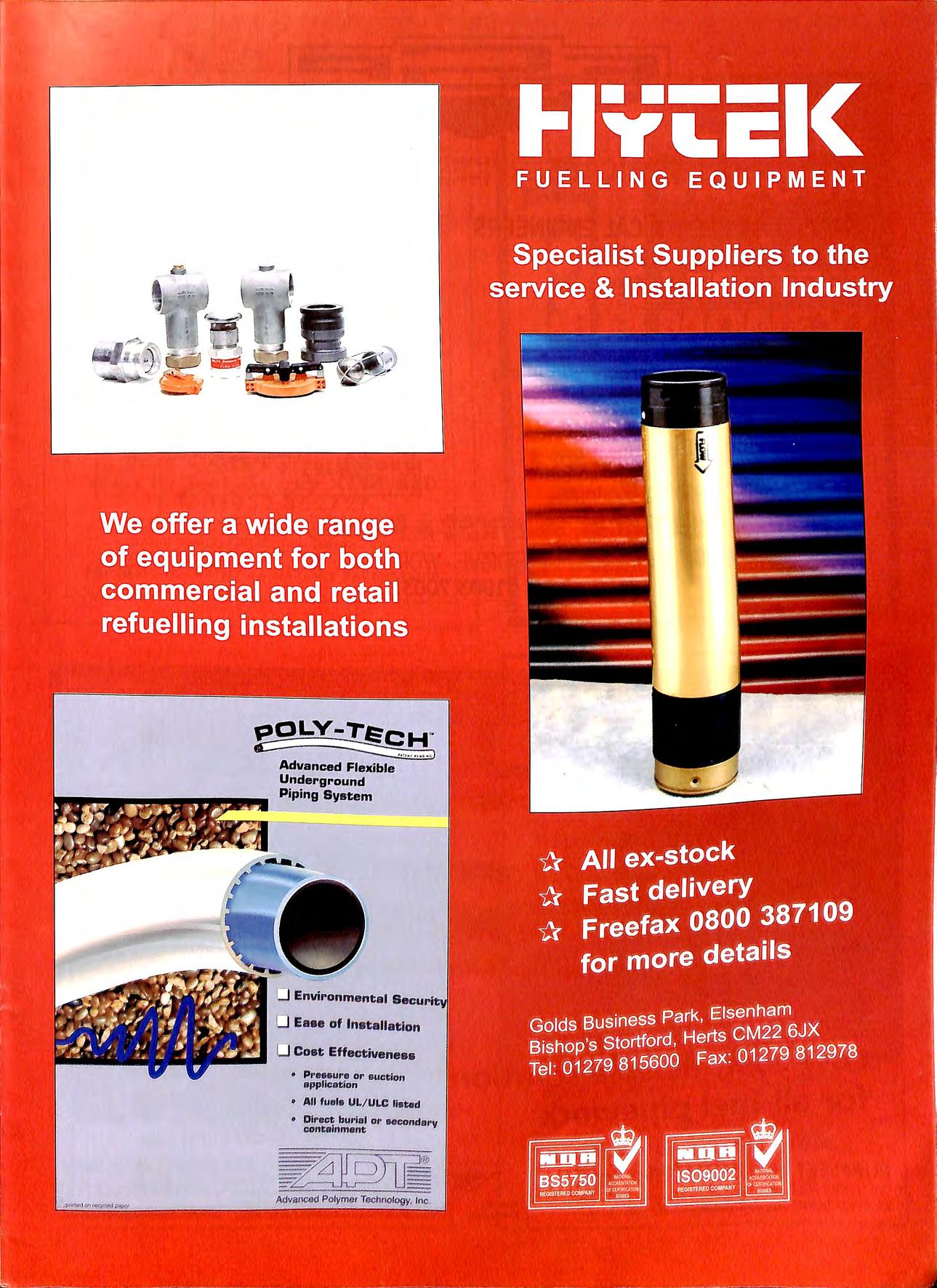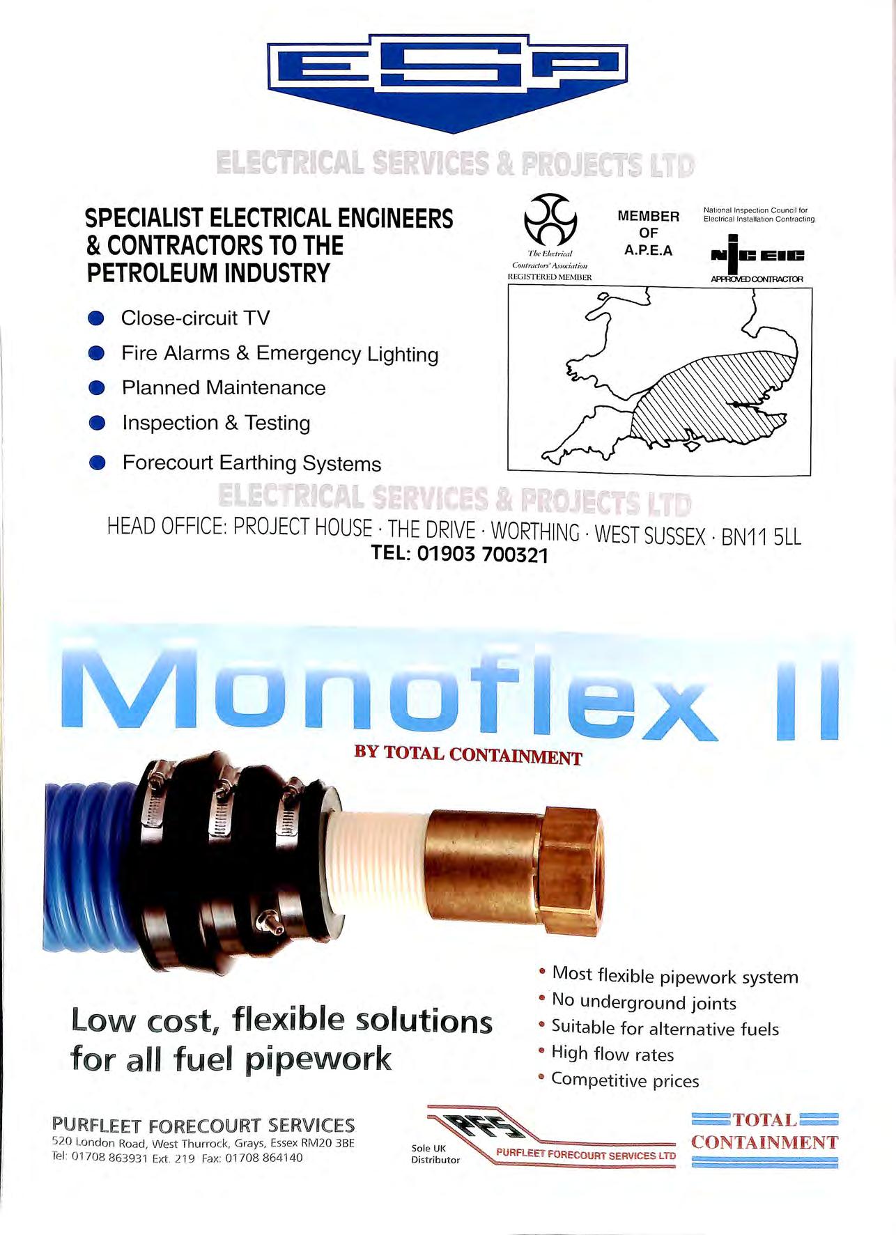 SPECIALIST ELECTRICAL ENGINEERS &CONTRACTORS TO THE PETROLEUM INDUSTRY • Close-circuit TV e Fire Alarms & Emergency Lighting • Planned Maintenance • Inspection & Testing • Forecourt Earthing Systems nX! Ekctriml Co11tn1c/ors' Anoci11lio11 IUGIS H :llED MEri.UJEH MEMBER OF A.P.E A National Inspec tion Council for Electrical Ins tallation Contracting HEAD OFFICE: PROJECT HOUSE ·THE DRIVE ·WORTHING ·WEST SUSSEX· BN11 SLL TEL: 01903 700321 BY TOTAL CONTAINMENT Low cost, flexible solutions for all fuel pipework • Most flexible pipework system • No underground joints • Suitab le for alternative fuels • High flow rates • Competitive prices PUIRFlEET FORECOURT 520 London Road, West Thurrock, Grays, Essex RM20 3BE Te l 01708 863931 Ext 219 Fax 01708 864140 Sole UK TOTAL CONTAINMENT Distributor PURFLEET FORECOURT SERVICES LID