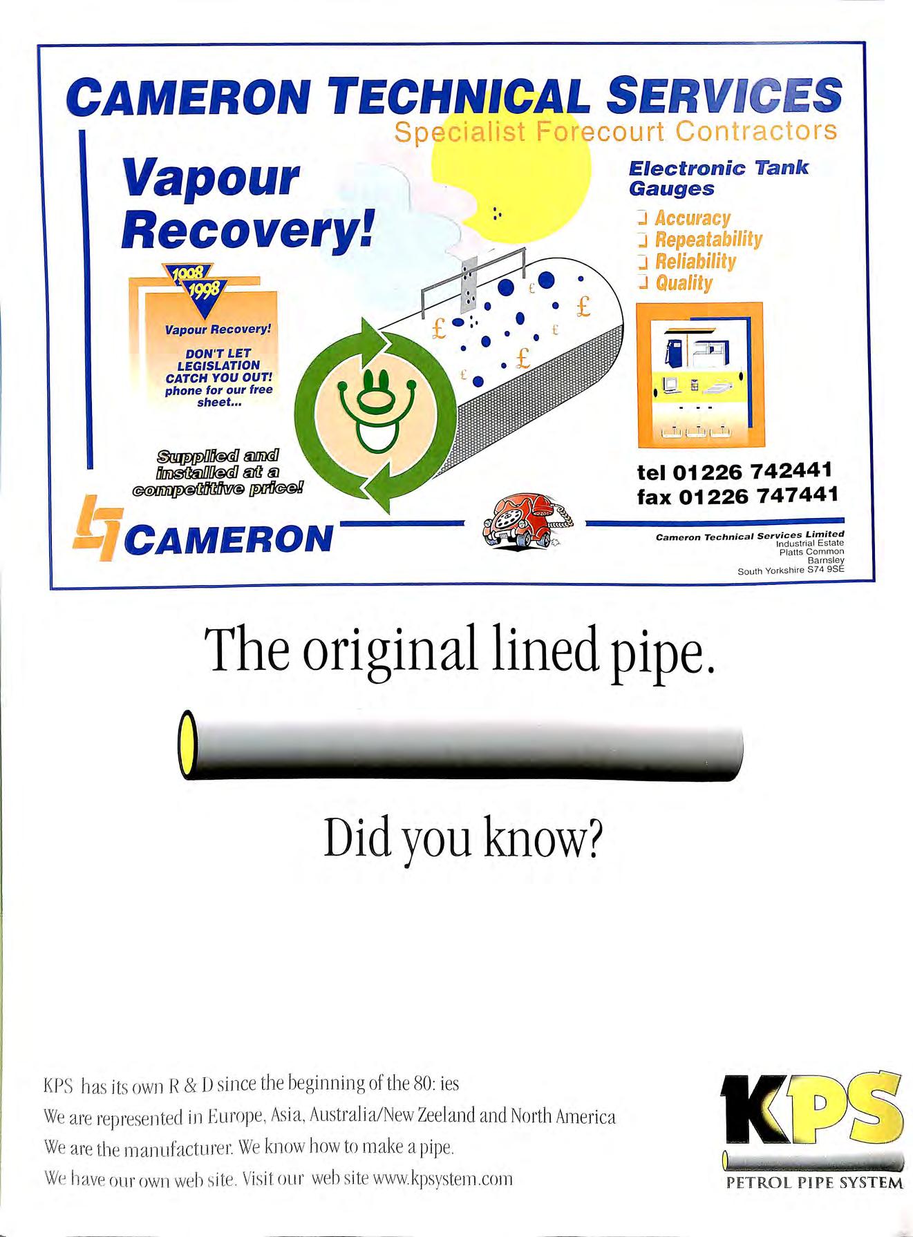 CAMERON TECHNICAL SERVI S Sp ecourt Contractors Vapour 1 Recovery! Vapour Recovery! DON ' T LET LEGISLATION CATCH YOU OUT! phone tor our free sheet ••• t;CAMERON-. .. Elec tronic Tank Ga uges J Accuracy J Repeatability J Reliability J Quality tel 01226 742441 fax 01226 747441 Cameron Technical Services Limited Industrial Es tate Platts Common B a rn sley Sou th Yo rksh ire S74 9SE The original lined pipe. Did you know?
