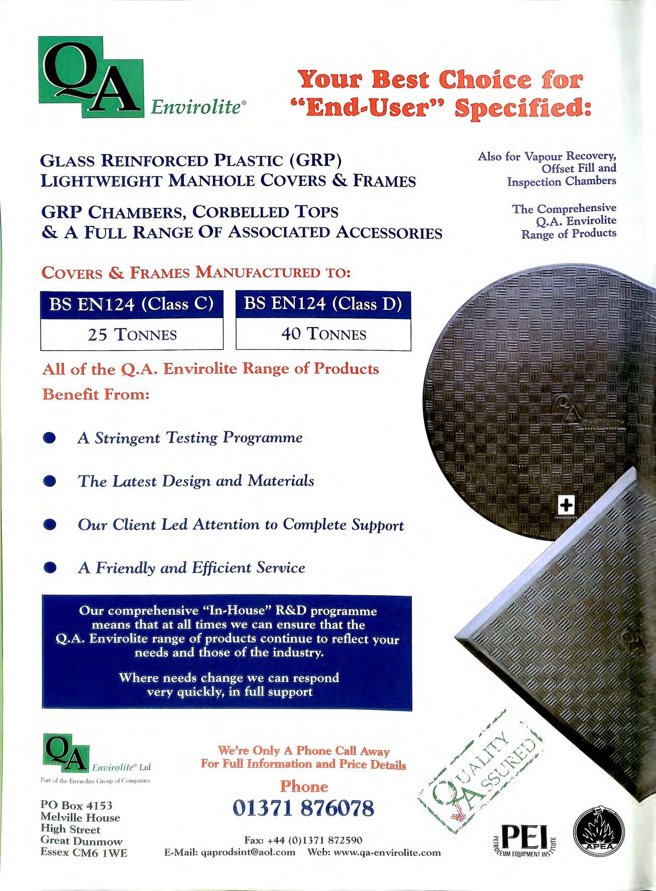 Your Be Envirolite ® ... End-Use 9 GLASS REINFORCED PLASTIC (GRP) LIGHTWEIGHT MANHOLE COVERS & FRAMES Also for Vapour Recovery, O ff set Fill and I n spection Chambers GRP CHAMBERS, CORBELLED TOPS & A FULL RANGE OF ASSOCIATED ACCESSORIES T h e Comprehensive Q A. Envirolite Range of Product s COVERS & FRAMES MANUFACTURED TO: BS EN124 (Class D) 40 TONNES All of the Q .A. Envirolite Range of Produ c ts Bellllefit From: e A Stringent T esting P rogram me e The Latest Design and Ma te rials e Our Client Led Attention t o Co m plete Support e A Friendly and Efficient S e rvice Our comprehensive "In-House" R&D programme means that at all times we can ensure that the Q.A. Envirolite range of products continue to reflect your needs and those of the industry. Where needs change we can respond very quickly, in full support En v iro lite® Lid / / ' ', _ / ,..:-:>' We'il'e Oruy A Phone Ca.M Away / ,,...)- • ,..;\y 4 ' For lFullll fofolt'JIT1llattion and! Price Detafills /_ · '\'· ,._ Pa n of lhc En v1ro li rc C roup o f C'..o mp;m rcs PO Box 4153 Melville House High Street Great Dunmow Essex CM6 1WE P lhom.e ,, · v,':Y';> , J l ,1 "/ 0137 1 87 6078 °'' Fax: +44 (0) 1371 872590 ::; E-Mail: qaprodsint@aol.com Web: www.qa-envirolite.com '?EuM EQUIPMENT 1NS"" •