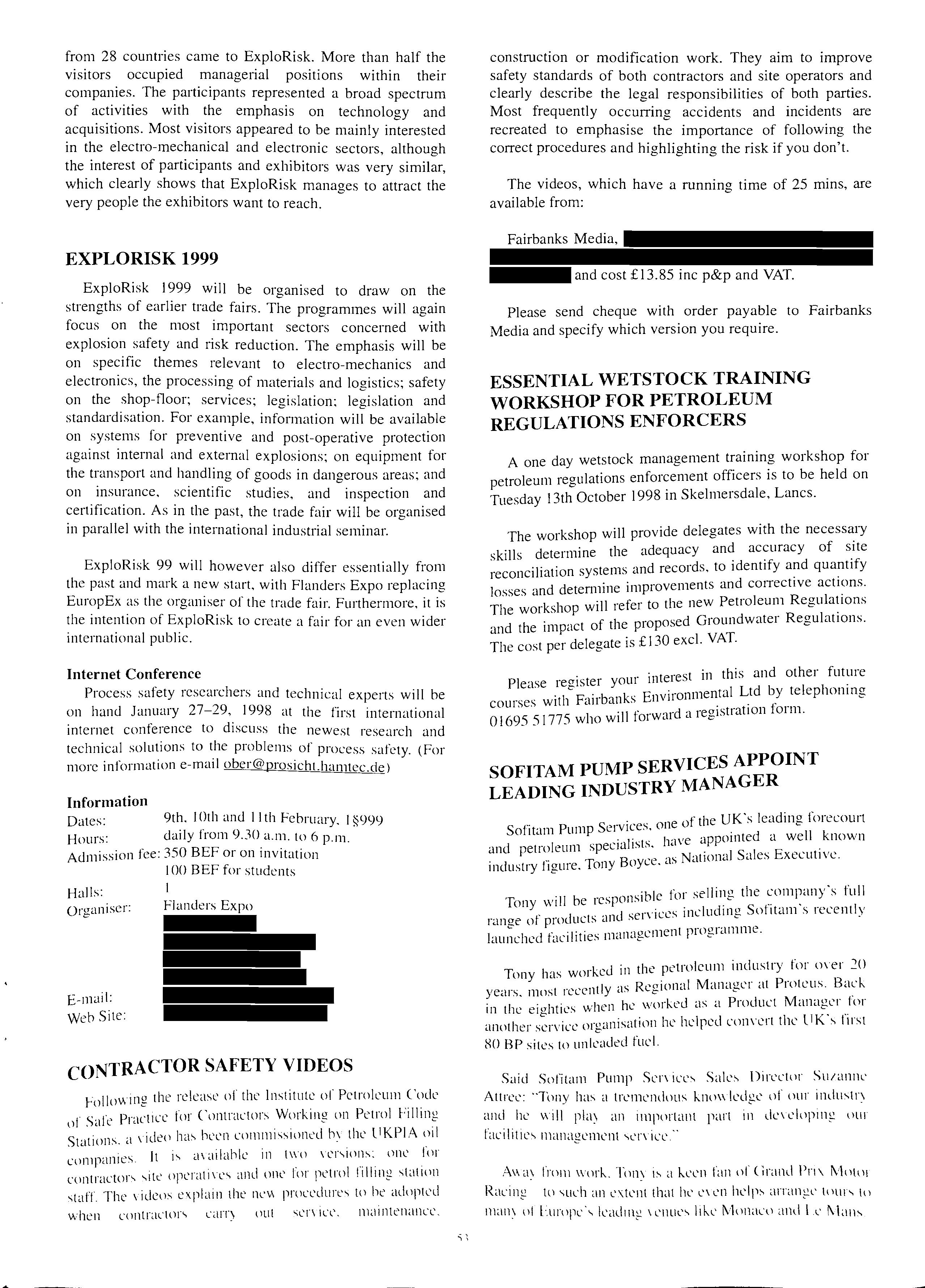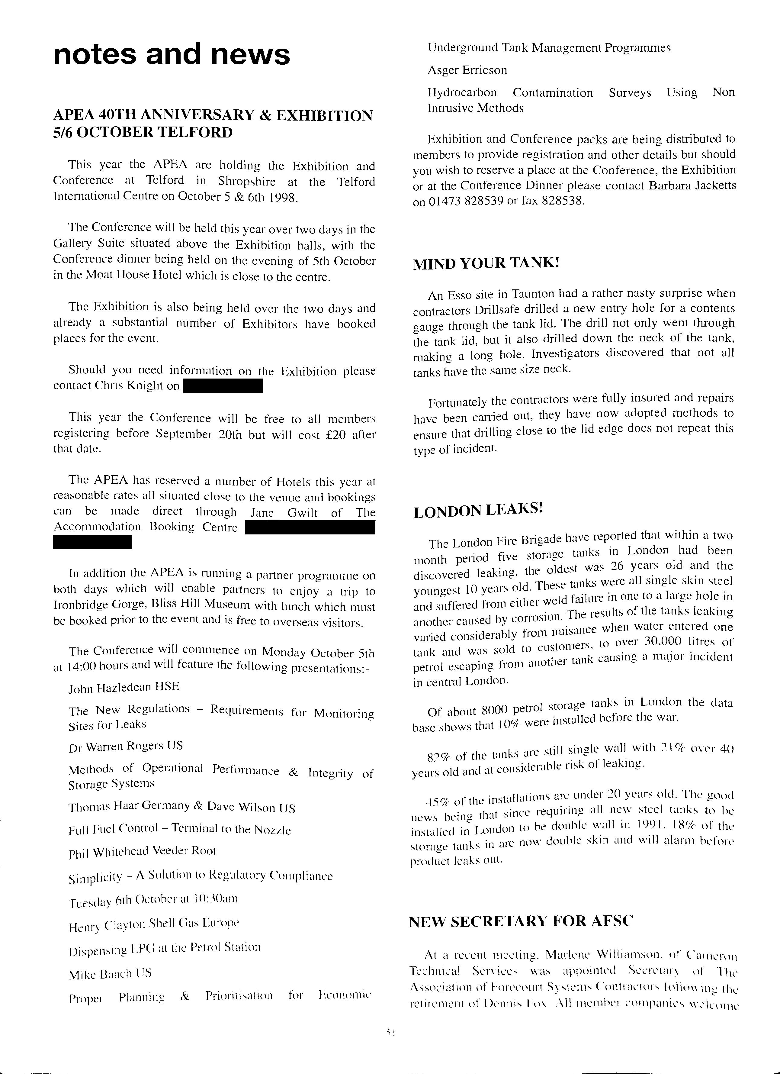 Environmental Engineering & Applied Science Extensive experience in undertaking specialist contaminated land remediation in the UK and Europe provides clients with tried and methods, applied by specialist staff , for dealing with polluted land and groundwater. • Site assessment on petroleum retail sites and industrial premises • Fully costed remedial design proposals • Execution of remedial works with minimum disruption • Confidential prompt and professional service SPECIALISTS IN CONTAMINATED LAND CONTRACTING Telluric Ltd, Meandros House, 54A Bute Street, Cardiff Bay , CF1 6AF Tel: 01222 303010 Fax: 01222 303011 • Forecourt & Commercial Pump Maintenance • Sole UK Approved Distributor of Beck Parts • Fuelling Equipment Stockists • Refurbished Equipment • New Forecourt Equipment Independent Pump Services Ltd • Pipework Installation • Tank Testing • Project Management SOFITAM Call us on (01273) 454831 Adur Boatyard, Old Shoreham Road, Shareham-by-Sea, West Sussex BN43 5TA. Tel: (01273) 454831 Fax: (01273) 464863