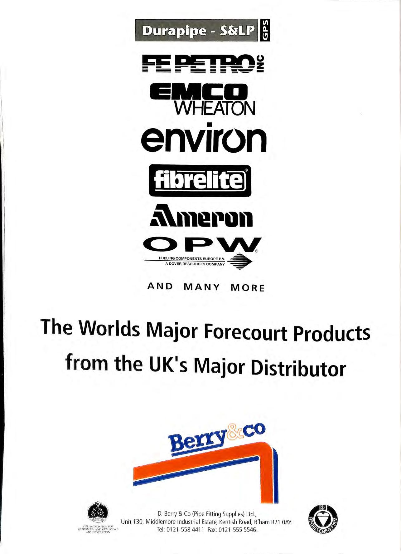 Durapipe - S&LP E ..CD WHEATON • environ I B; l lzj fttzjJ A\n1ea11on C>PWFUELING COMPONENTS EU ROPE B.VA DOVER RESOURCES COMPANY -="'" AND MANY MORE The Worlds Major Forecourt Products from the UK's Major Distributor D. Berry & Co (Pi pe Fi tting Sup pli es) Ltd., Un it 130, Midd lemore Industr ial Estate, l<ent ish Roa d, B' ham B2 1 OAY. Te l: 0121 558 44 11 Fa)<: 0121 555 5546. 0 . •