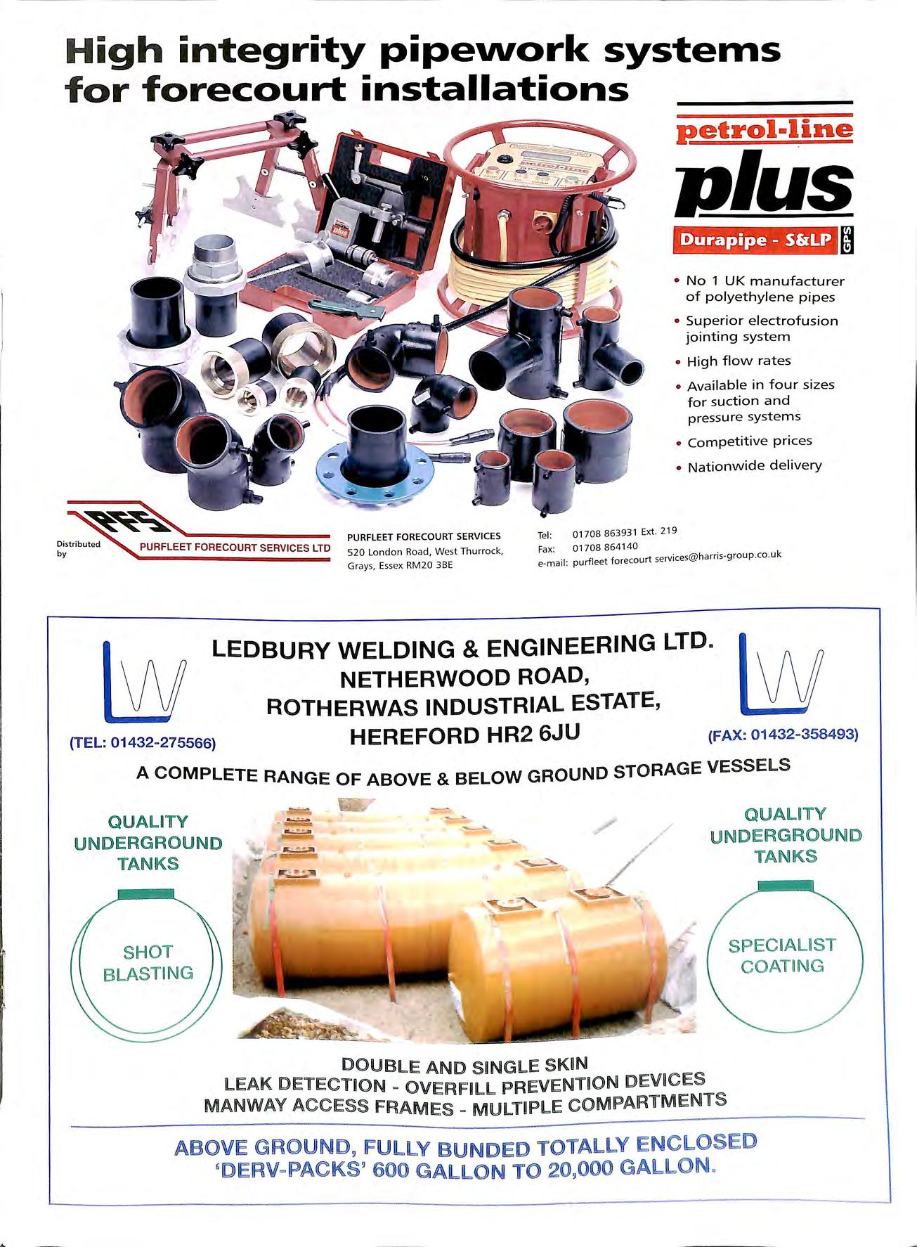 H igh integrity pipework systems for forecourt installations Di stributed by PURFLEET FORECOURT SERVICES LTD PURFLEET FORECOURT SERVICES 520 London Road, West Thurrock, Grays, Essex RM20 3B E )!etrol-line -alus '?urapipe S&LP • No 1 UK manufacturer of polyethylene pipes • Superior electrofusion jointing system • High flow rates • Available in four sizes for suction and pressure systems • Competitive prices • Nationwide delivery Tel: 01708 86393 1 Ext. 219 Fa x: 0 1708 864 140 e-mail: purfl eet forecourt services@ harris-group co uk lw LEDBURY WELDING & ENGINEERING LTD. lw NETHERWOOD ROAD, ROTHERWAS INDUSTRIAL ESTATE, (TEL : 01432 275566) HEREFORD HR2 6JU (FAX: 01 4 32-358493) A COMPLETE RANGE OF ABOVE & BELOW GROUND STORAGE VESSELS QUAUTY UNDERGROUND TANKS QllJAlffY UNIDIERGROUINlD TANIKS SPEC IALI ST COAT IN G DOUBLE AND SINGLE SKIN LEAK DETECTION - OVERFILL PREVENTION MANWAY A CC ESS FRAMES _ MULTIPLE C OMPARTMENTS ABOVE GROUND9 FULLY BLINDED TOTALLY ENCLOSE ilDERV=IPACK§ 9 600 GALLON TO 20 9 000 GA LON