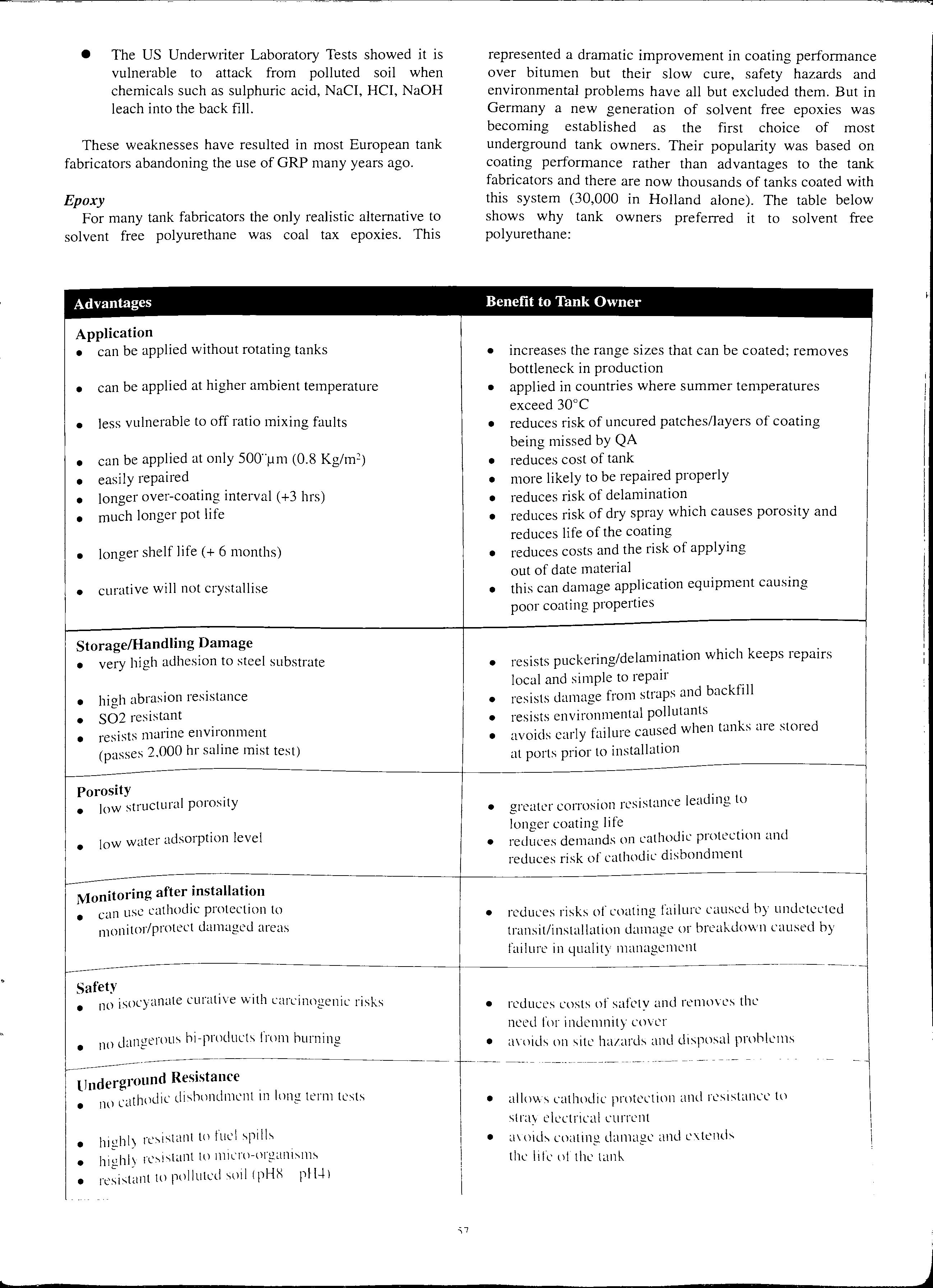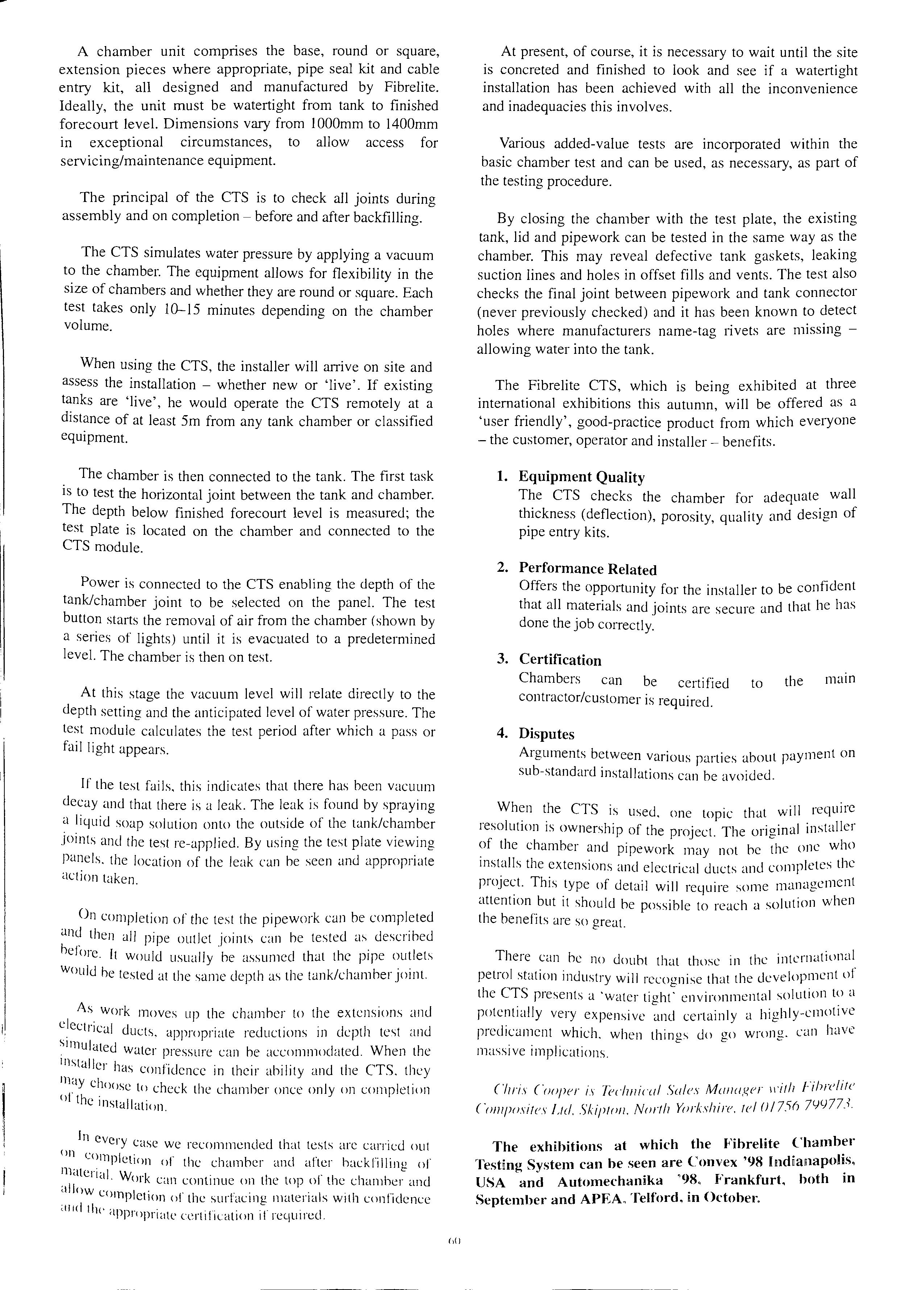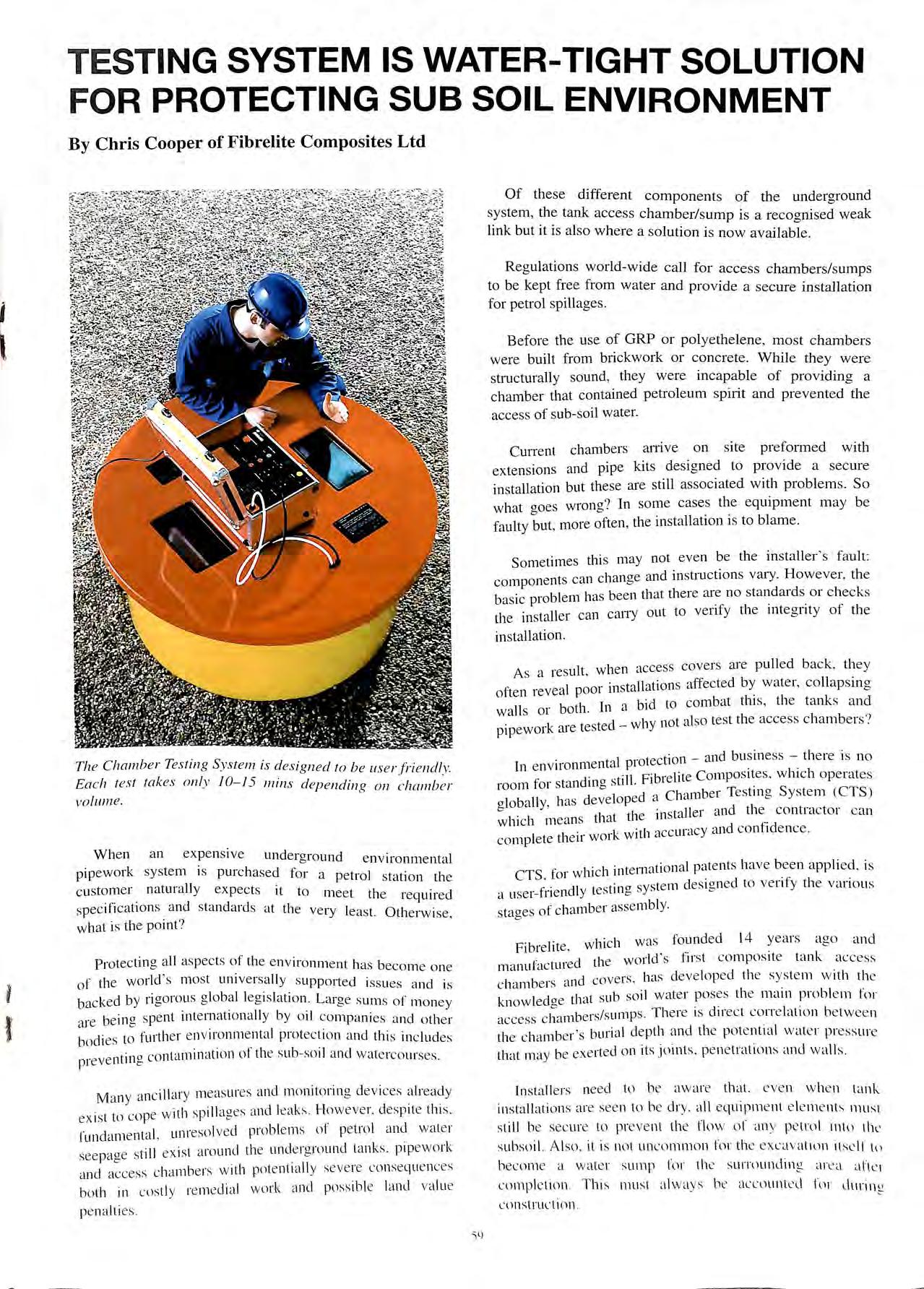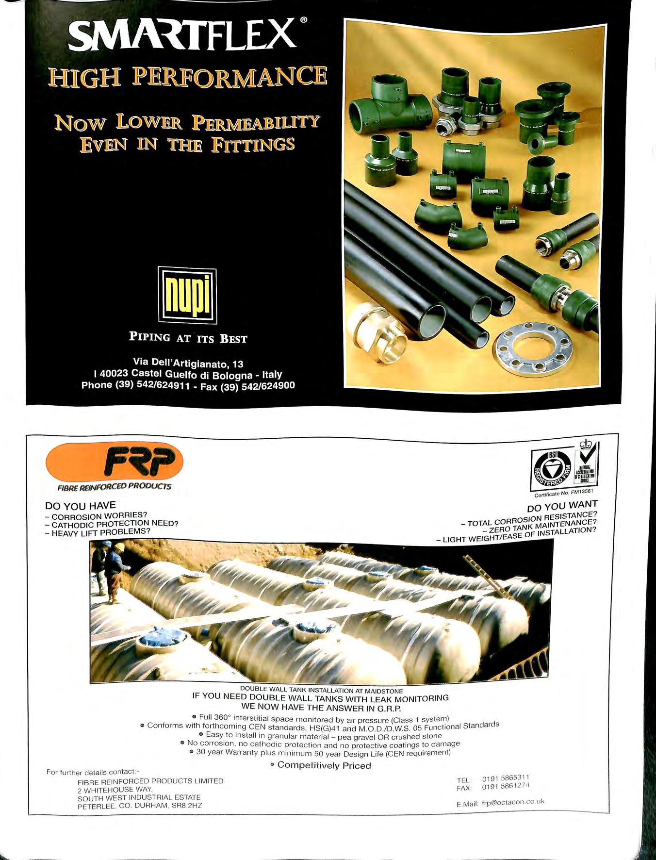For furthe r detail s con tact: Certifica te No FM 1356 1 oovouWANT RESISTANCE ? TOTAL ZERO TANOF INSTALLATION ? _ LIGHT WEIGHT/ EASE DOUBLE WALL TANK INSTALLATION AT MAIDSTONE IF YOU NEED DOUBLE WALL TANKS WITH LEAK MONITORING WE NOW HAVE THE ANSWER IN G.R.P • Full 36 0 ° interstitia l space monitored by air pressure (C lass 1 system) St dards • Conforms w ith forthco ming G EN standards , HS(G)41 and M.O.D ./D.W.S. 05 Fun c tion al an • Easy to install in granu lar material pea gravel OR crushed stone • No cor ros ion , no cathodi c protect ion a nd no protective coa ting s to damage e 3 0 yea r Warrnnty p lus minimum 50 yea r Design Life (CEN req uirement) ° Competitive ly Priced FIBR E RE INFORCED PRODUCTS LIMI TED 2 WH ITE HOUSE WAY TEL : FAX: 0191 5865311 019 1 5861 27 4 SOUTH WEST INDU STR IAL ESTATE PETERLE E CO DURHAM SR8 2HZ E Mai l: frp @oct acon. c o uk