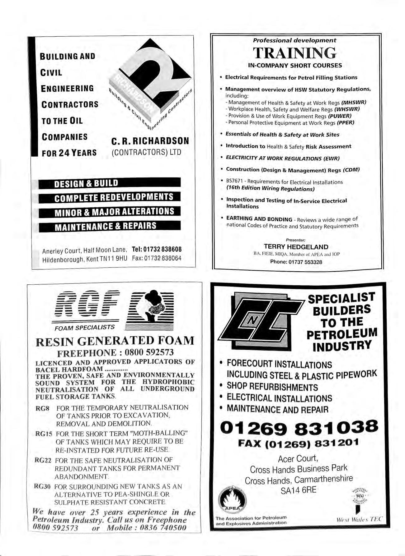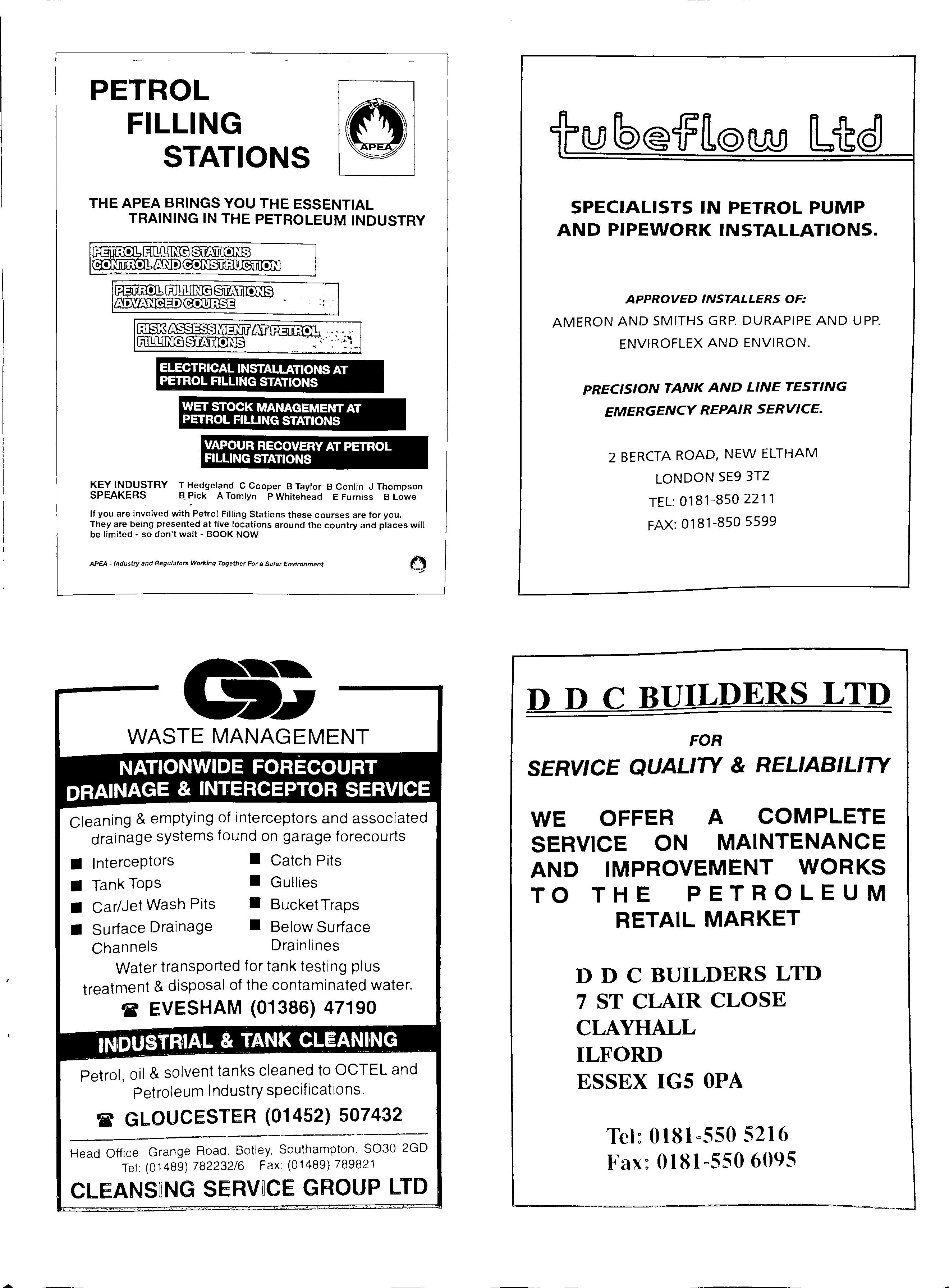 ..... PETROL FILLING STATIONS THE APEA BRINGS YOU THE ESSENTIAL TRAINING IN THE PETROLEUM INDUSTRY ELECTRICAL INSTALLATIONS AT PETROL FILLING STATIONS WET STOCK MANAGEMENT AT PETROL FILLING STATIONS VAPOUR RECOVERY AT PETROL FILLING STATIONS T Hedgeland C Cooper B Taylor B Conlin J Thompson B. A Tomlyn P Whitehead E Furniss B Lowe If you are with Petrol Filling Stations these courses are for you. They are being presented at five locations around the country and places will be hm1ted so don't wait BOOK NOW APEA • Industry and Regulatol?i Worlclng Together For a Safer Environment WASTE MANAGEMENT NATIONWIDE FORECOURT DRAINAGE & INTERCEPTOR SERVICE Cleaning & emptying of interceptors and associated drainage systems found on garage forecourts • Interceptors • Catch Pits • Tank Tops • Gullies • Car/Jet Wash Pits • BucketTraps • Surface Drainage • Below Surface Channels Drain lines Water transported for tank testing plus treatment & disposal of the contaminated water. if EVESHAM (01386) 47190 INDUSTRIAL & TANK CLl1!ANING Petrol, oil & solvent tanks cleaned to OCTEL and Petroleum Industry specifications. ir GLOUCESTER (01452) 507432 Head Office Grange Road, Batley, Southampton. 8030 2GD Tel (01489) 782232/6 Fax (01489) 789821 GROUP LTD SPECIALISTS IN PETROL PUMP AND PIPEWORK INSTALLATIONS . APPROVED INSTALLERS OF: AMERON AND SMITHS GRP. DURAPIPE AND UPP. ENVIROFLEX AND ENVIRON. PRECISION TANK AND LINE TESTING EMERGENCY REPAIR SERVICE. 2 BERCTA ROAD, NEW ELTHAM LONDON SE9 3TZ TEL: 0181-850 2211 FAX: 0181-850 5599 D DC BUILDERS LTD FOR SERVICE QUALITY & RELIABILITY WE OFFER A COMPLETE SERVICE ON MAINTENANCE AND IMPROVEMENT WORKS TO THE PETROLEUM RETAIL MARKET D D C BUILDERS LTD 7 ST CLAIR CLOSE CLAYHALL ILFORD ESSEX IGS OPA Tel: 018lg550 5216 Fax: 0181g550 6095