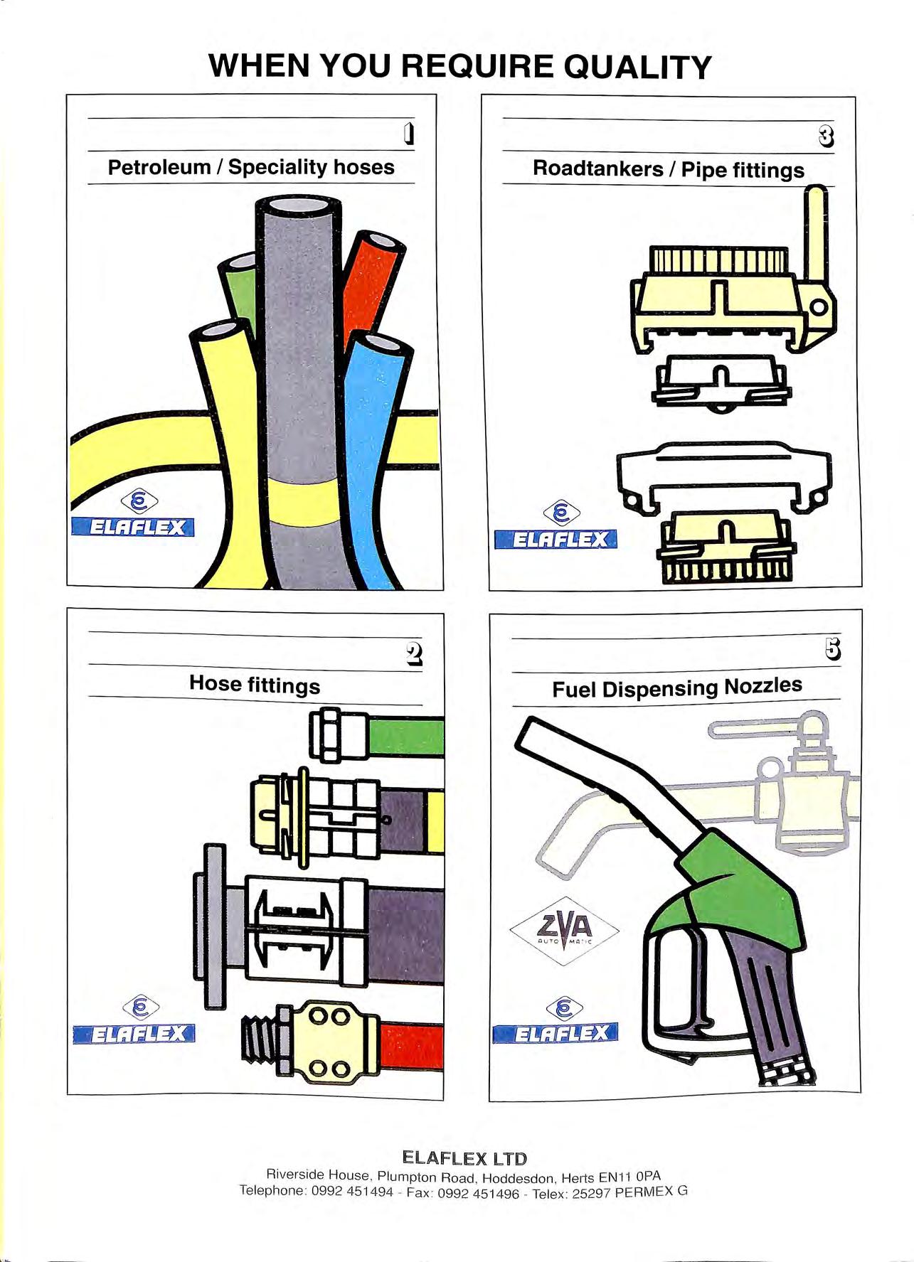 WHEN YOU REQUIRE QUALITY Petroleum I Speciality hoses Roadtankers I Pipe fittings Hose fittings Fuel Dispensing Nozzles ELAFLEX LTD Rivers ide Ho use , Plum pto n Ro ad , Hod d esdo n , He 1is EN11 OPA Te lep hone 0992 45 1494 Fax : 0 992 45 1496 Te lex : 25297 PE RMEX G