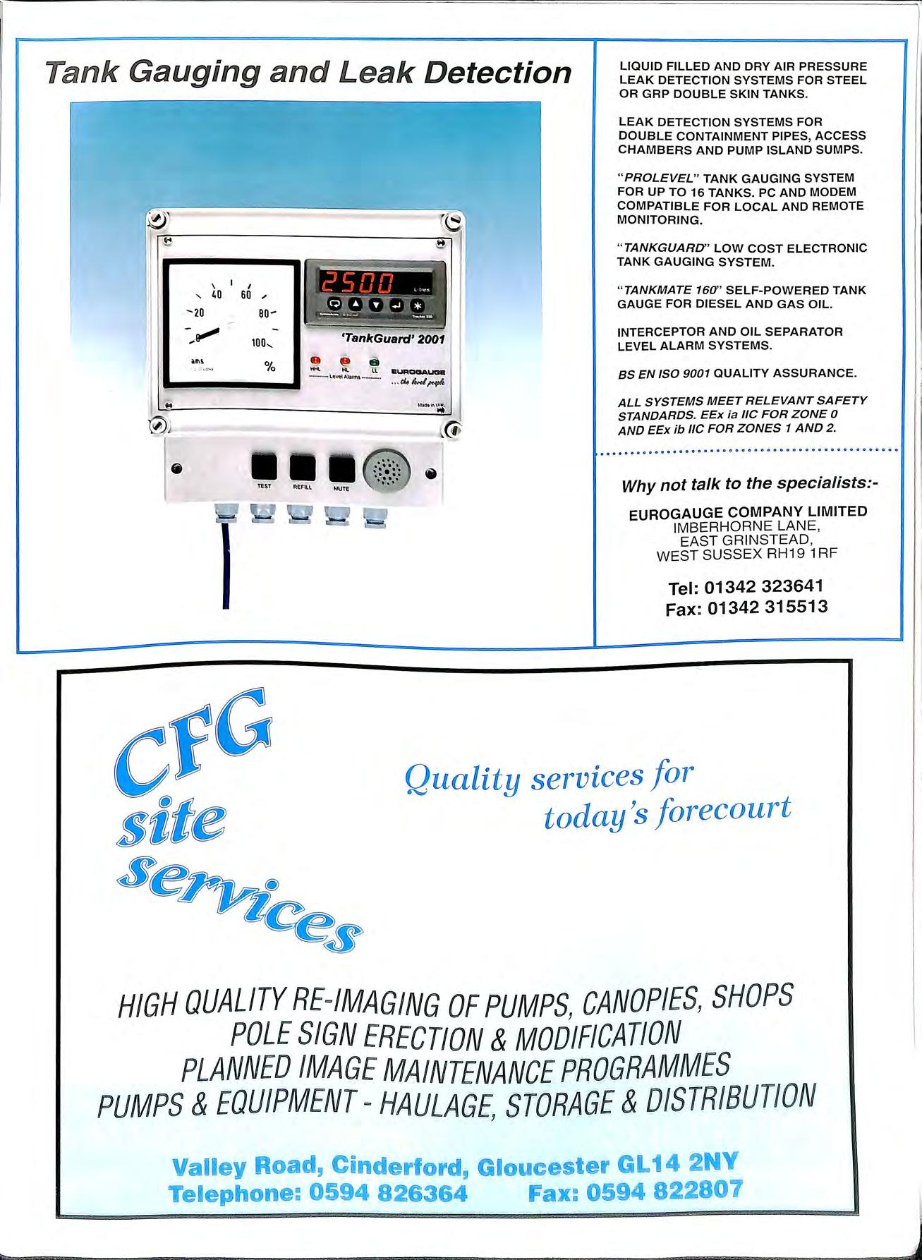 ALL SYSTEMS MEET RELEVANT SAFETY STANDARDS. EEx i a llC FOR ZONE 0 AND EEx ib l/C FOR ZONES 1 AND 2. • •• i TUT Why not talk to the specialists:EUROGAUGE COMPANY LIMITED IMBERHORNE LANE , EAST GRINSTEAD, WEST SUSSEX RH19 1 RF Tel : 01342 32364 1 Fax : 01342 3155 13 Quality services for today's forecourt HIGH QUALITY RE=IMAGING OF PUMPS, CANOPIES, SHOPS POLE SIGN ERECTION & MODIFICATION PLANNED IMAGE MAINTENANCE PROGRAMMES PUMPS &EQUIPMENT =HAULAGE STORAGE &DISTRIBUTION ' Valley Road, Cinderford, Gloucester GL 14 2NY Telephone: 0594 826364 Fax: 0594 822807 J