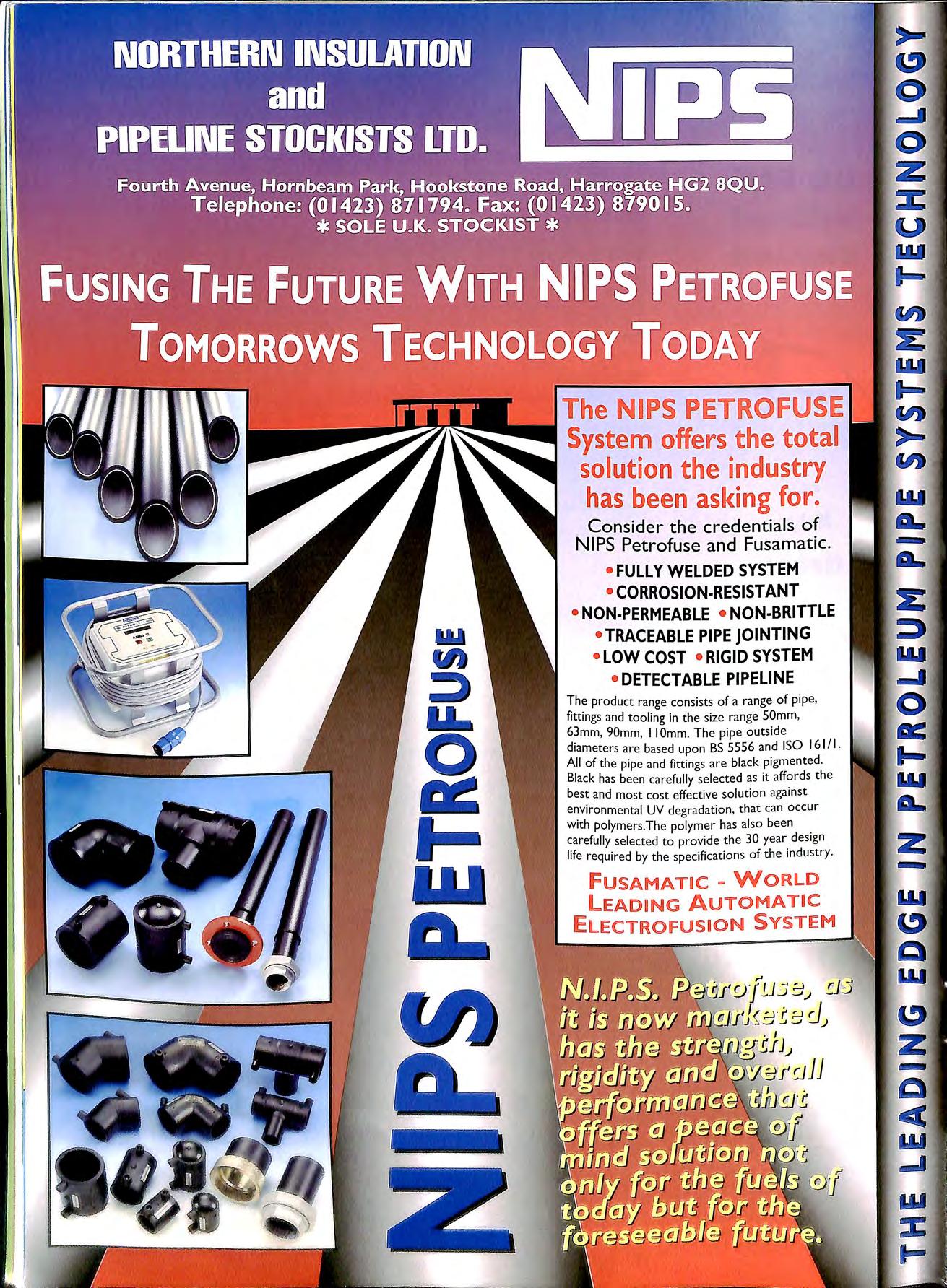 The NIPS PETROFUSE System offers the total solution the industry has been asking for. Consider the credentials of NIPS Petrofuse and Fusamatic. • FULLY WELDED SYSTEM • CORROSION-RESISTANT • NON-PERMEABLE • NON-BRITTLE • TRACEABLE PIPE JOINTING • LOW COST • RIGID SYSTEM • DETECTABLE PIPELINE The product range consists of a range of pipe, fittings and tooling in the size range 50mm, 63mm, 90mm, I IOmm The pipe outside diameters are based upon BS 5556 and ISO 161 I I All of the pipe and fittings are black pigmented Black has be en carefully selected as it affords the best and most cost effective solution against environmental UV degradation, that can occu r with polymers.The polymer has also been carefully selected to provide the 30 year design life required by the specifications of the industry FUSAMATIC WORLD LEAD ING AUTOMATIC SYSTEM >" 0 _, 0 z :c u IU ..... "' E: IU .... "' >"' IU L