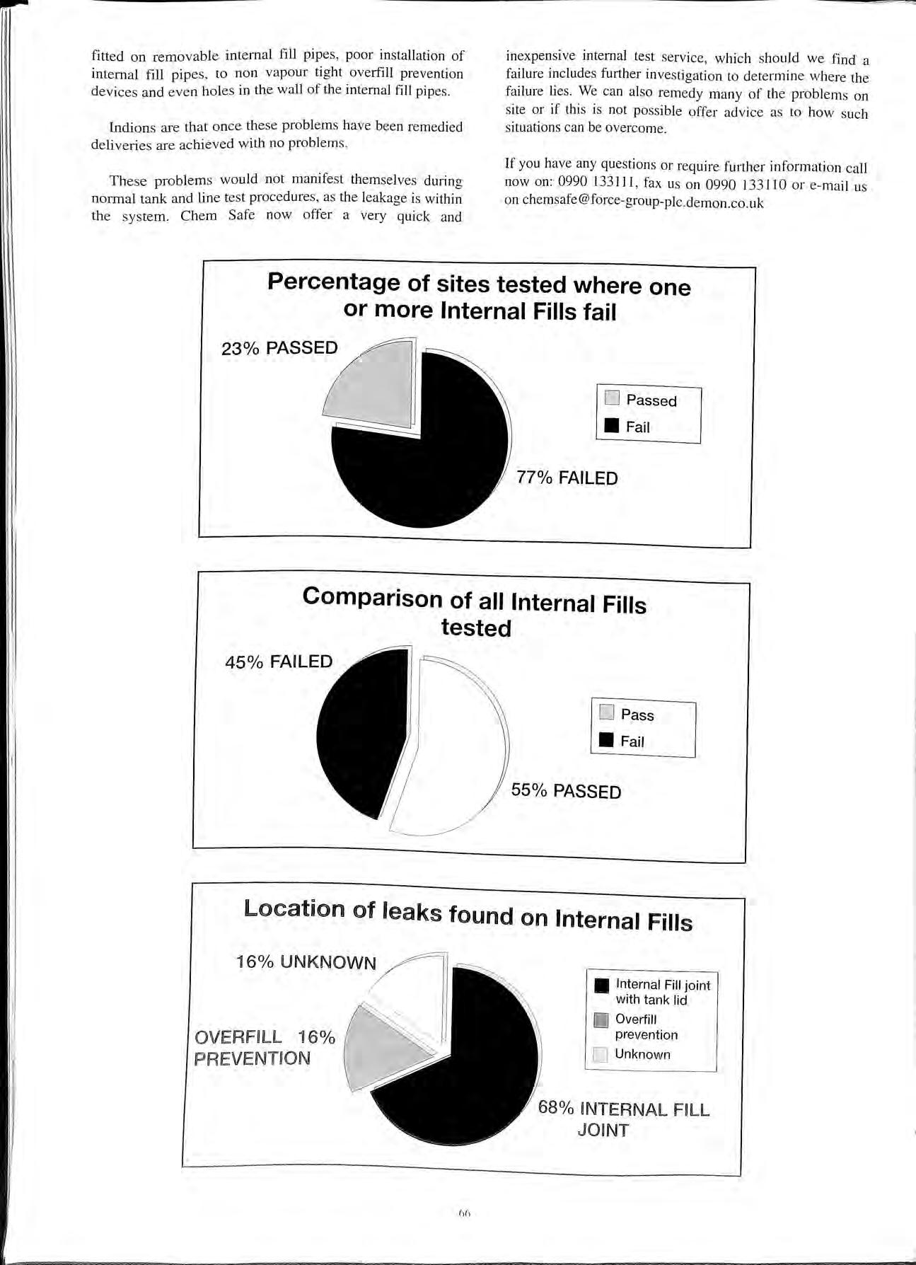 The results we achieved seemed not only to confirm our theory but were also quite incredible. Out of the thirteen sites tested only one site passed, having leak free internal fill pipes and therefore so called 'liquid seals', the other twelve sites had tanks that failed our test, these tanks had leaking internal fill pipes and therefore these tanks had no liquid seals. (See Charts)