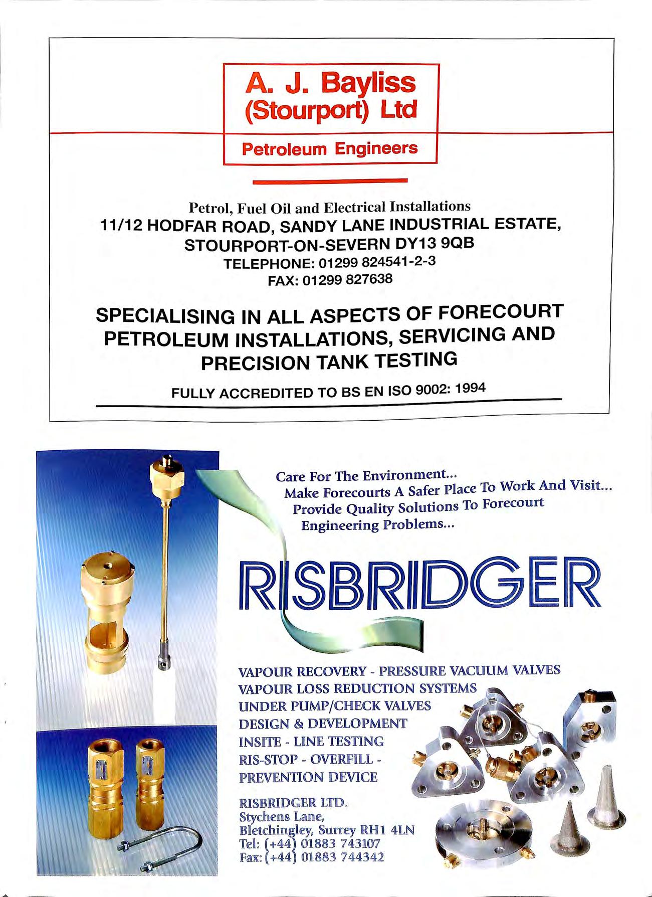 A. J. Bayliss (Stourport) Ltd Petroleum Engineers Petrol, Fuel Oil and Electrical Installations 11/12 HODFAR ROAD, SANDY LANE INDUSTRIAL ESTATE, STOURPORT-ON-SEVERN DY13 908 TELEPHONE: 01299 824541-2-3 FAX: 01299 827638 SPECIALISING IN ALL ASPECTS OF FORECOURT PETROLEUM INSTALLATIONS, SERVICING AND PRECISION TANK TESTING FULLY ACCREDITED TO BS EN ISO 9002: 1994 Car e For The Environment Make Forecourts A Safer Pl ace To Work And Vi s it... Provide Quality Solutions To Foreco urt Engineering Problems ... rRI SBrRllDGlErR VAPOUR RECOVERY PRESSURE VACUUM VALVES VAP OUR LOSS REDUCTION SYSTEMS U N DER PUMP/ CHECK VALVES DESIGN & DEVELOPMENT I NSITE LINE TESTING RIS STOP OVERFILL PREVENTION DEVICE RISBRIDGER LID Stydlen.s Lane, Surrey RHl 4LN Tel : (+44 m.883 743107 lFax: ( +44 1())1883 744342