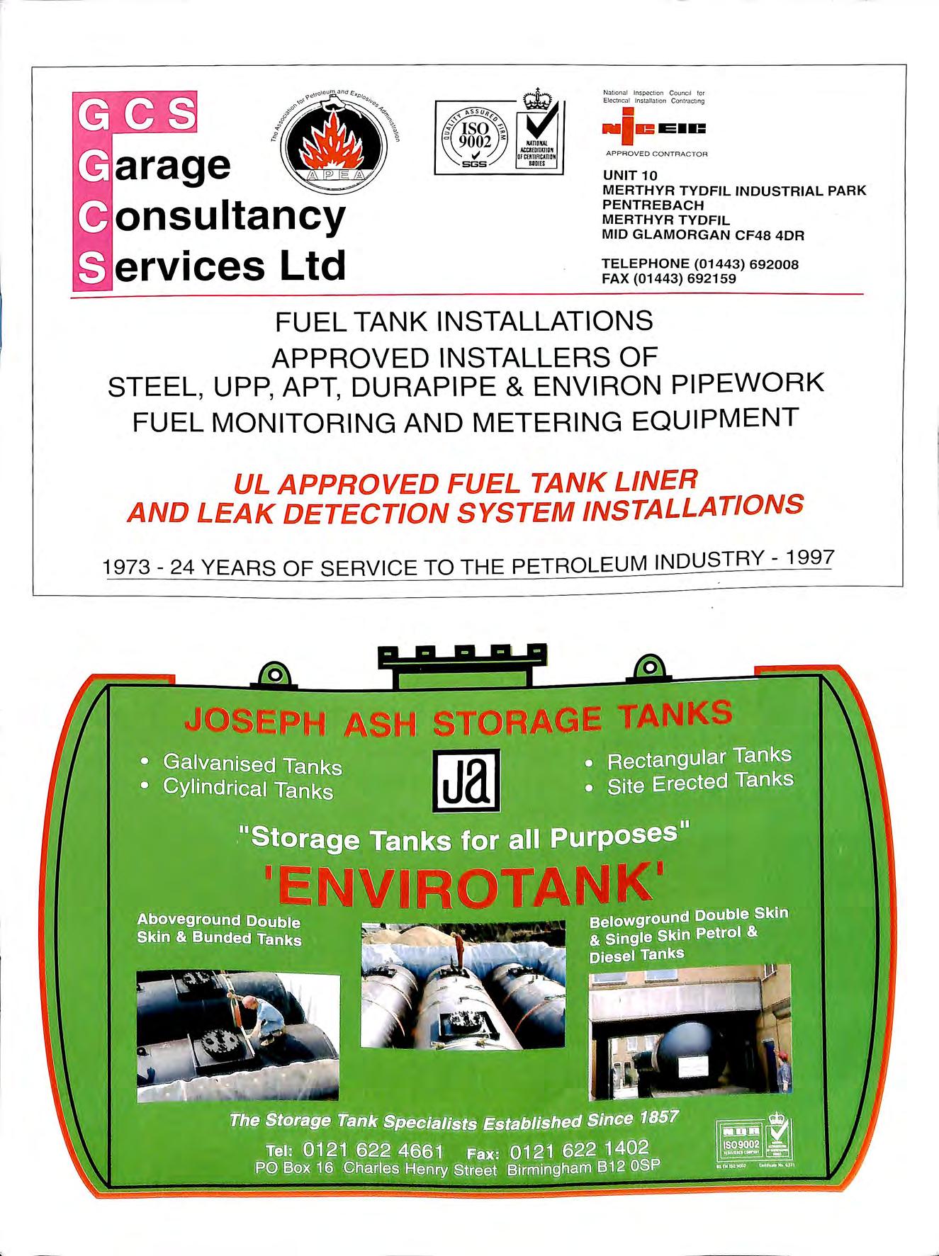 a rage onsultancy ervices Ltd Natronal Jnspeclion Council for Electncal lnslallat1on Contracting • •le E•C APPROVED CONT RAC TO R UNIT 10 MERTHYR TYDFIL INDUSTRIAL PARK PENTREBACH MERTHYR TYDFIL MID GLAMORGAN CF48 4DR TELEPHONE (01443) 692008 FAX (01443) 692159 FUEL TANK INSTALLATIONS APPROVED INSTALLERS OF STEEL , UPP, APT, DURAPIPE & ENVIRON PIPEWORK FUEL MONITORING AND METERING EQUIPMENT UL APPROVED FUEL TANK LINER AND LEAK DETECTION SYSTEM INSTALLATIONS 1973 - 24 YEARS OF SERVICE TO THE PETROLEUM INDUSTRY 1997 0 0 J