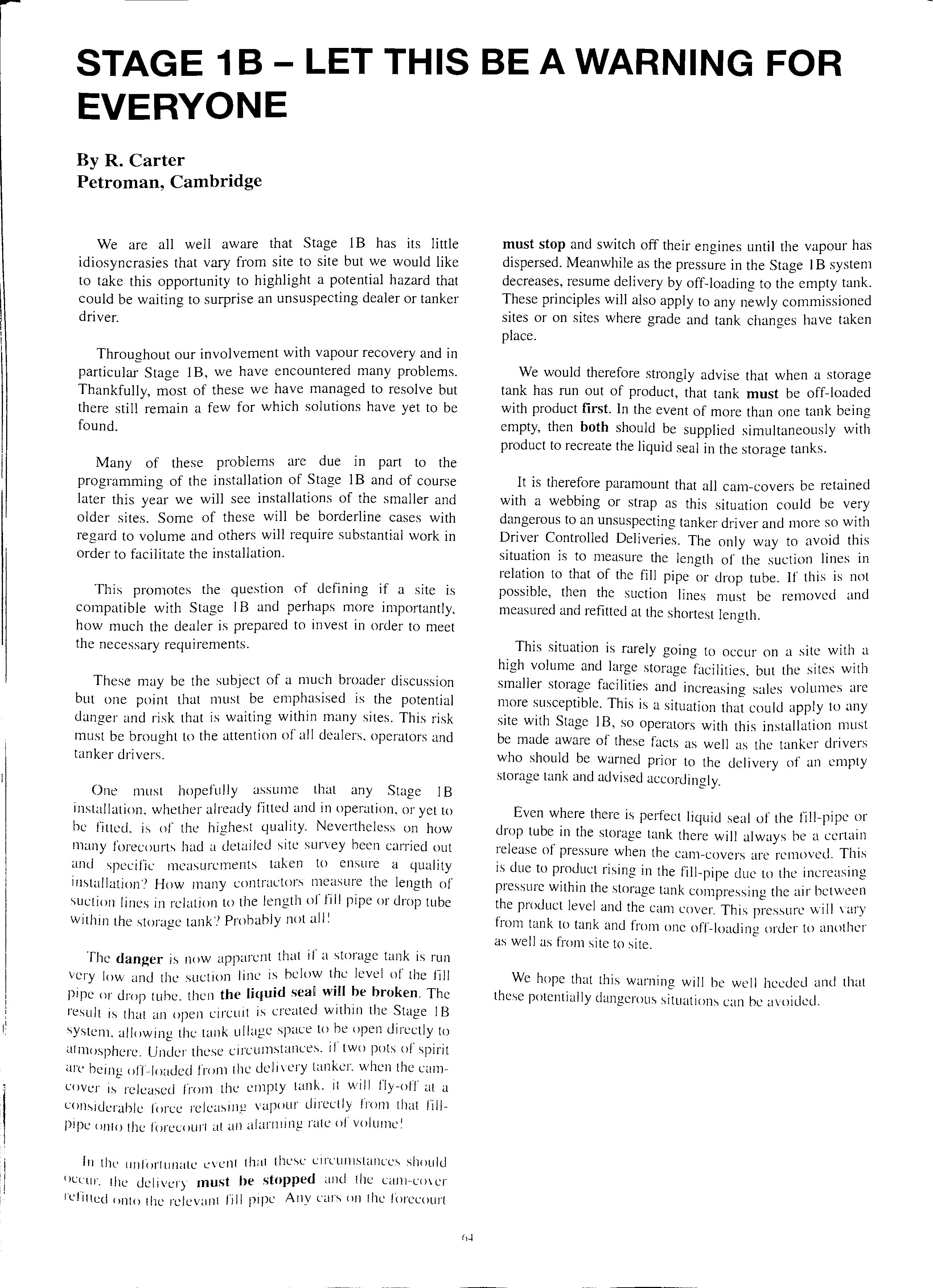 This situation is rarely going to occur on a site with a high volume and large storage facilities, but the sites with smaller storage facilities and increasing sales volumes are more susceptible. This is a situation that could apply to any site with Stage 1B, so operators with this installation must be made aware of these facts as well as the tanker drivers who should be warned prior to the delivery of an empty storage tank and advised accordingly.